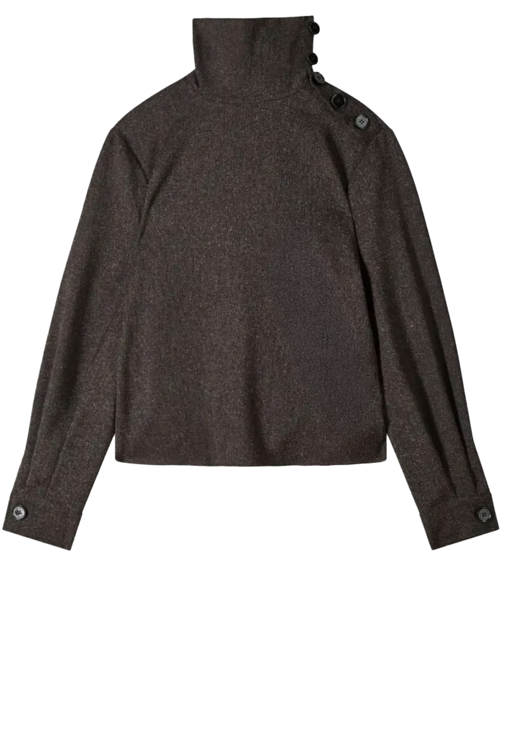 Langarm-Bluse aus strukturiertem Stoff mit texturiertem Effekt für eine moderne Haptik. Dekorative Knöpfe folgen dem weichen Kragen entlang der Schulter. Kombiniere ihn mit Shorts oder passenden Palazzo-Hosen und Square Boots für einen Glam-Rock Look.