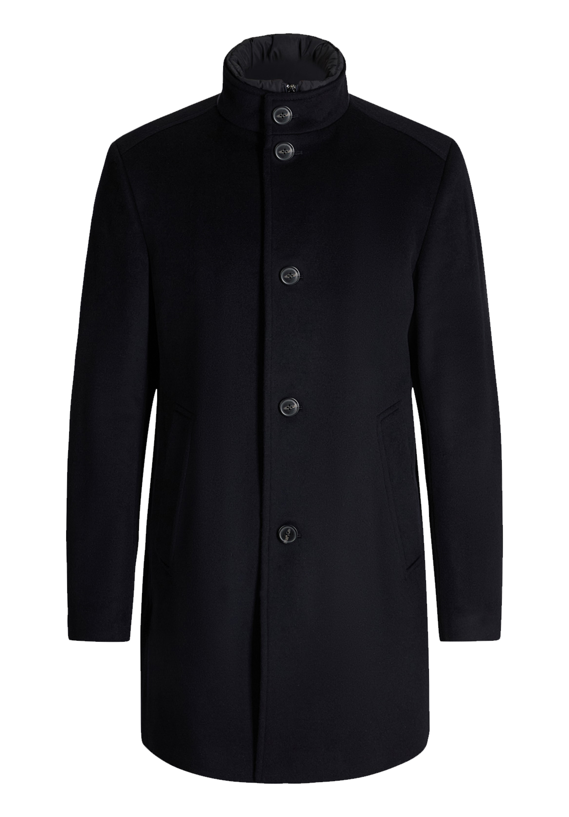 Der Mantel Maico von JOOP! im Regular Fit vereint klassische Eleganz mit durchdachter Funktionalität. Mit Stehkragen, durchgehender Knopfleiste und langen Ärmeln bietet er zeitlosen Stil, während seitliche Taschen, fließendes Futter und ein rückseitiger Bewegungsschlitz Komfort und Bewegungsfreiheit gewährleisten.