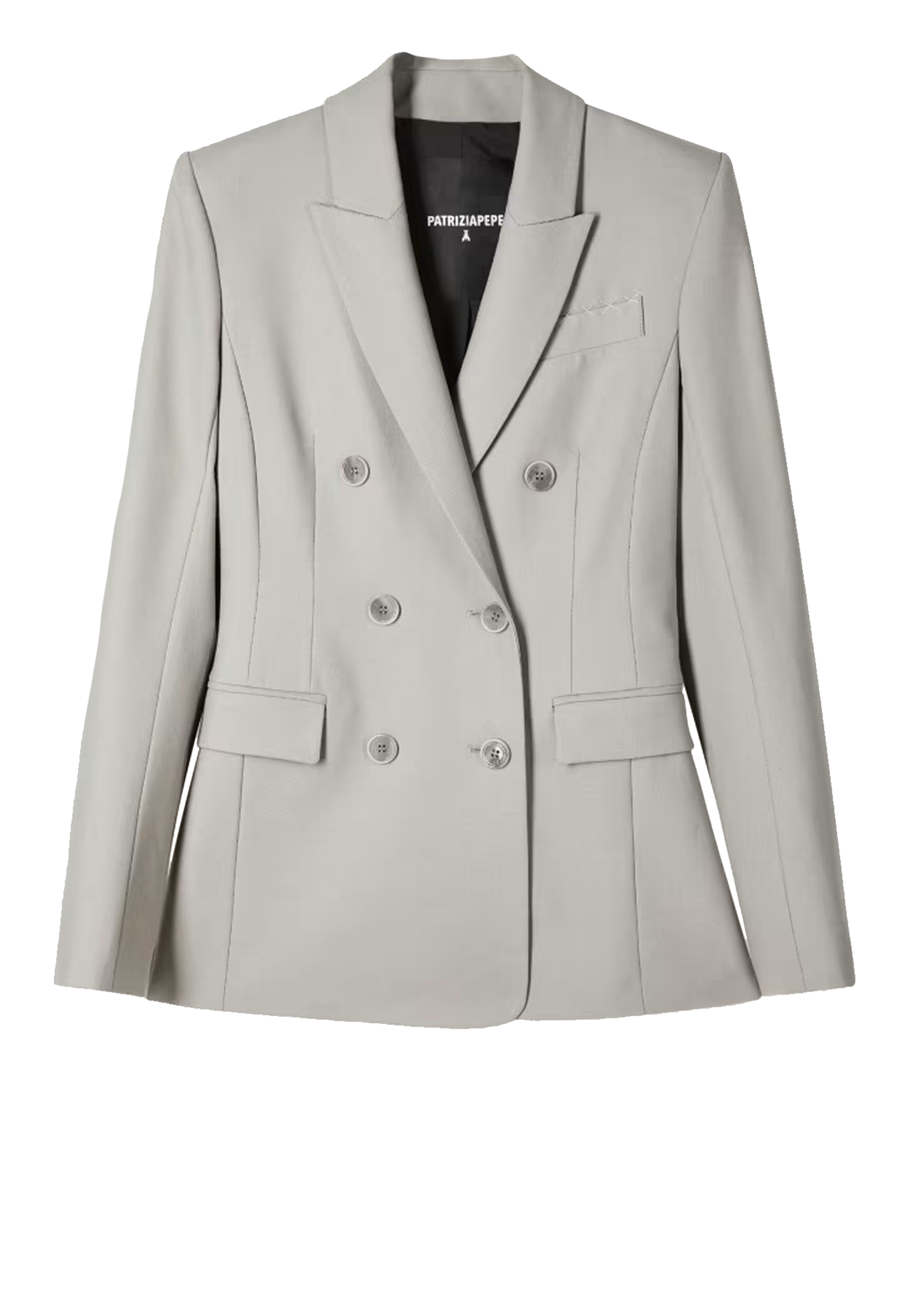 Der zweireihige Blazer von PATRIZIA PEPE präsentiert sich aus edler Gabardine aus Stretch-Wolle in einer normalen, leicht taillierten Passform. Er besticht durch einen Spitzkragen mit Revers und normale Ärmel mit Schlitzen, veredelt durch Metallknöpfe mit quadratischem Design. Eine Tailored-Steppnaht auf der Brusttasche unterstreicht das präzise, elegante Design.