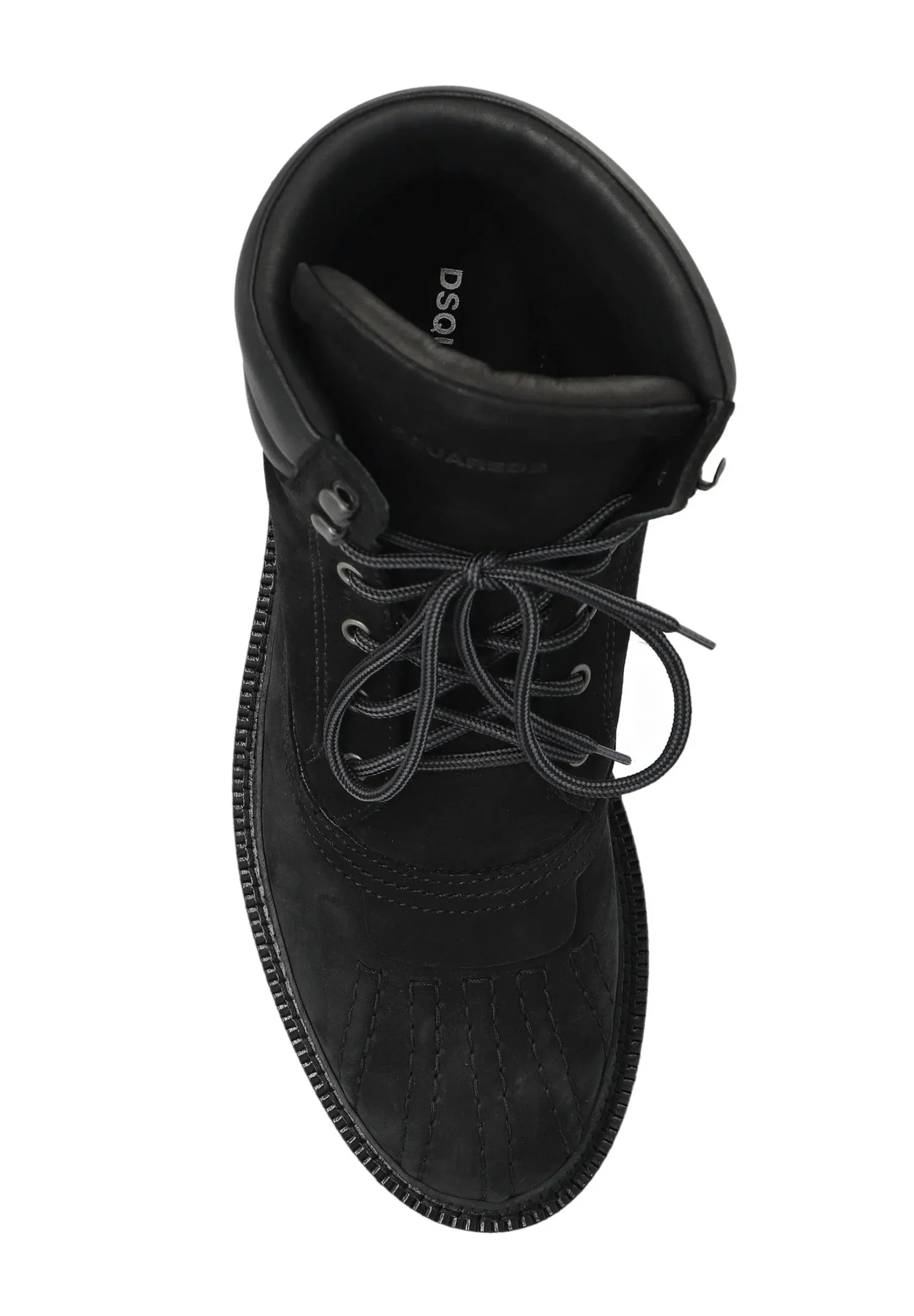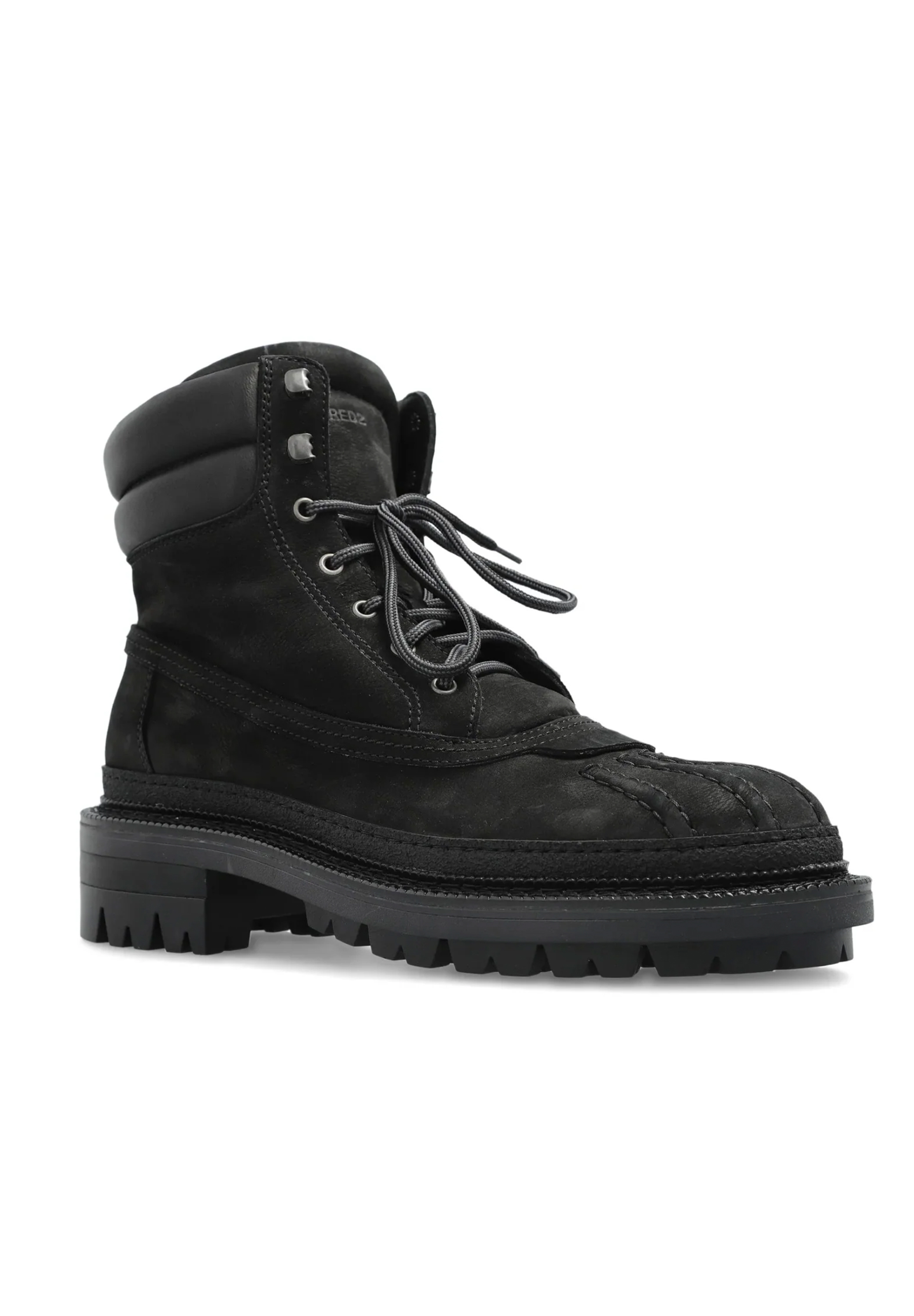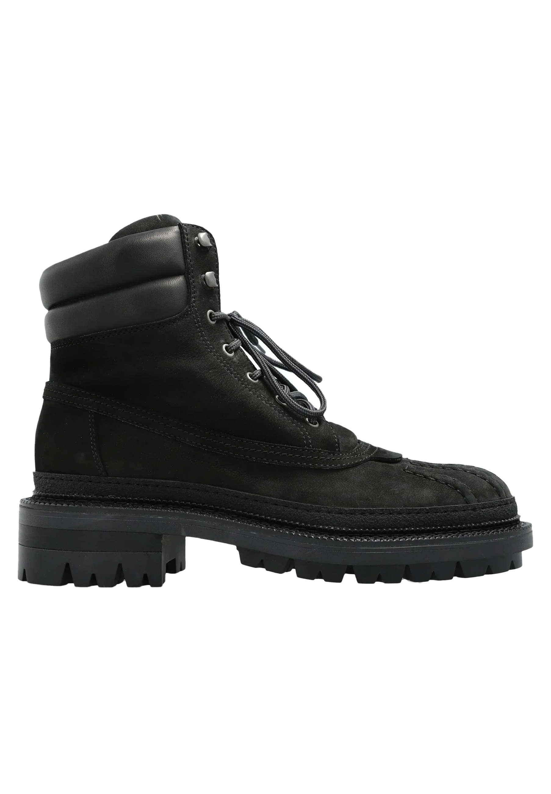 Schnürsenkel im Wanderstil, eine griffige Sohle und ein gepolsterter Kragen: Die robusten Lederstiefel trotzen den Elementen trotzen, ohne in Sachen Stil Kompromisse einzugehen. Kombinieren Sie sie je nach Anlass mit Jeans oder einer Hose im Military-Stil.