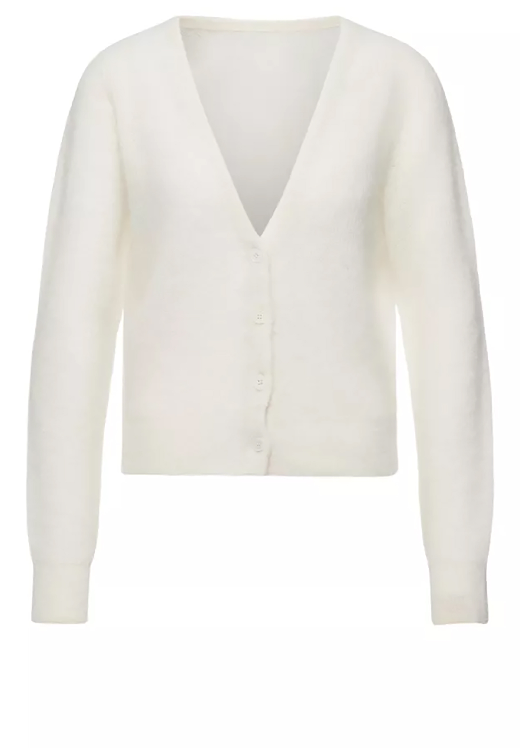 Eine schmal geschnittene Strickjacke mit tiefem V-Ausschnitt. Wenn man die Knopfleiste am Rücken trägt, ist sie auch als Pullover tragbar. Die Knopfleiste betont das klassische Design.