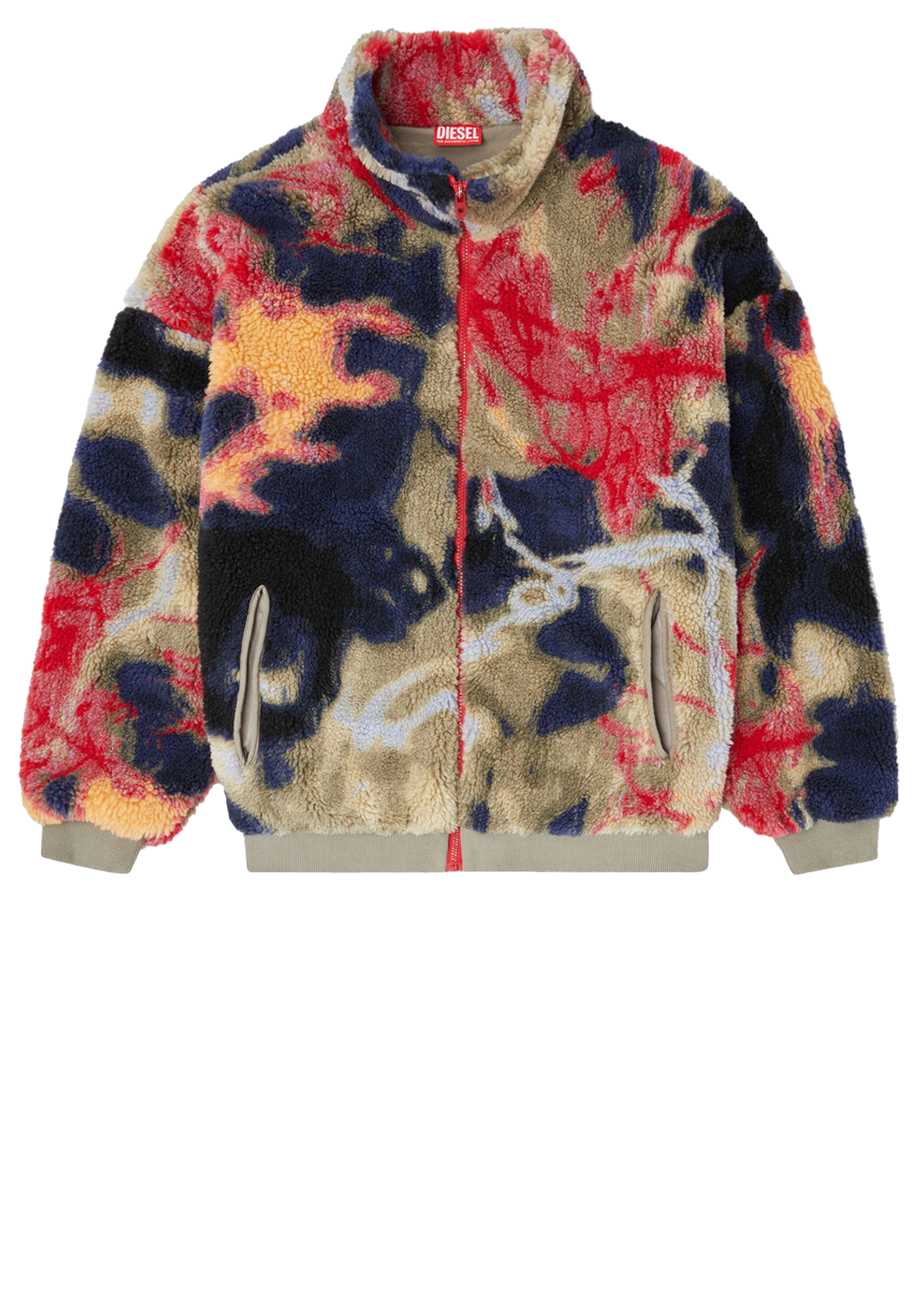 Street-Style, in Komfort gehüllt. Diese Herren-Teddyjacke besteht aus flauschigem Jacquard-Fleece, belebt mit farbenfrohen, von Graffiti inspirierten Kunstwerken. Die Silhouette ist einfach und leger, umrahmt von den gerippten Abschlüssen am hohen Kragen. Ein gefüttertes Innenleben sorgt für eine glatte Passform.