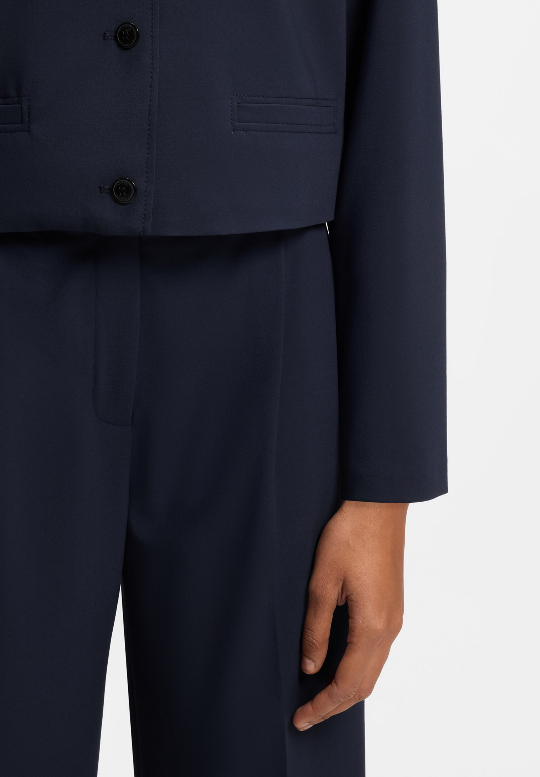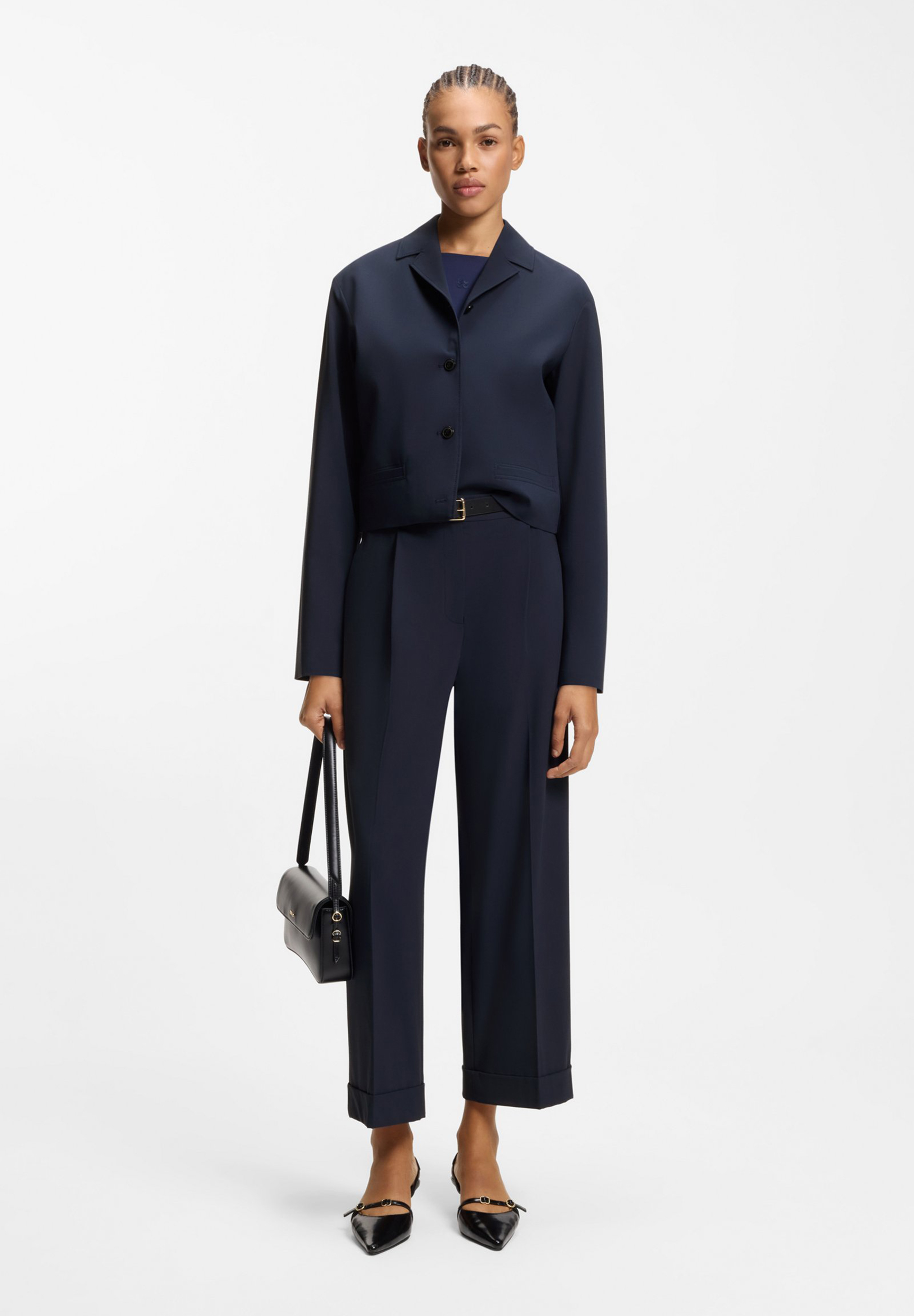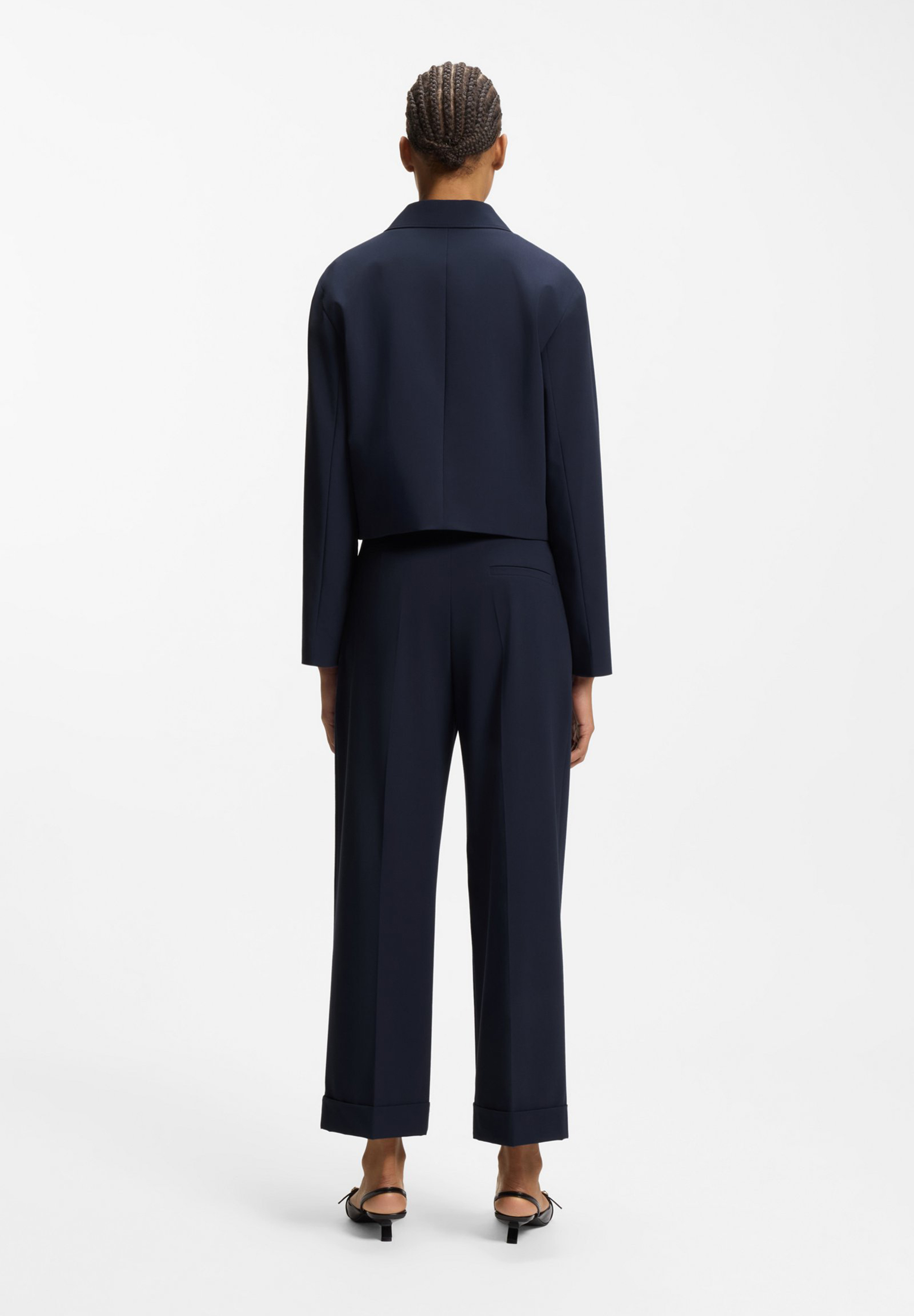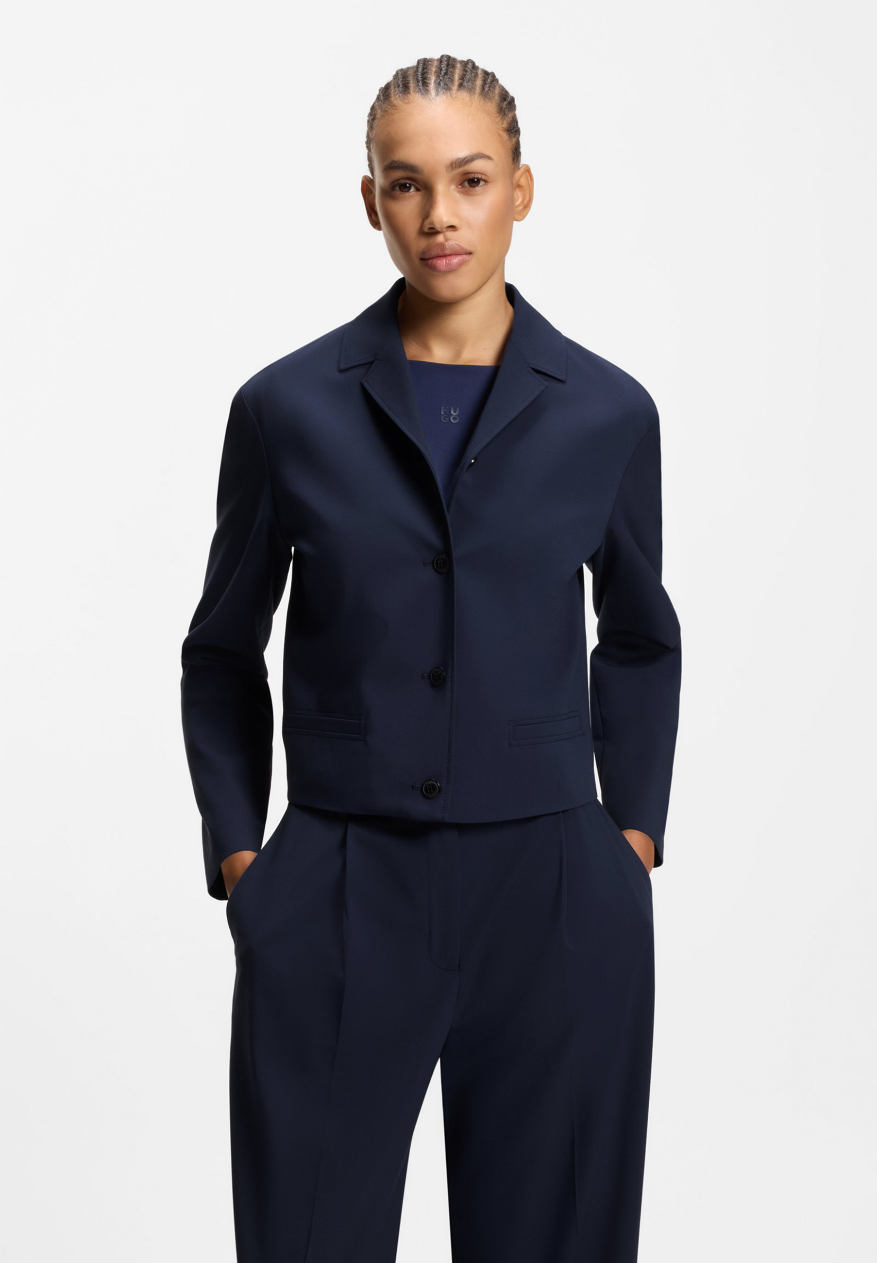 Injizieren Sie den von der Herrenmode inspirierten Stil in jeden Look mit der kurz geschnittenen, geraden Passform dieses HUGO Womenswear Blazers. Kurze Revers. Melange Stoff mit zusätzlichem Stretch.