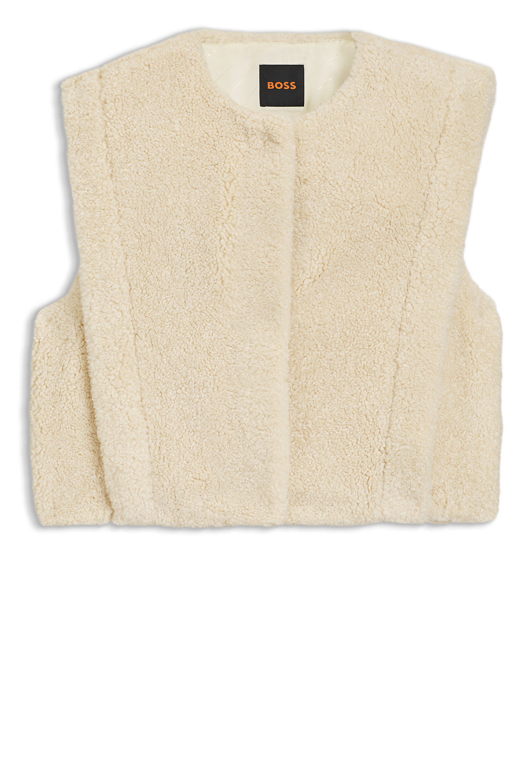 Die BOSS Weste aus kuscheligem Teddy-Gewebe, mit verdecktem Verschluss und kragenlosem Design ist eine schicke Option für drinnen und draußen