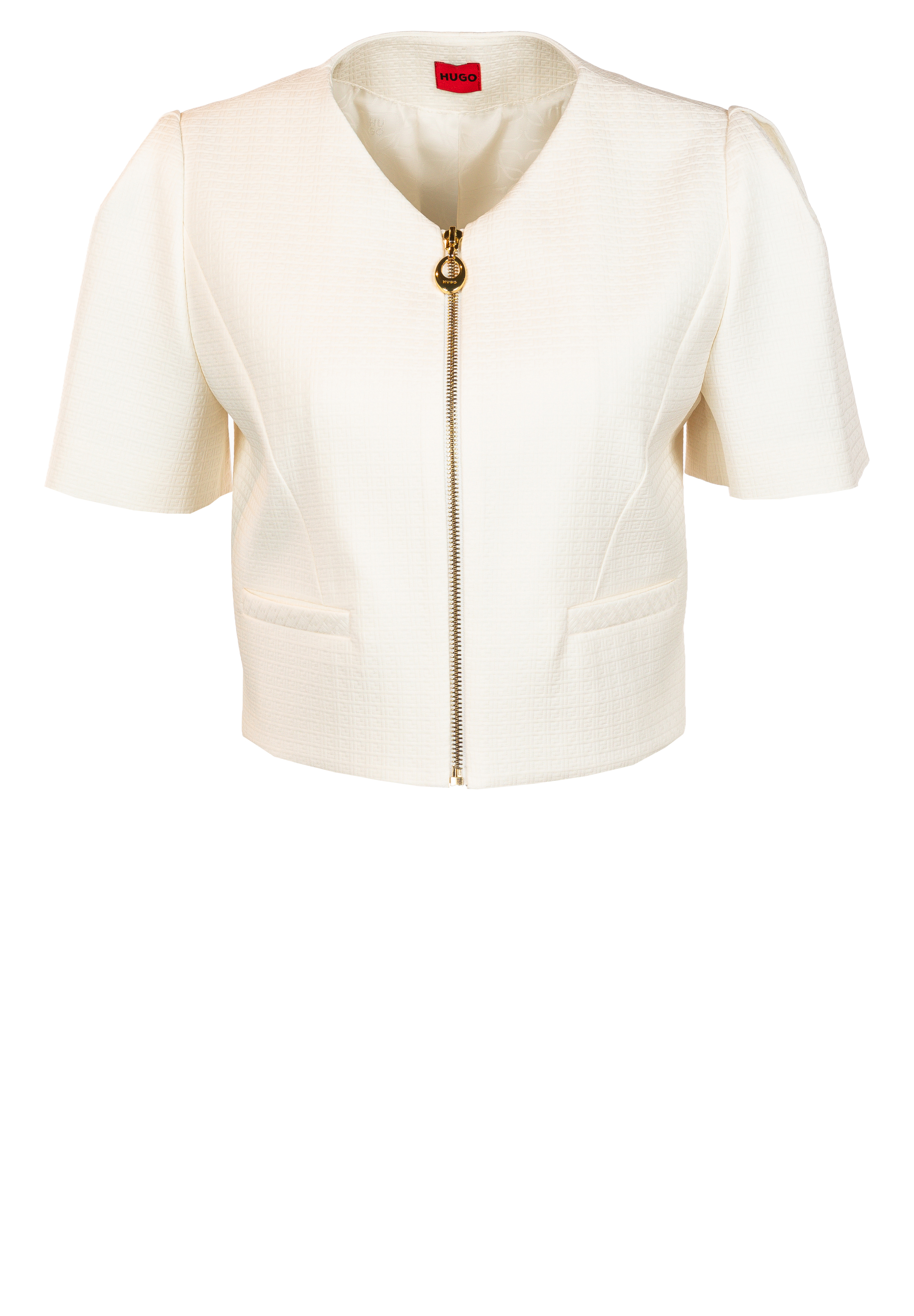 Kurzärmeliger Blazer Ambelle von HUGO im Regular Fit, kurz geschnitten und kragenlos. Mit Reißverschluss, Paspeltaschen vorn und Innenfutter.