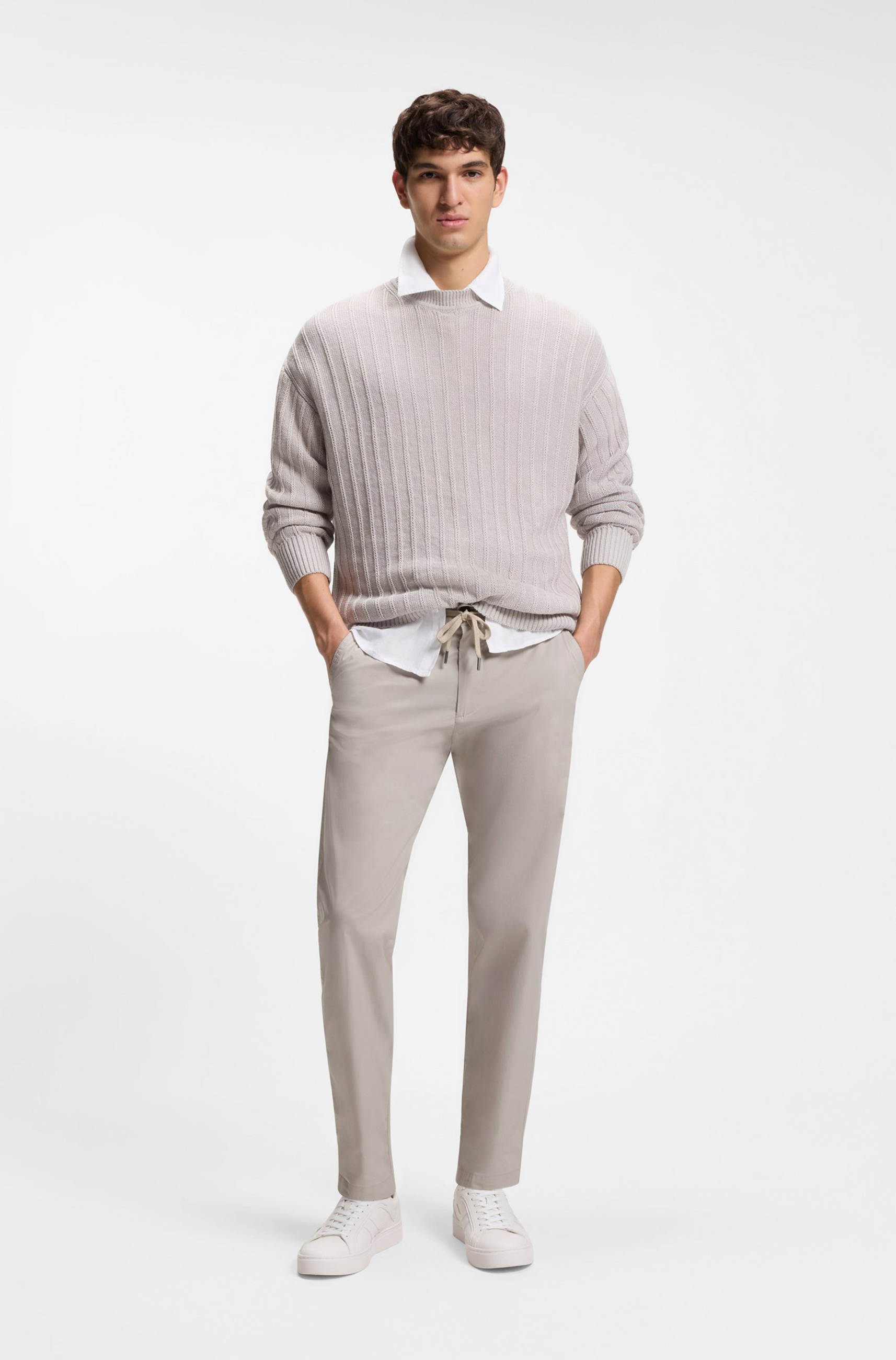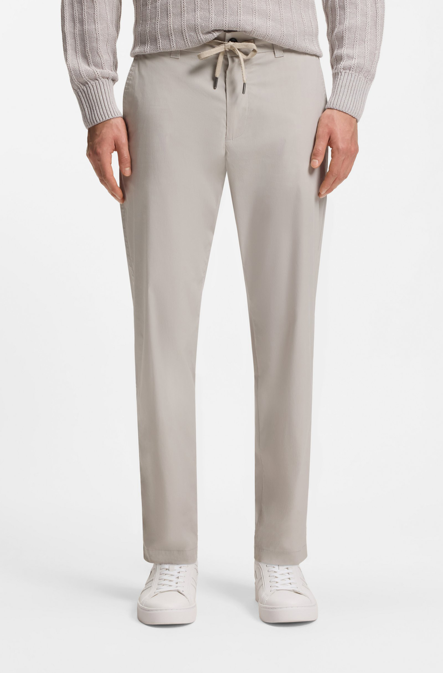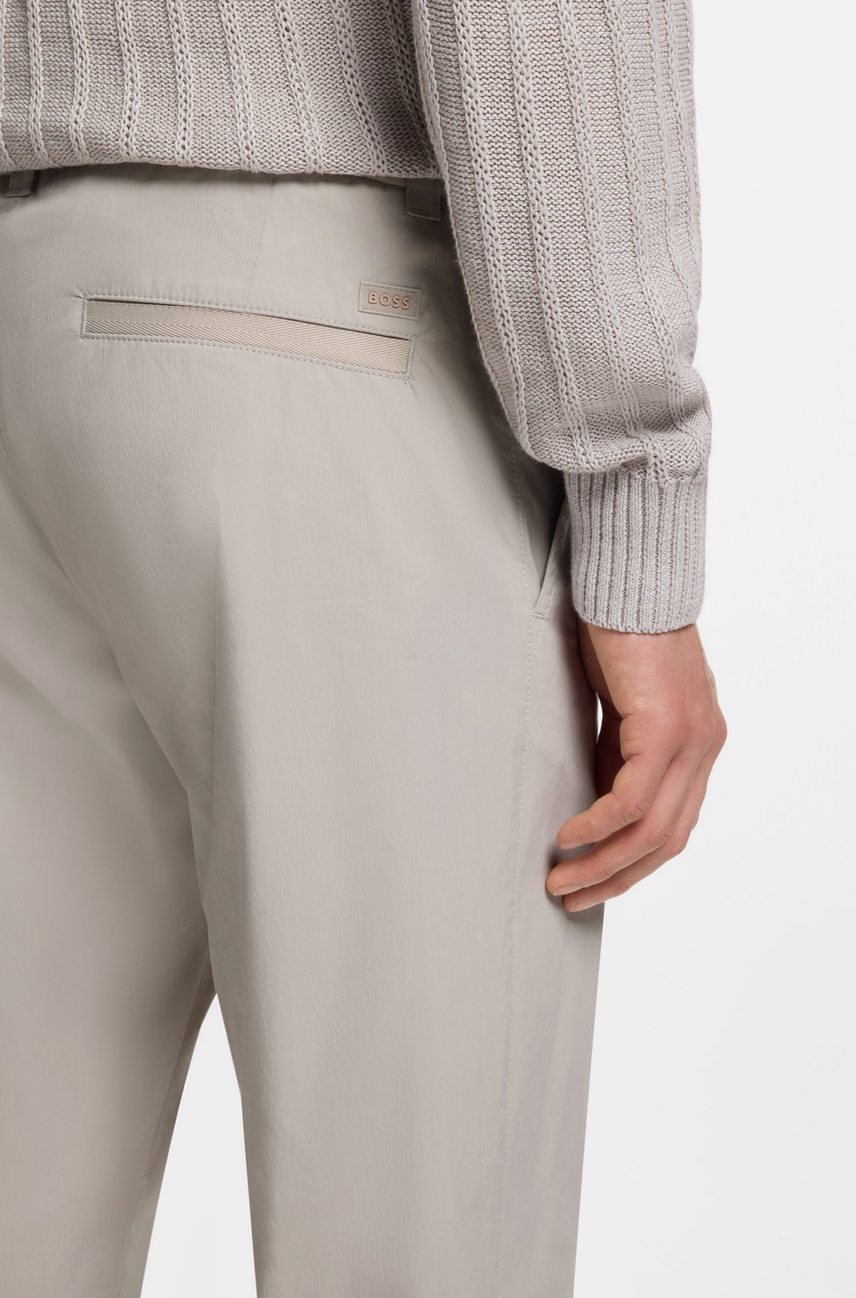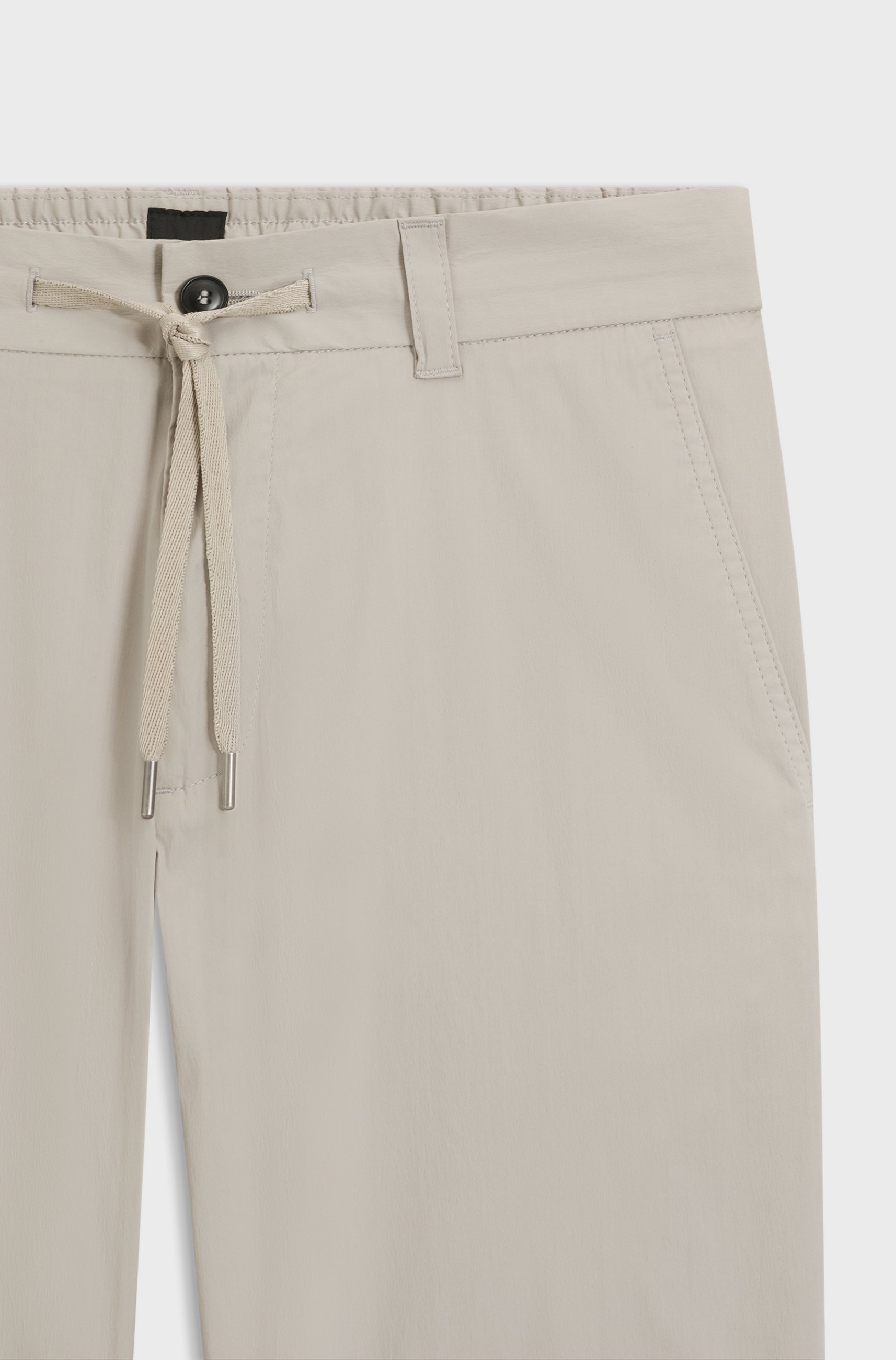 Gerade geschnittene BOSS Chino mit konischem Beinverlauf, aus baumwollreicher Popeline gefertigt. Komfortabler Bund. Taschen mit Fischgrätband eingefasst.