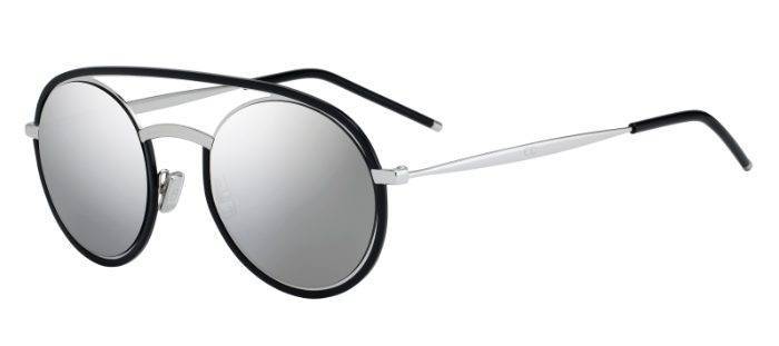 Die verspiegelten Gläser sind rund und durch einen gewölbten Doppelsteg verbunden. Der Steg trägt die markante Narbe von Dior Homme. Die Bügel sind aus Metall gefertigt. Die Gläser bieten 100 % UV-Schutz.