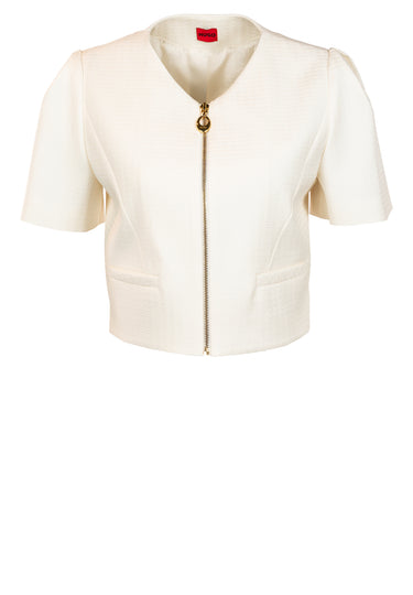 Kurzärmeliger Blazer Ambelle von HUGO im Regular Fit, kurz geschnitten und kragenlos. Mit Reißverschluss, Paspeltaschen vorn und Innenfutter.