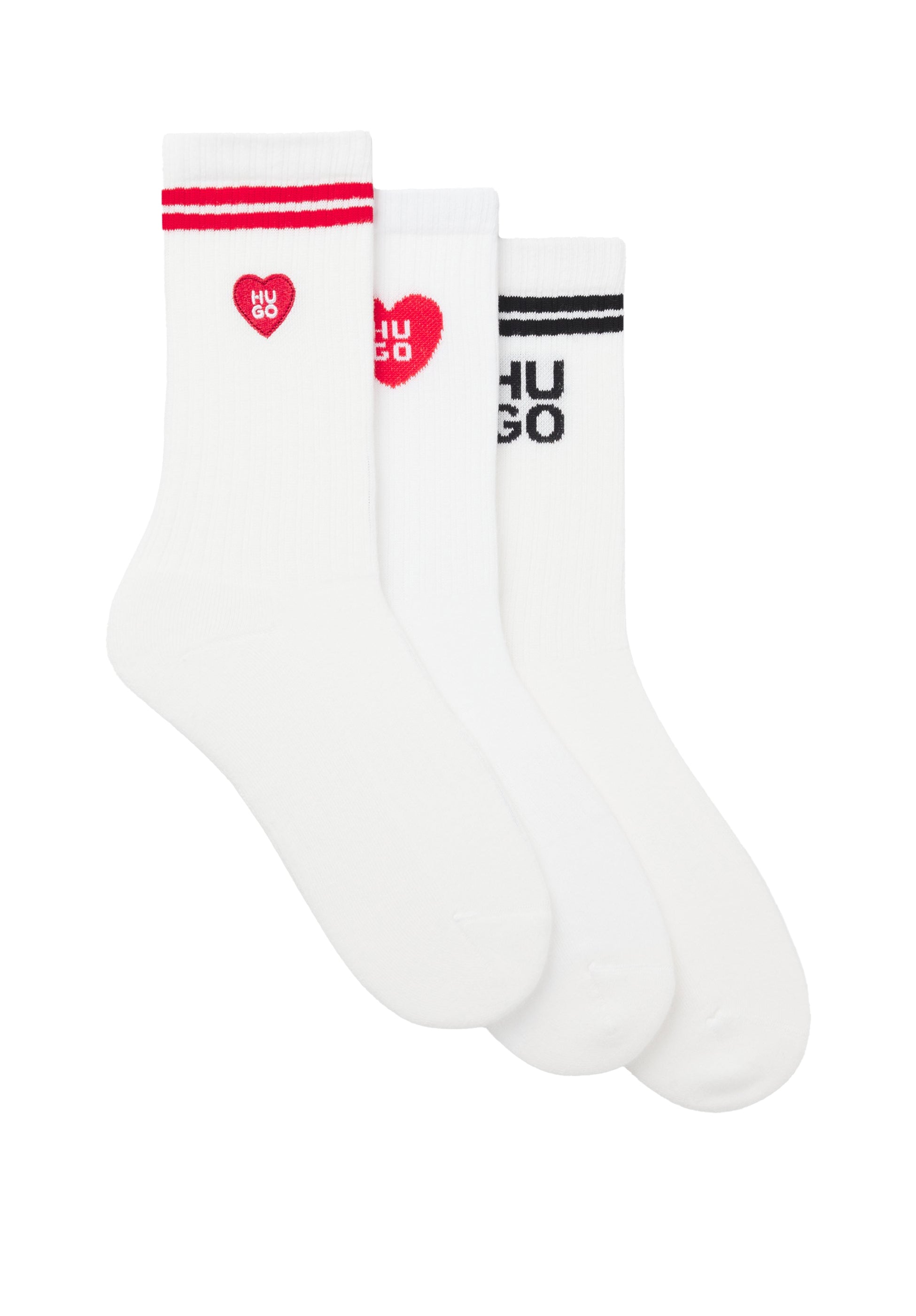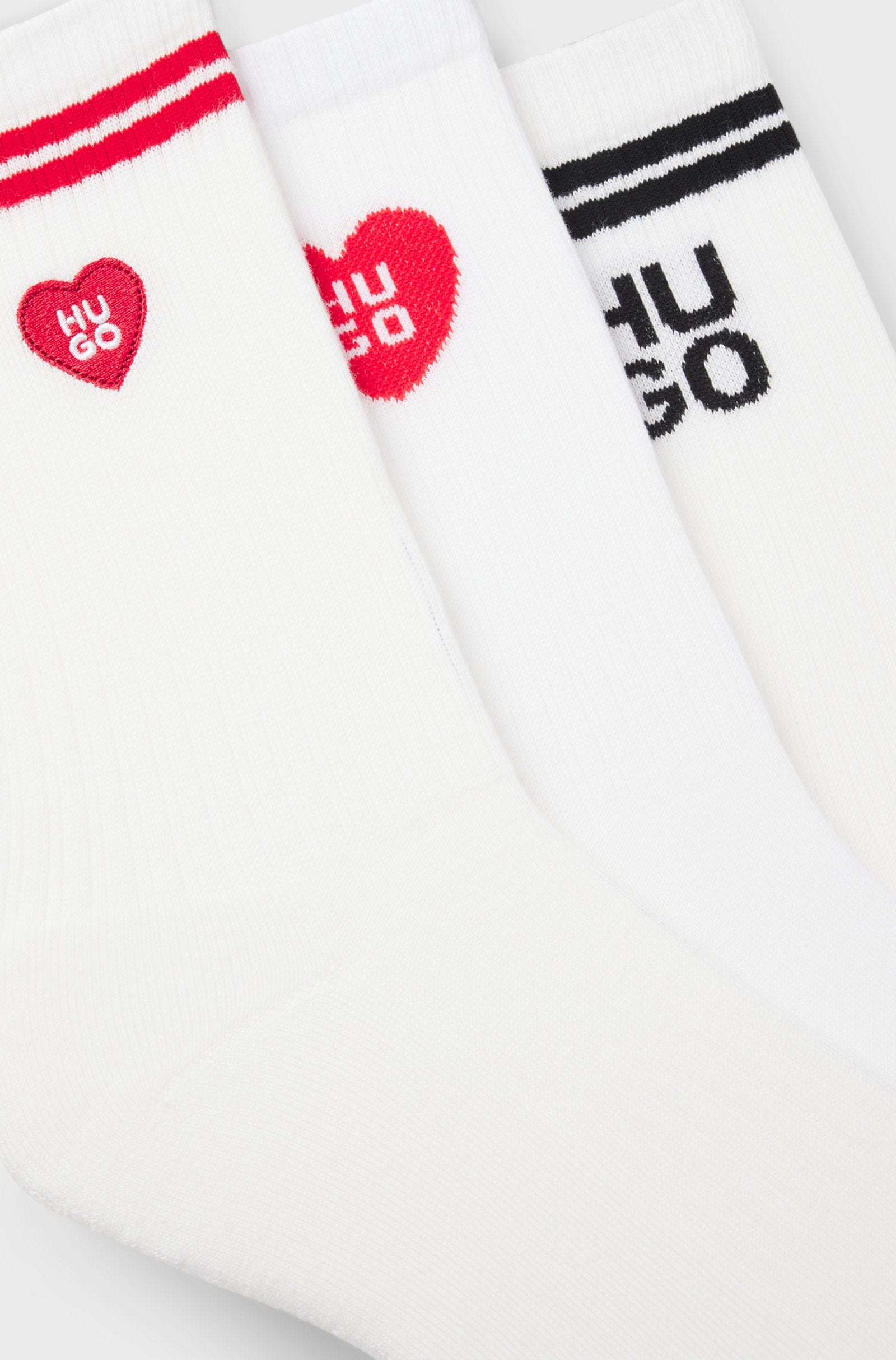 Sportives HUGO Socken-Trio aus geripptem, elastischem Baumwoll-Mix mit eingestrickten Logos und Logo-Stickereien. Kurze Länge.