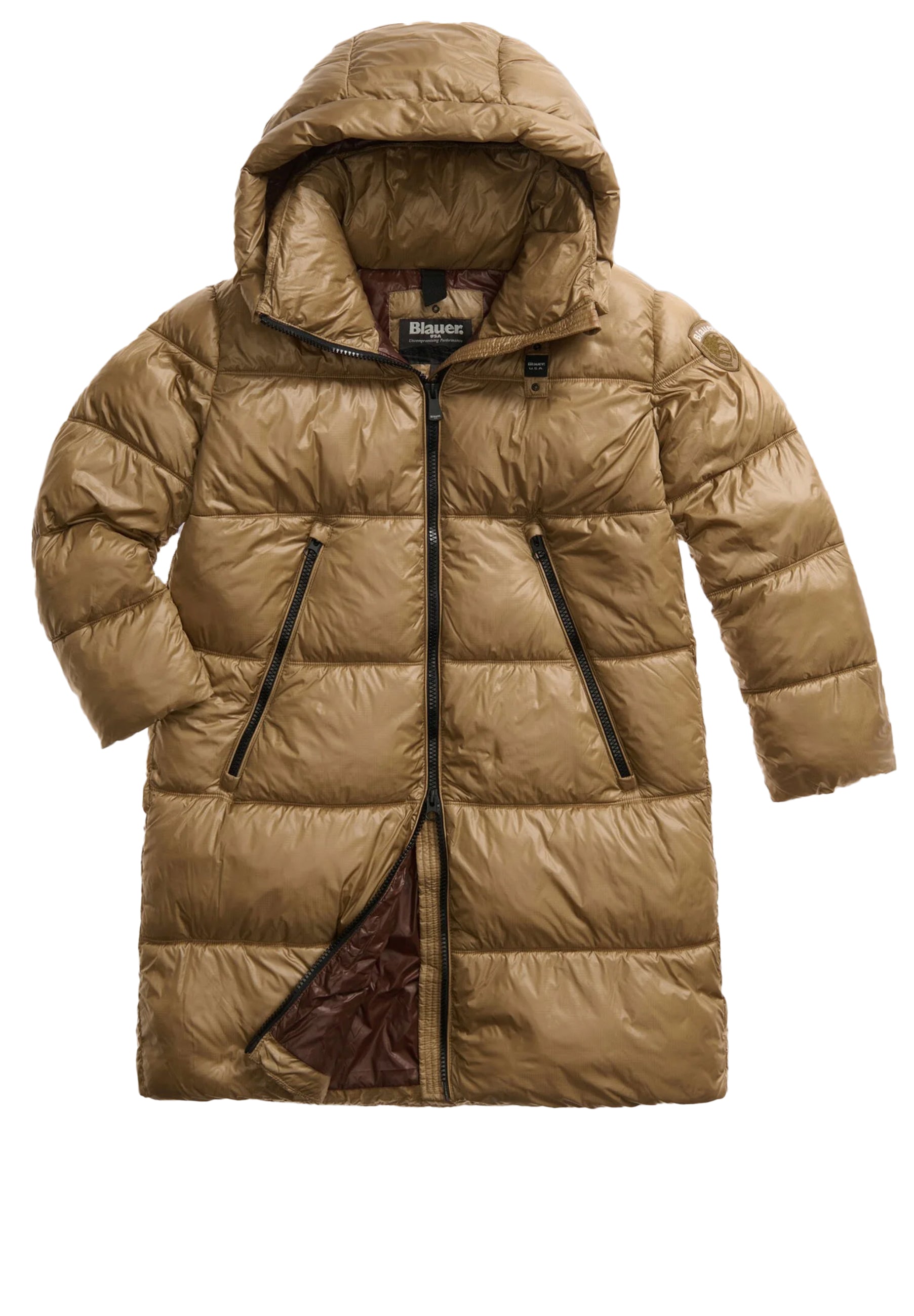 Langer Steppjacke aus Nylon Micro-Rip. Modell mit fester Kapuze und hohem Innenkragen; ökologische, weiche Fütterung mit breiten horizontalen Steppnähten.