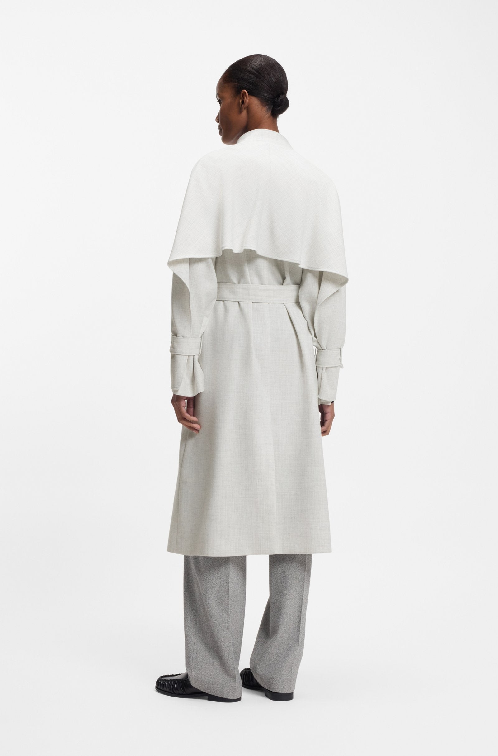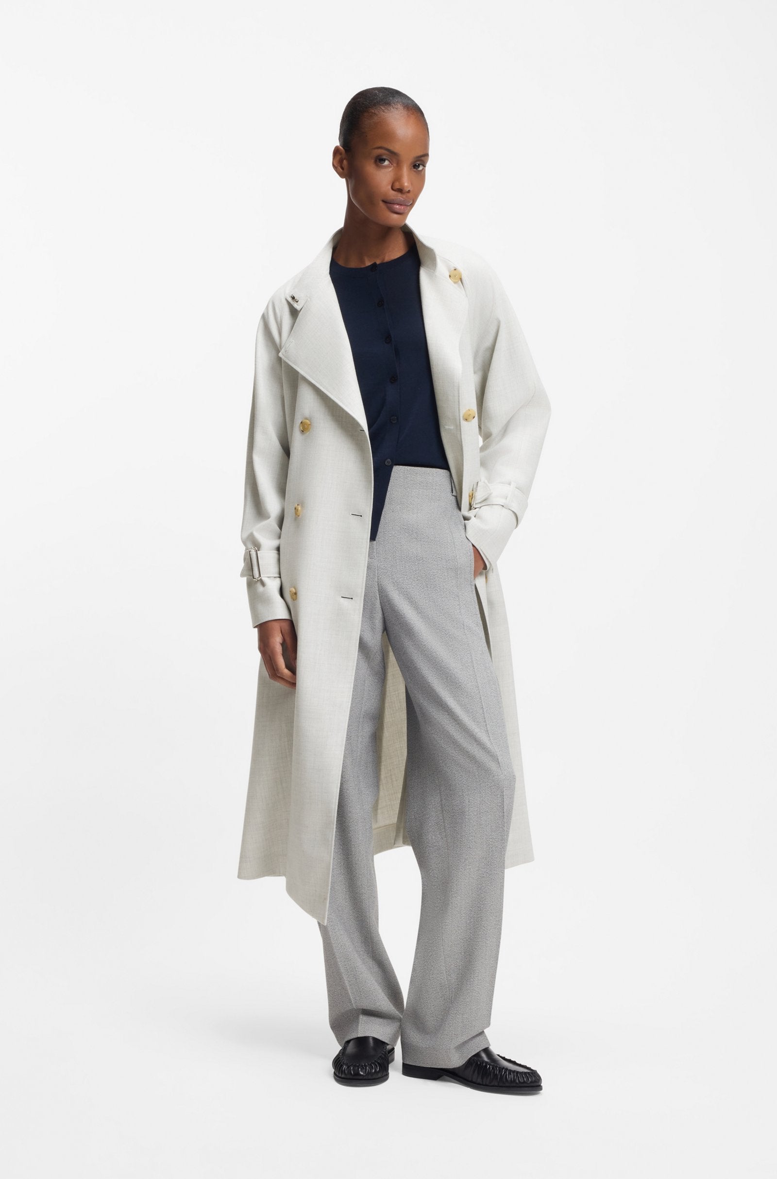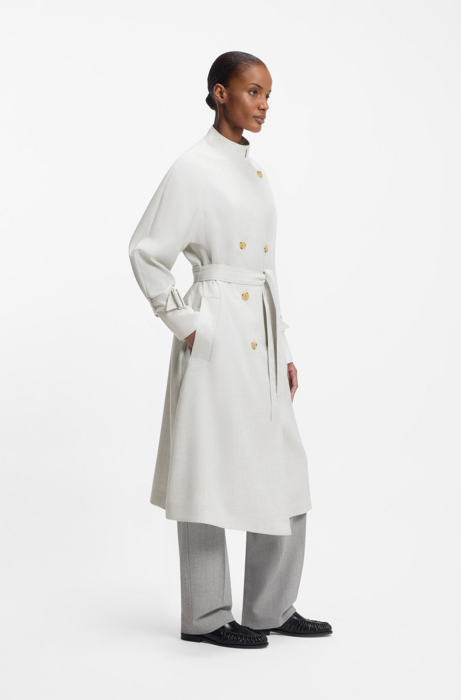 Dieser Mantel von BOSS Womenswear ist eine moderne Interpretation eines Klassikers und hat einen Gürtel, einen Stehkragen und einen doppelreihigen Verschluss. Gerade Passform. Twill-Stoff mit weicher Wollmischung.