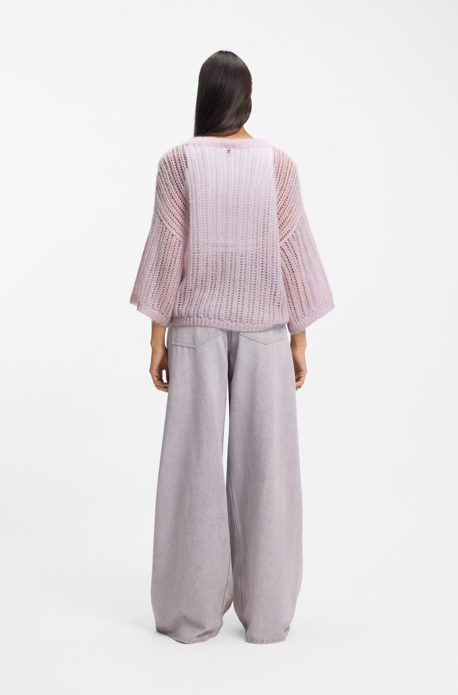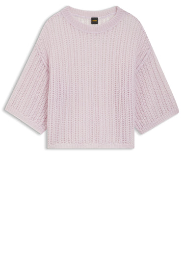Der BOSS Pullover aus einem strukturierten Woll-Mix mit luftigem, offenem Strickmuster lässt sich ganz einfach stylen. Logo-Anhänger hinten. Oversize-Passform.