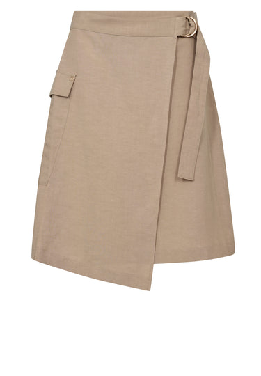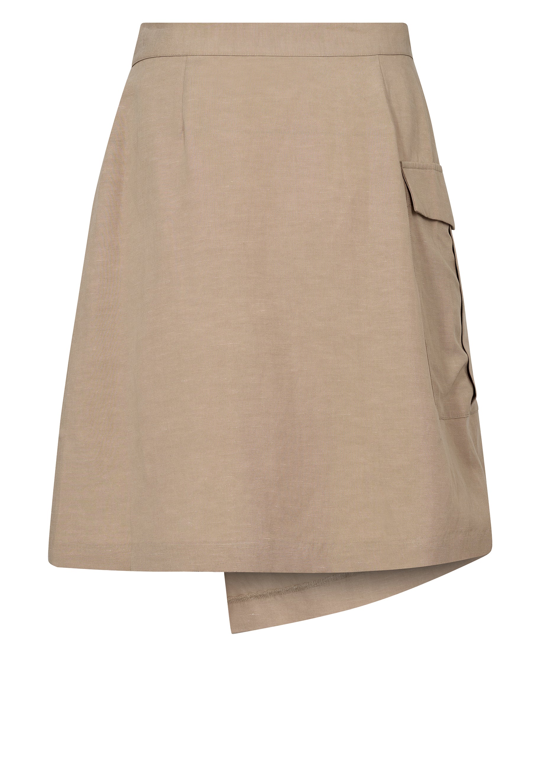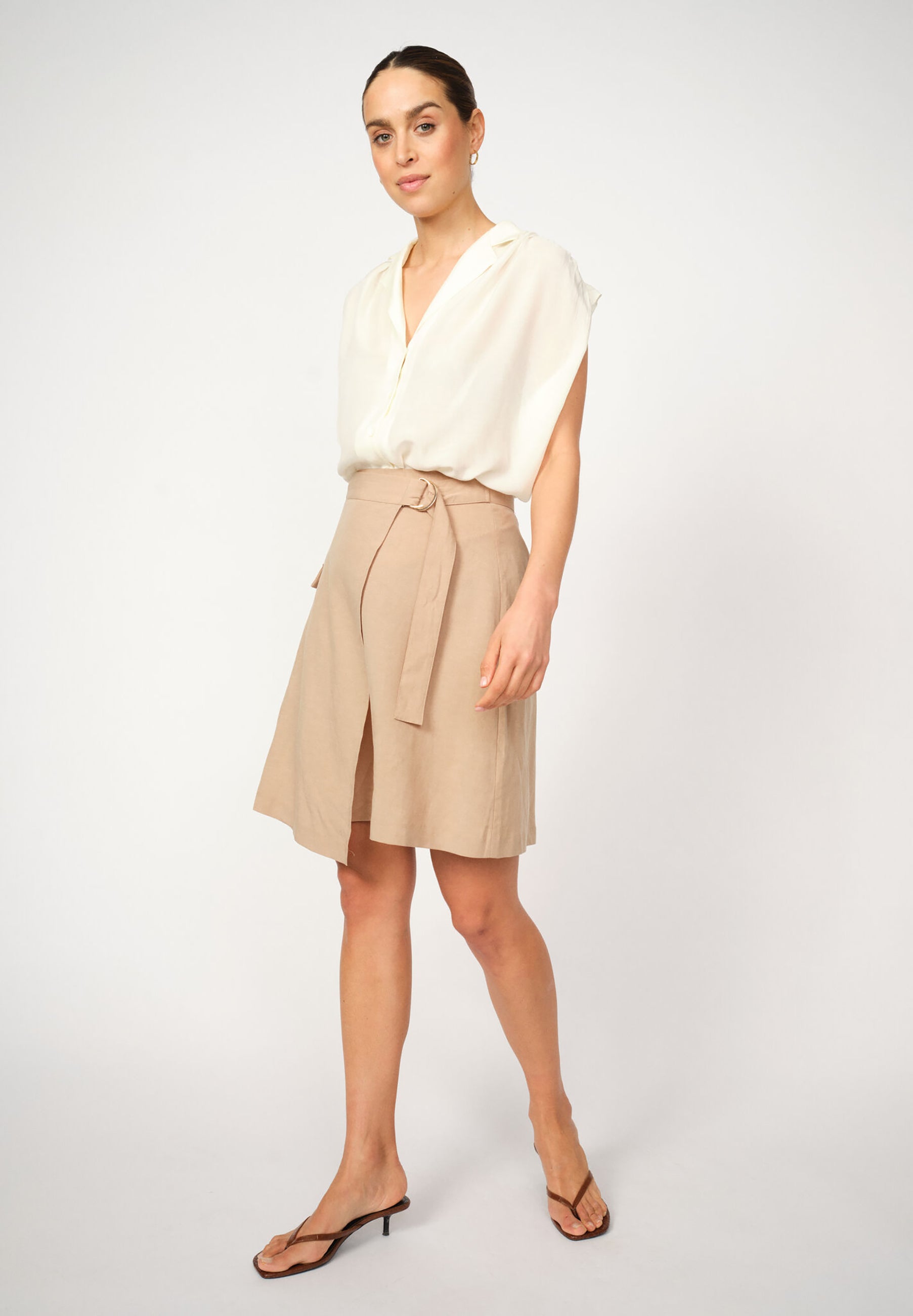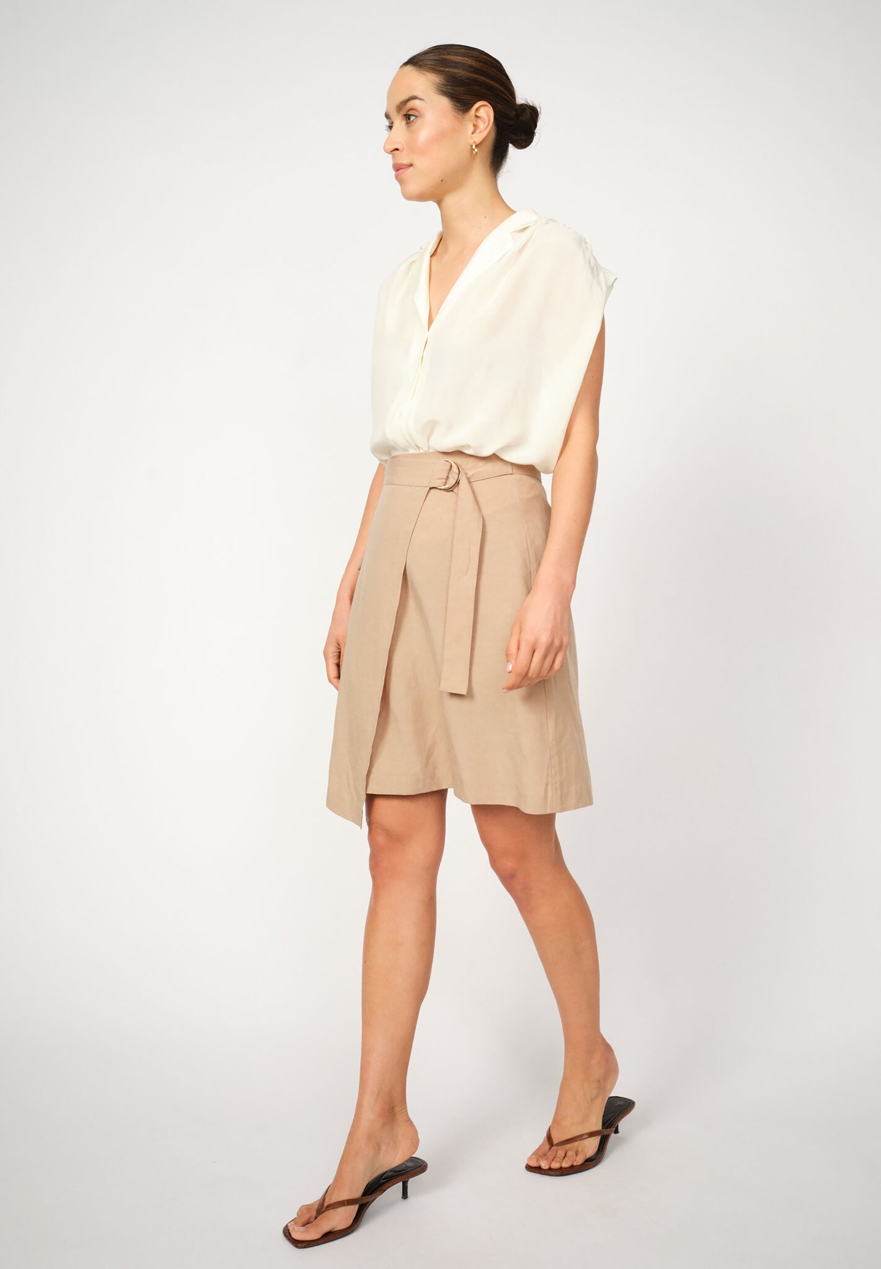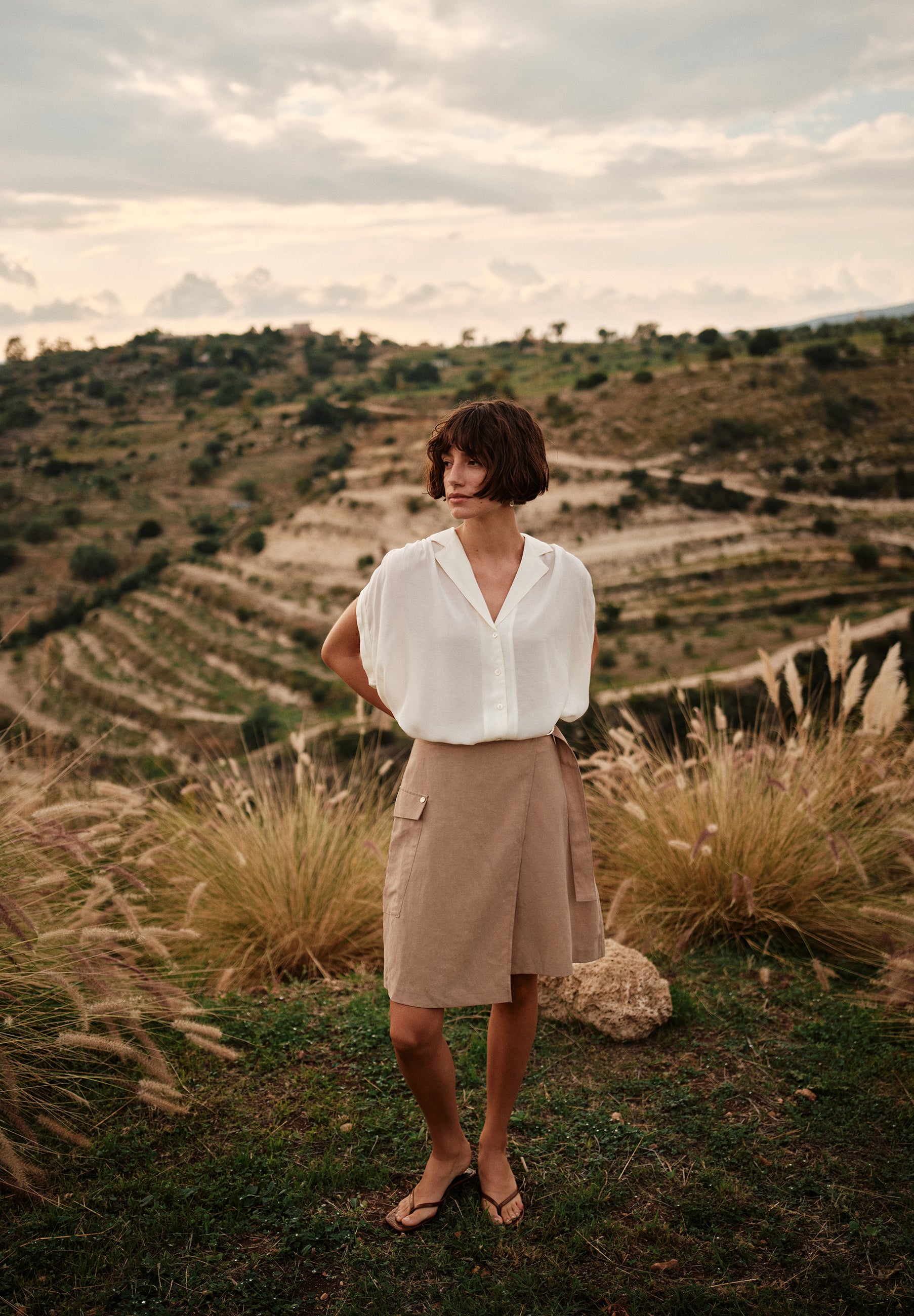 Dieser schicke Rock ist von Workwear inspiriert und vereint Struktur mit Eleganz. Er besteht aus einer strukturierten Mischung aus Tencel und Leinen, die sowohl Strapazierfähigkeit als auch Raffinesse bietet. Der hochtaillierte Schnitt betont die Figur auf elegante Weise, während das Wickeldesign mit einer goldfarbenen Gürtelschnalle einen luxuriösen Akzent setzt. Eine quadratische Seitentasche unterstreicht den Workwear-Charakter. Kombiniere ihn mit der passenden Bluse für ein abgestimmtes Outfit oder mit einem weißen T-Shirt und Sandalen mit Absatz für einen eleganten, dezenten Look.