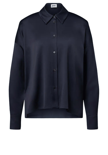 Eine klassische Hemdbluse. Sie kann gut zu einem formellen Look oder zu einem casual Outfit kombiniert werden. Gefertigt aus einem hochwertigem und fließendem Satin.