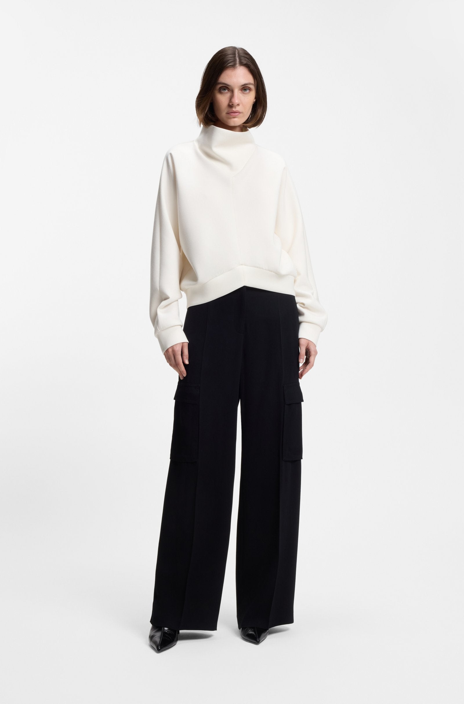 Der BOSS Pullover mit drapiertem Trichterkragen und geschwungenem Saum sorgt für eine zeitgemäße Casual-Silhouette. Geprägtes Double-B-Monogramm. Lockere Passform.