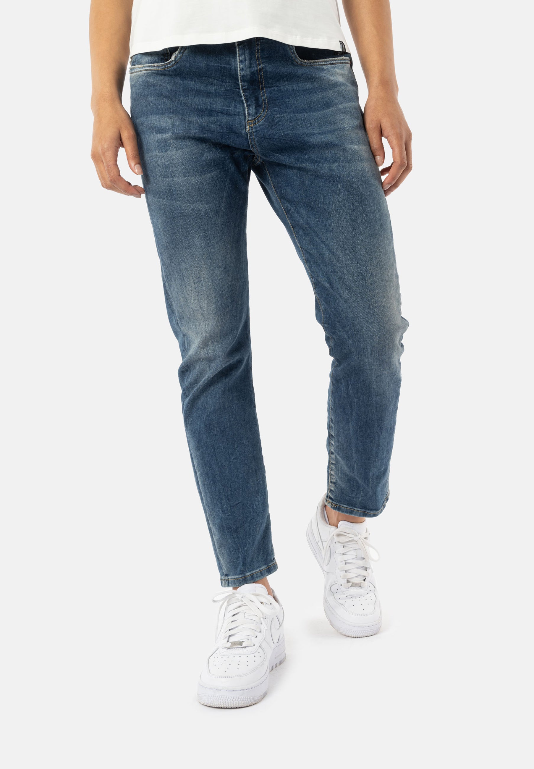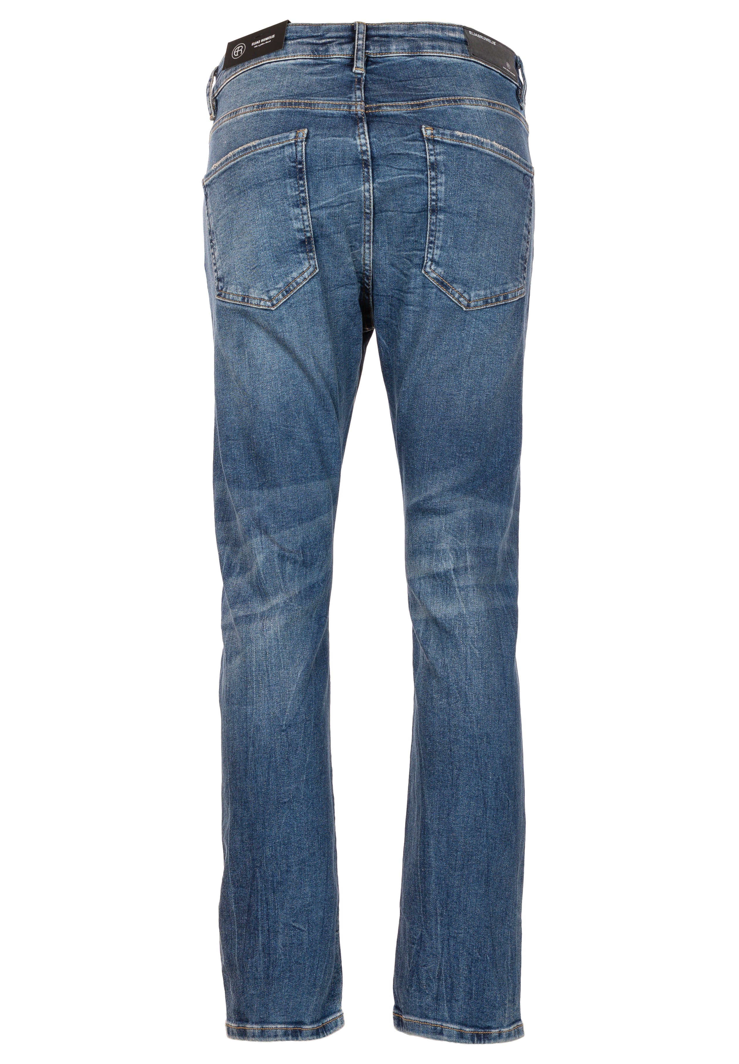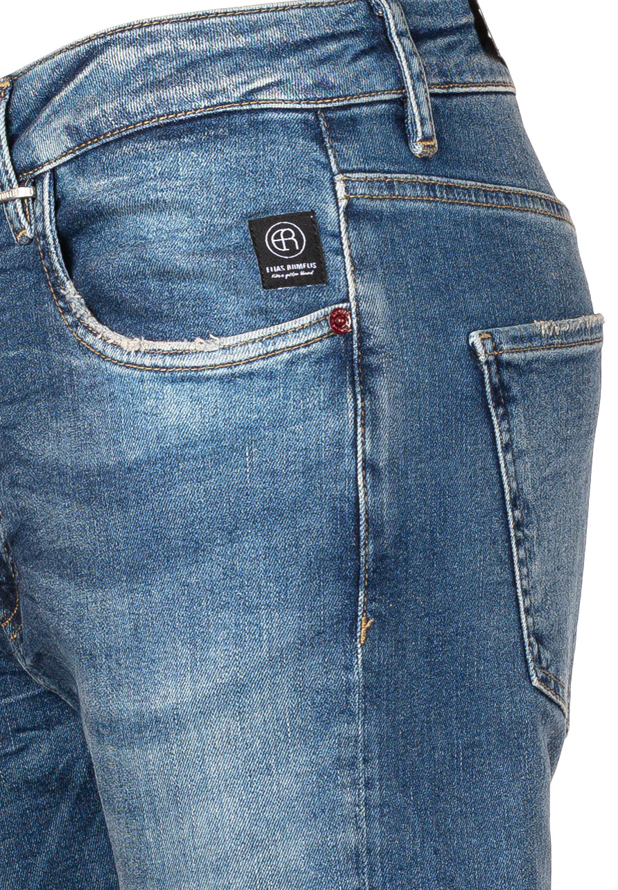 Damen-Jeans Leona im Boyfriend Fit von ELIAS RUMELIS mit hoher Leibhöhe und schmal zulaufendem Bein. Aus elastischer Baumwollqualität in Used-Waschung mit dezenten Destroyed-Details, Leder-Badge am Bund, Five-Pocket-Style und Logo-Detail an der Gesäßtasche.