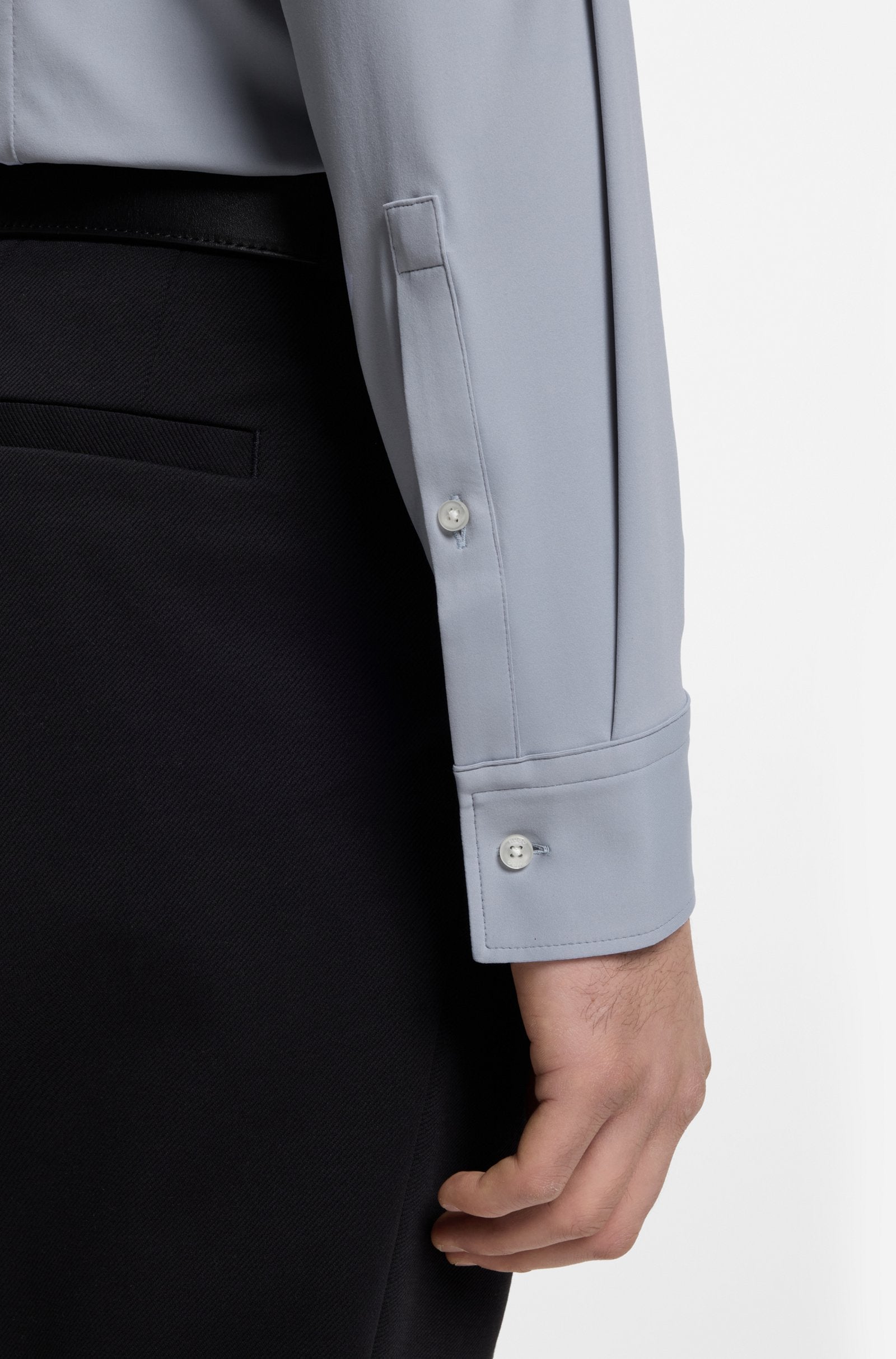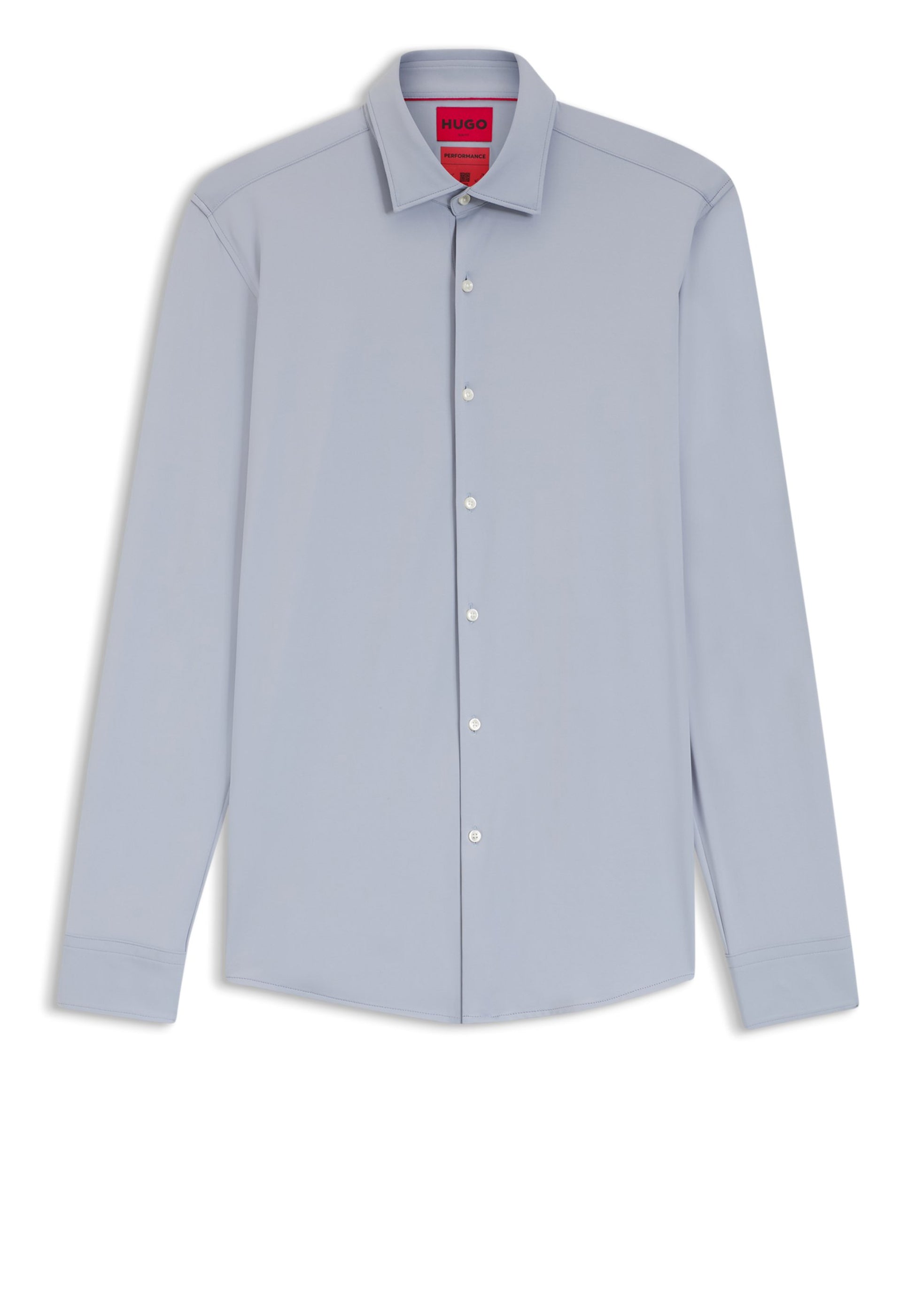 Smartes HUGO Hemd fürs Office. Das schmal geschnittene Herren-Hemd mit cleaner Silhouette ist aus funktionalem Stretch-Jersey gefertigt, der hohen Tragekomfort verspricht. Charakteristische rote Paspeln innen am Kragen sorgen für den typischen HUGO Flair.