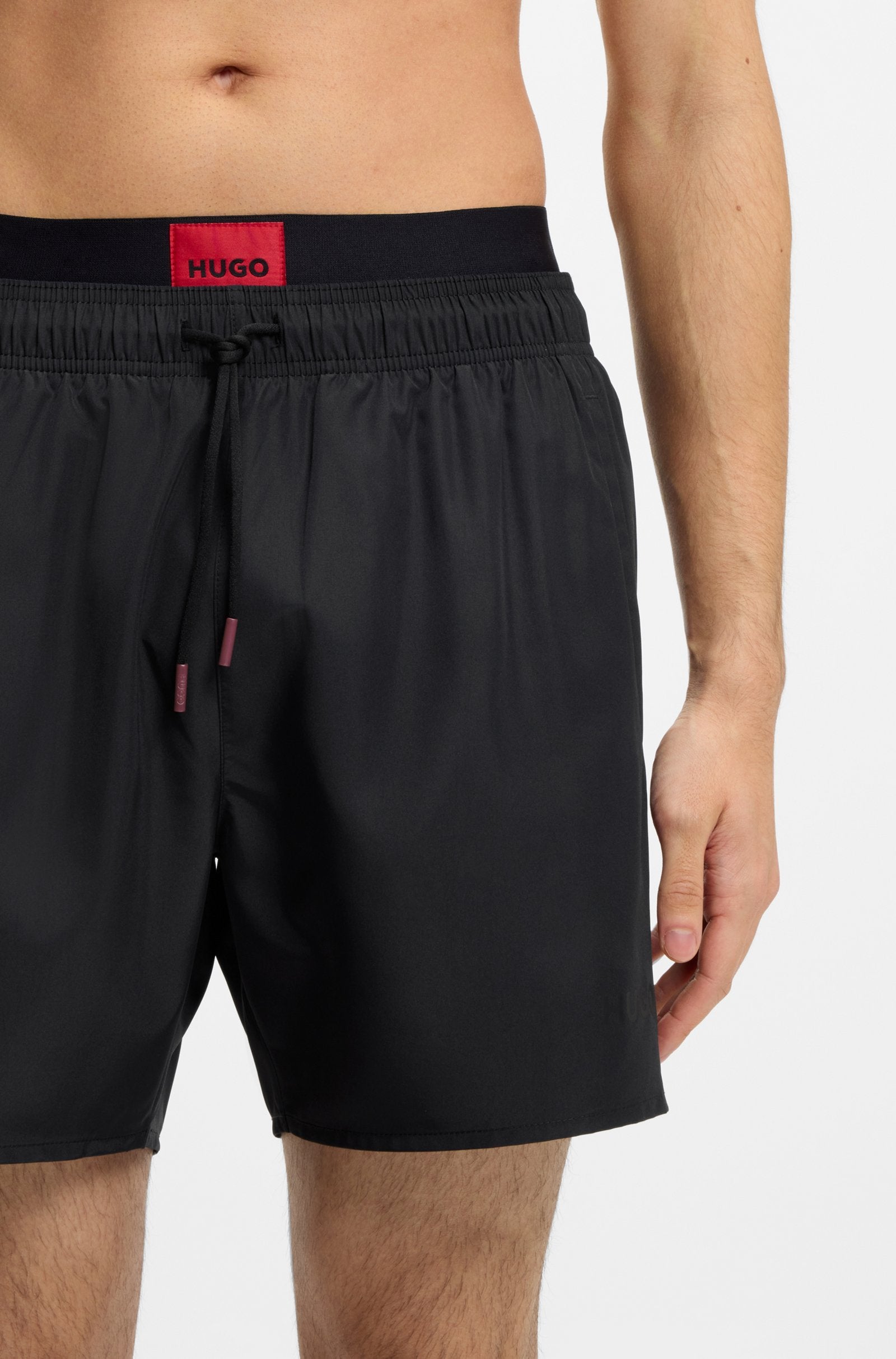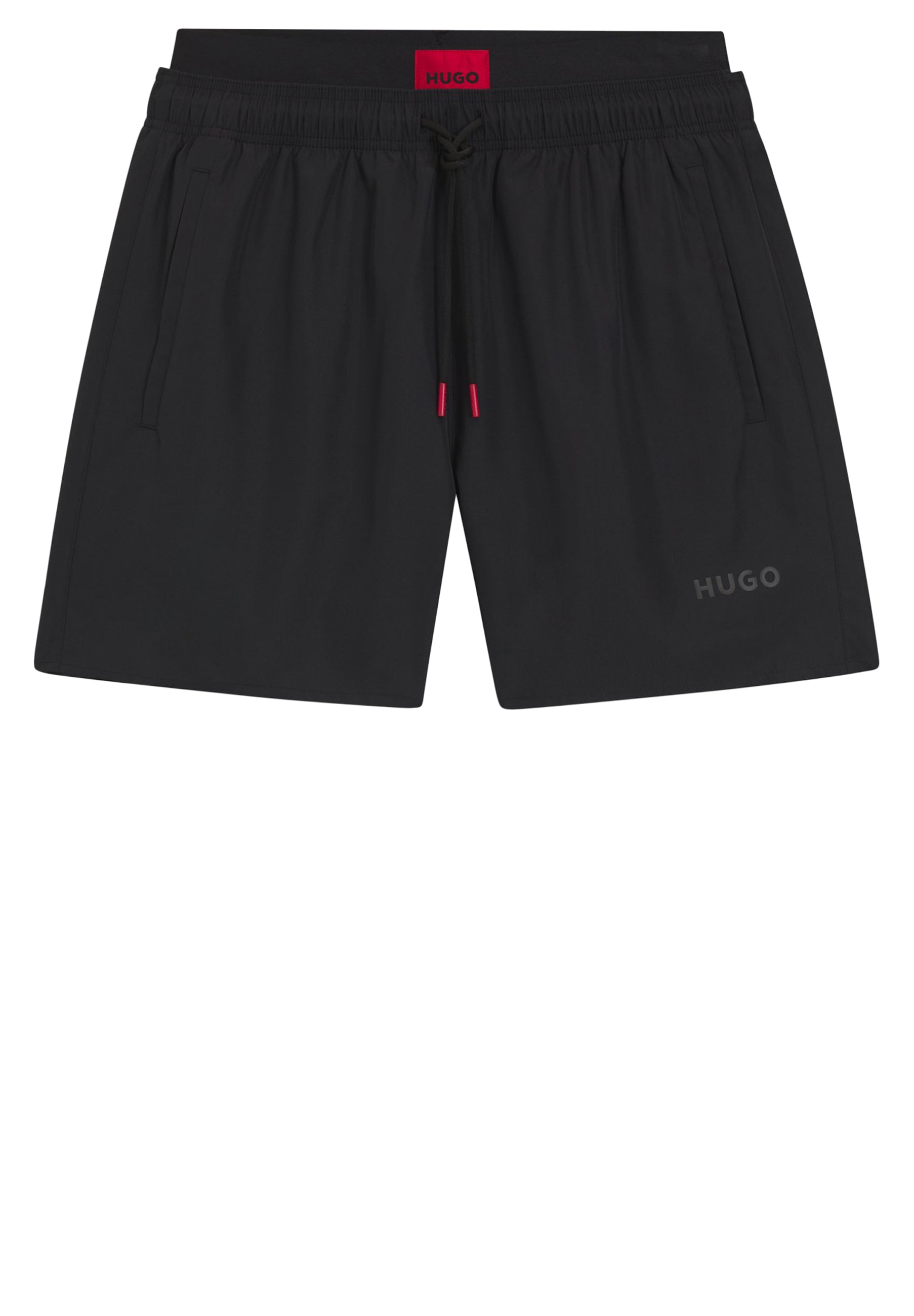 Mit doppeltem Bund und rotem Logo-Label sind diese HUGO Badeshorts aus einem von Natur aus schnell trocknenden Gewebe gefertigt. Verstellbarer Kordelzug. Bedrucktes Branding.