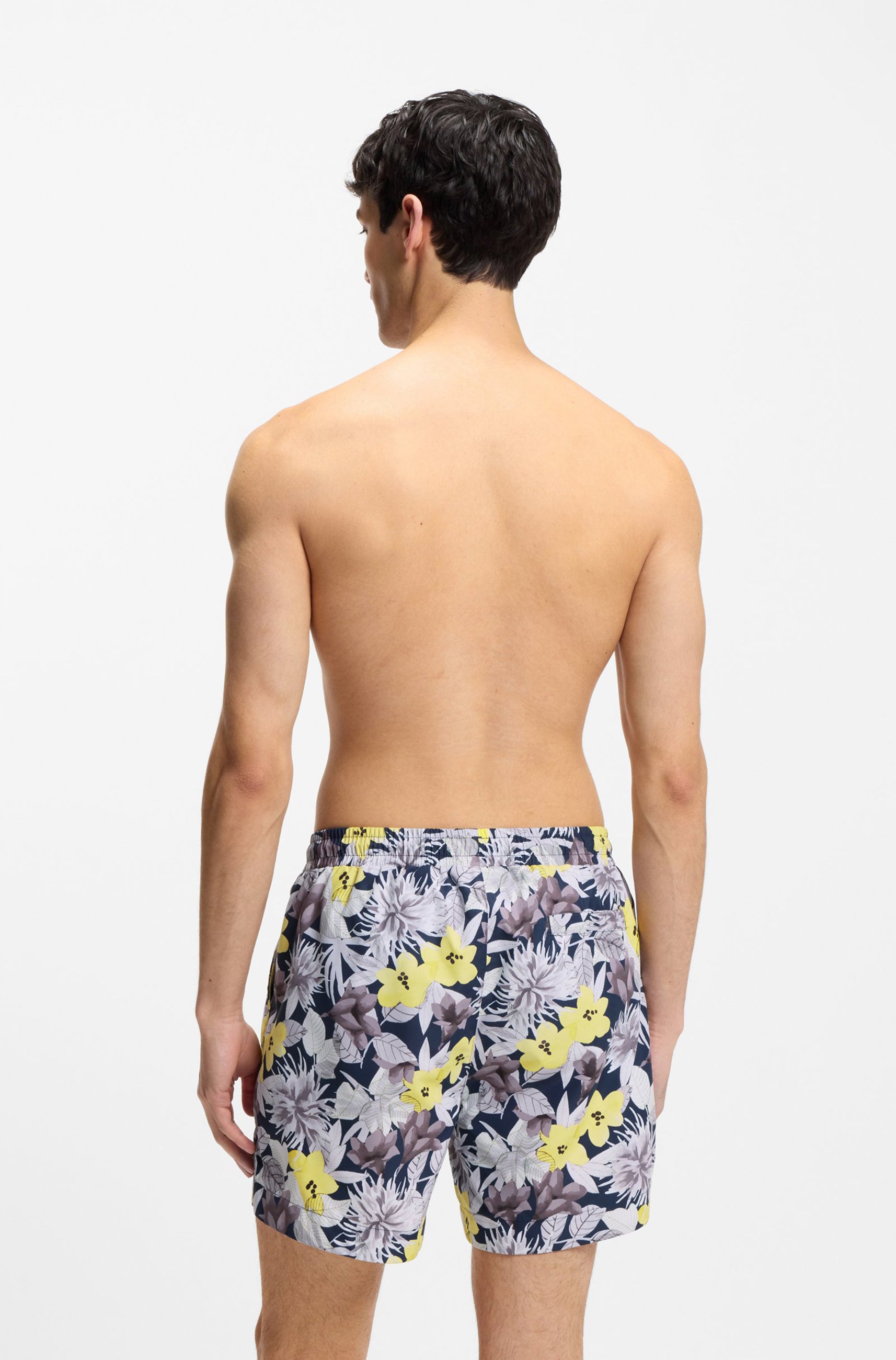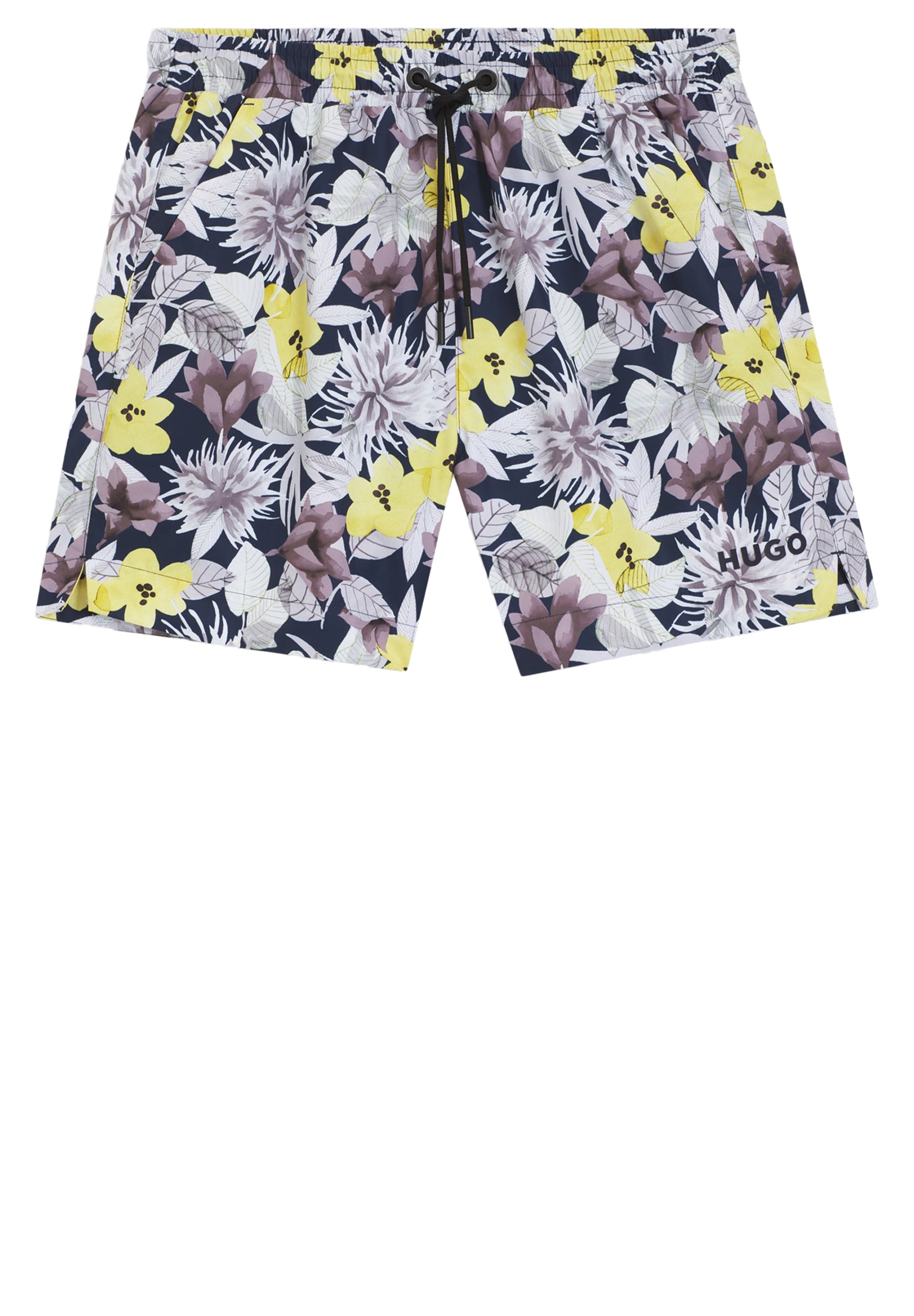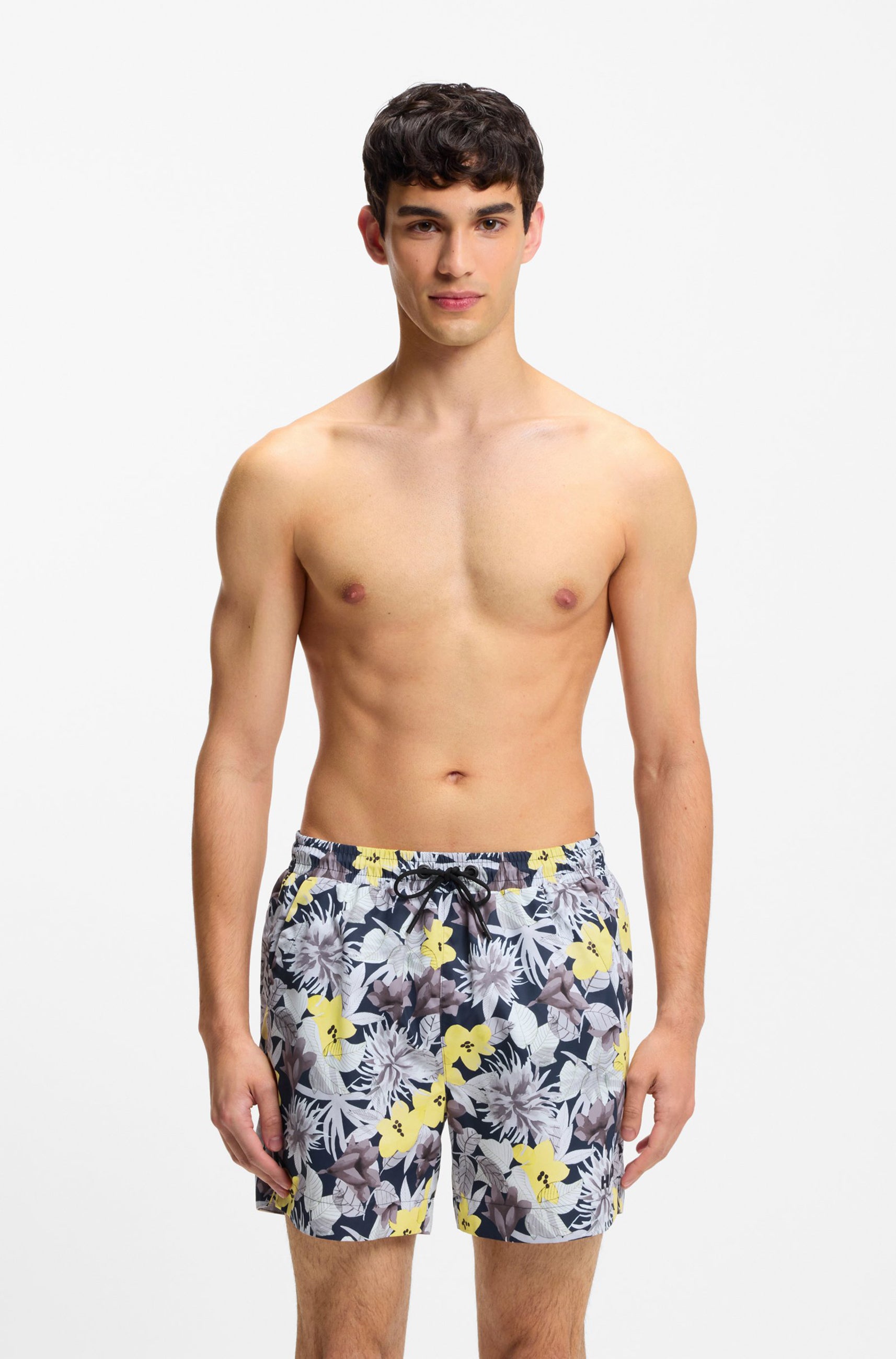 HUGO Badeshorts mit Statement-Allover-Print aus einem von Natur aus schnell trocknenden Gewebe. Logo-Detail am linken Bein. Dieses Produkt enthält mindestens 80 % bessere Rohstoffe. Dieses Produkt wird teilweise aus recyceltem Polyester gefertigt. Wir bei HUGO BOSS bevorzugen recycelten Polyester aus Materialabfällen und gebrauchten Stoffresten und geben unser Bestes, um von Polyester aus PET-Flaschen umzusteigen.