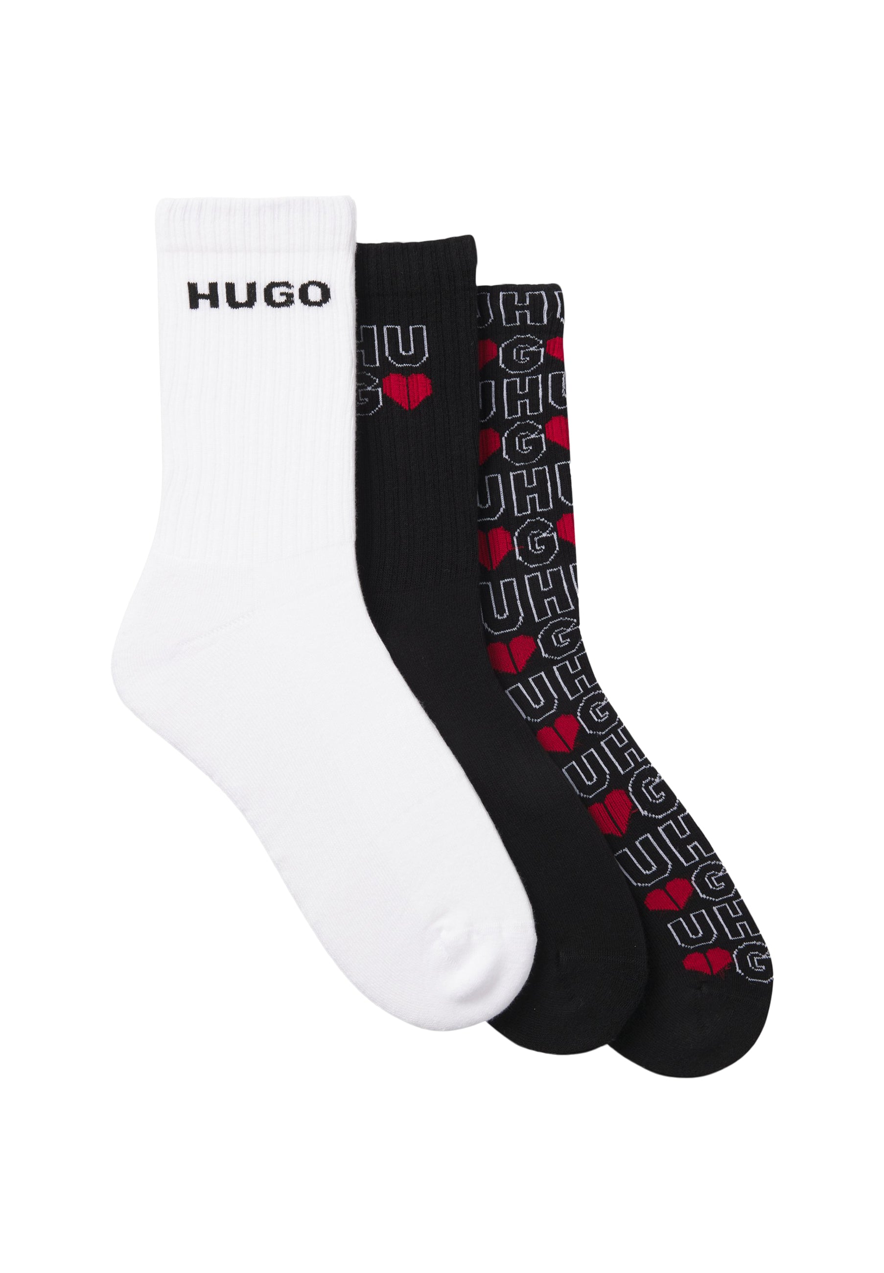 Drei Paar kurze HUGO Socken mit weicher Sohle und kreativem Logo-Design. Aus einem Baumwoll-Mix mit Elasthan-Anteil. Ideal für aktive Tage.