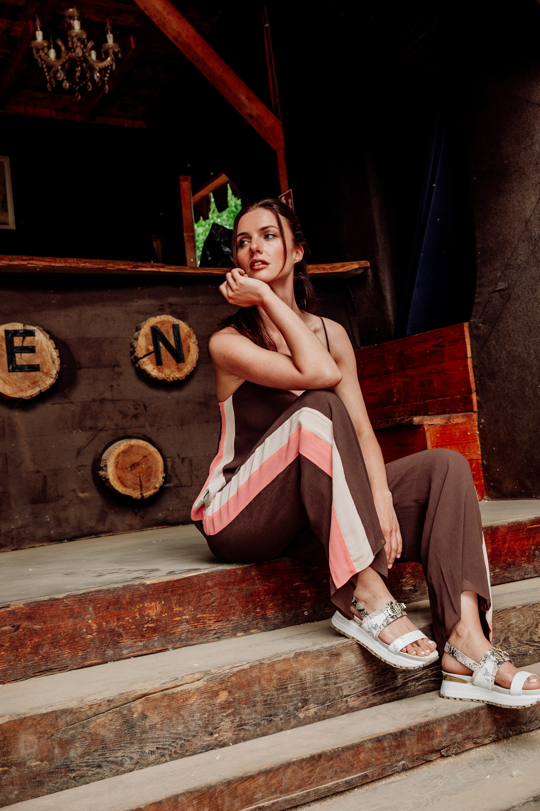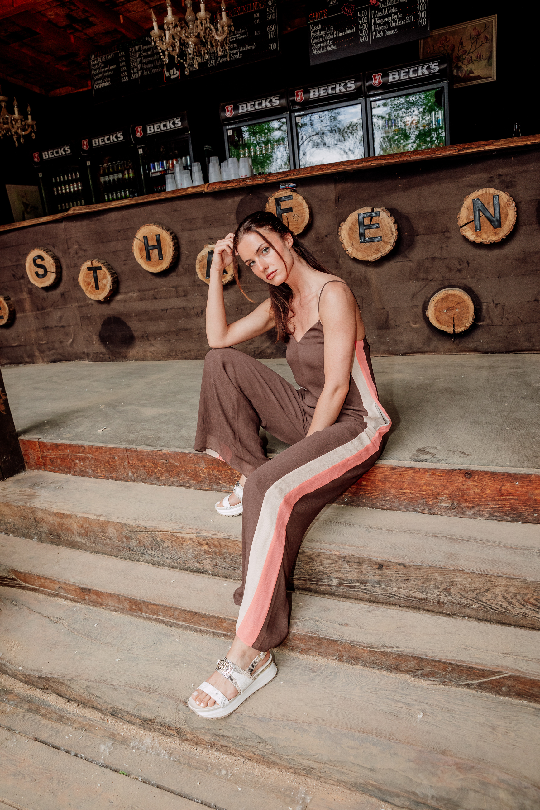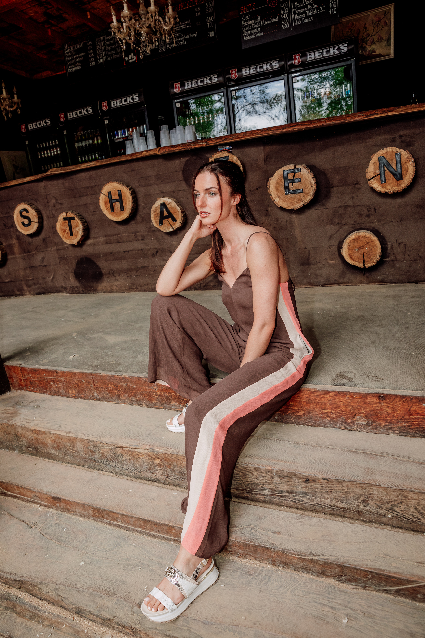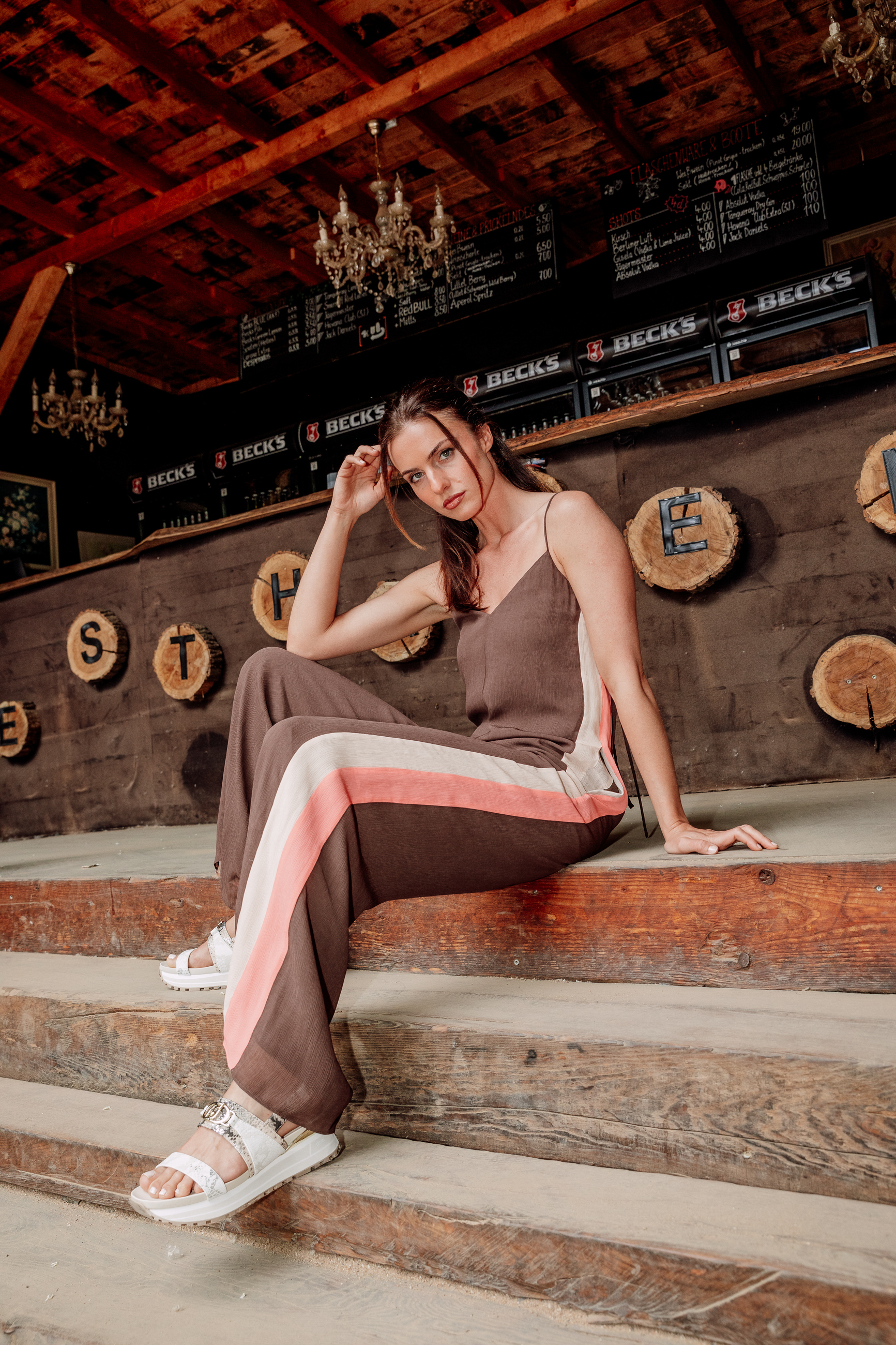 Inmitten rustikaler Kulisse trifft urbane Eleganz auf entspannten Sommer-Chic. Der fließende Jumpsuit in warmem Schokobraun mit kontrastierenden Streifen in Rosé und Offwhite setzt ein stilvolles Statement – feminin, kraftvoll und gleichzeitig mühelos. Die leichten Plateau-Sandalen mit dezentem Glanz ergänzen den Look mit einem Hauch Glamour, ohne die Bodenständigkeit zu verlieren.