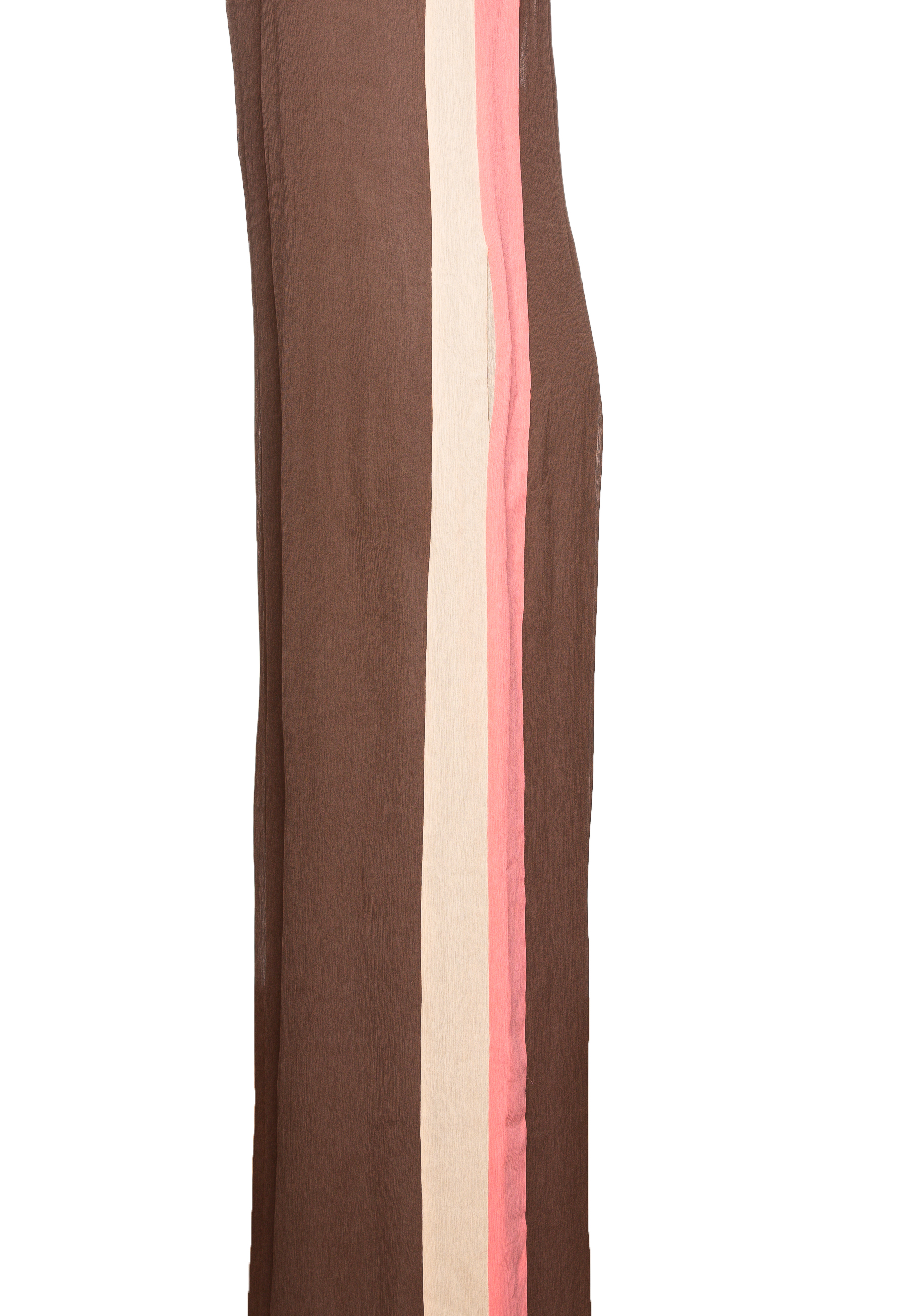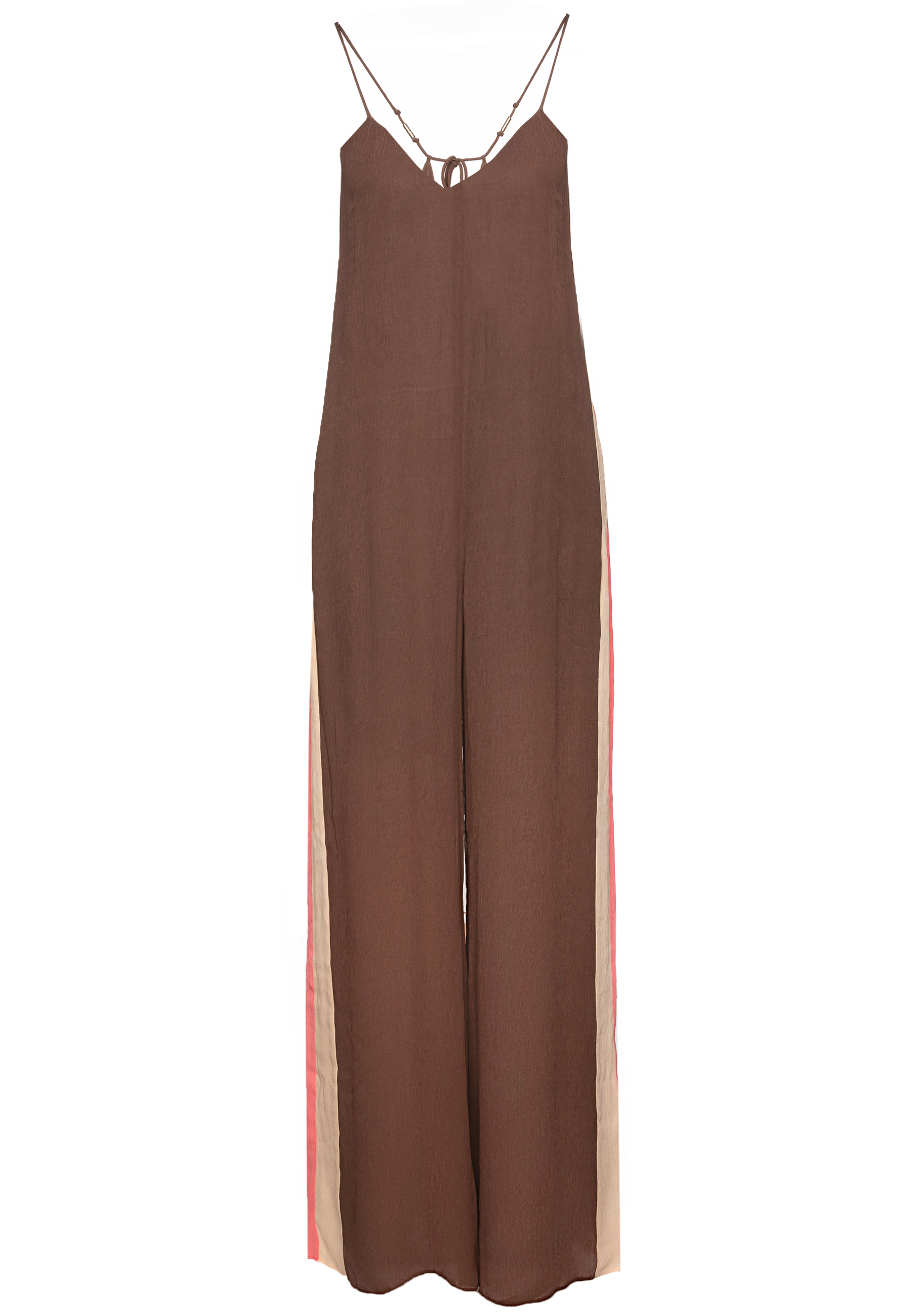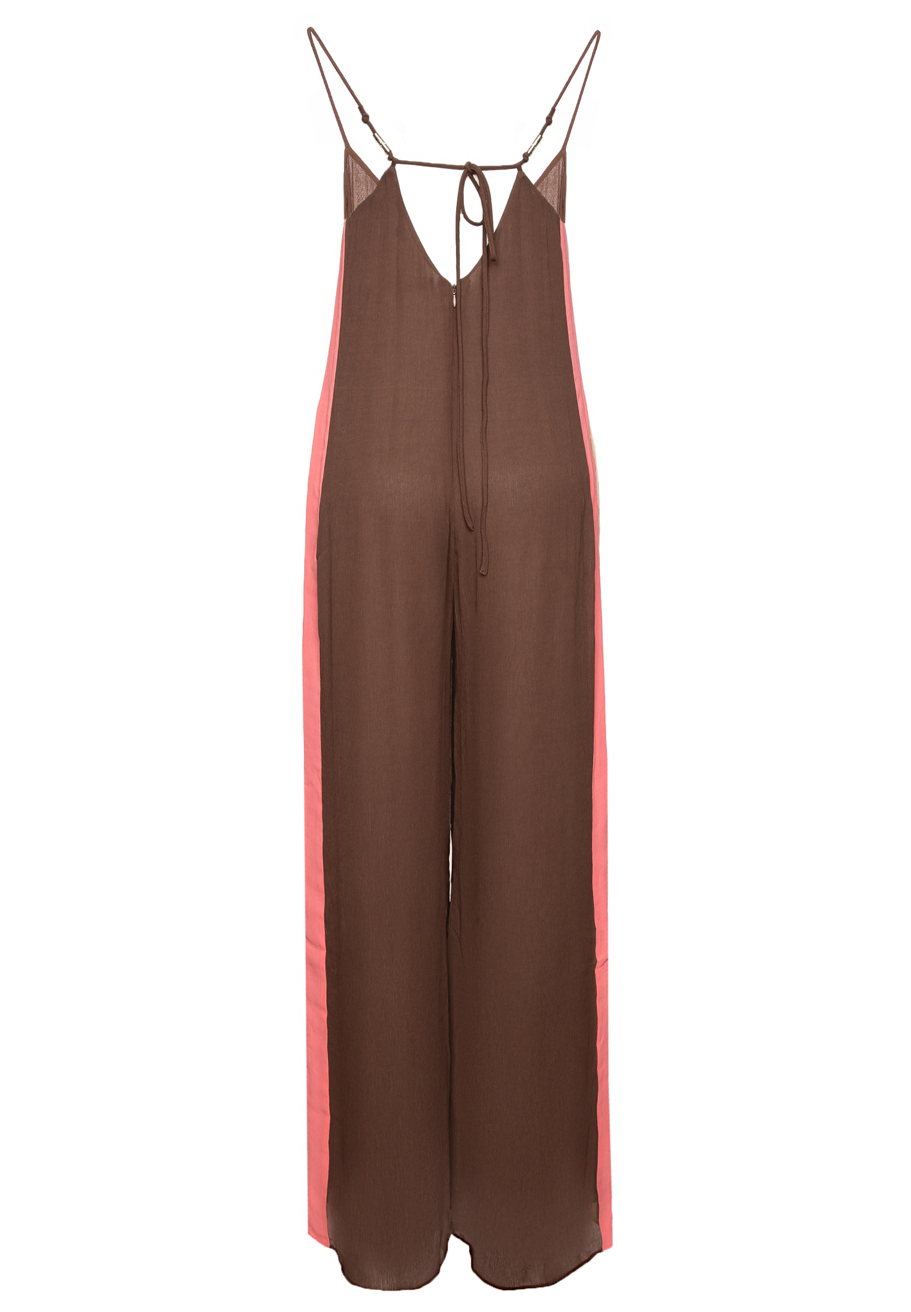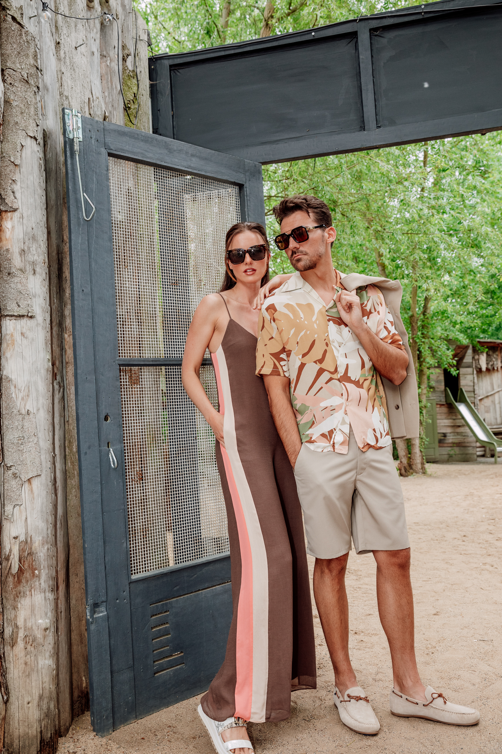 Inmitten rustikaler Kulisse trifft urbane Eleganz auf entspannten Sommer-Chic. Der fließende Jumpsuit in warmem Schokobraun mit kontrastierenden Streifen in Rosé und Offwhite setzt ein stilvolles Statement – feminin, kraftvoll und gleichzeitig mühelos. Die leichten Plateau-Sandalen mit dezentem Glanz ergänzen den Look mit einem Hauch Glamour, ohne die Bodenständigkeit zu verlieren.