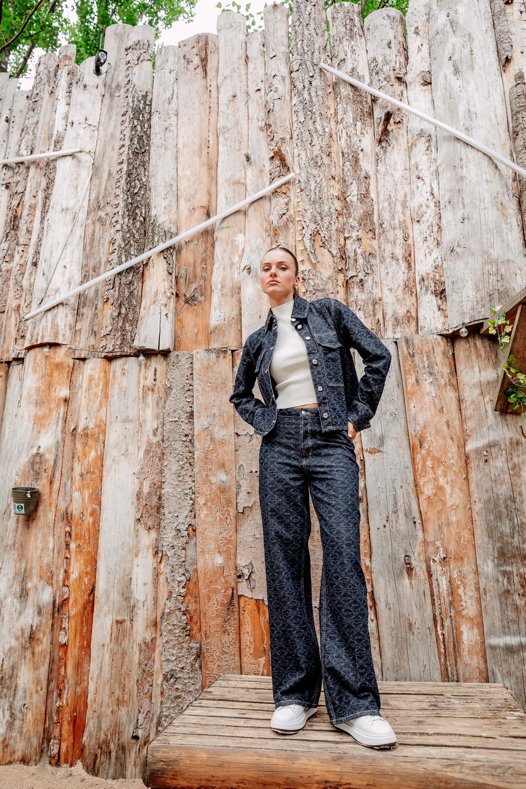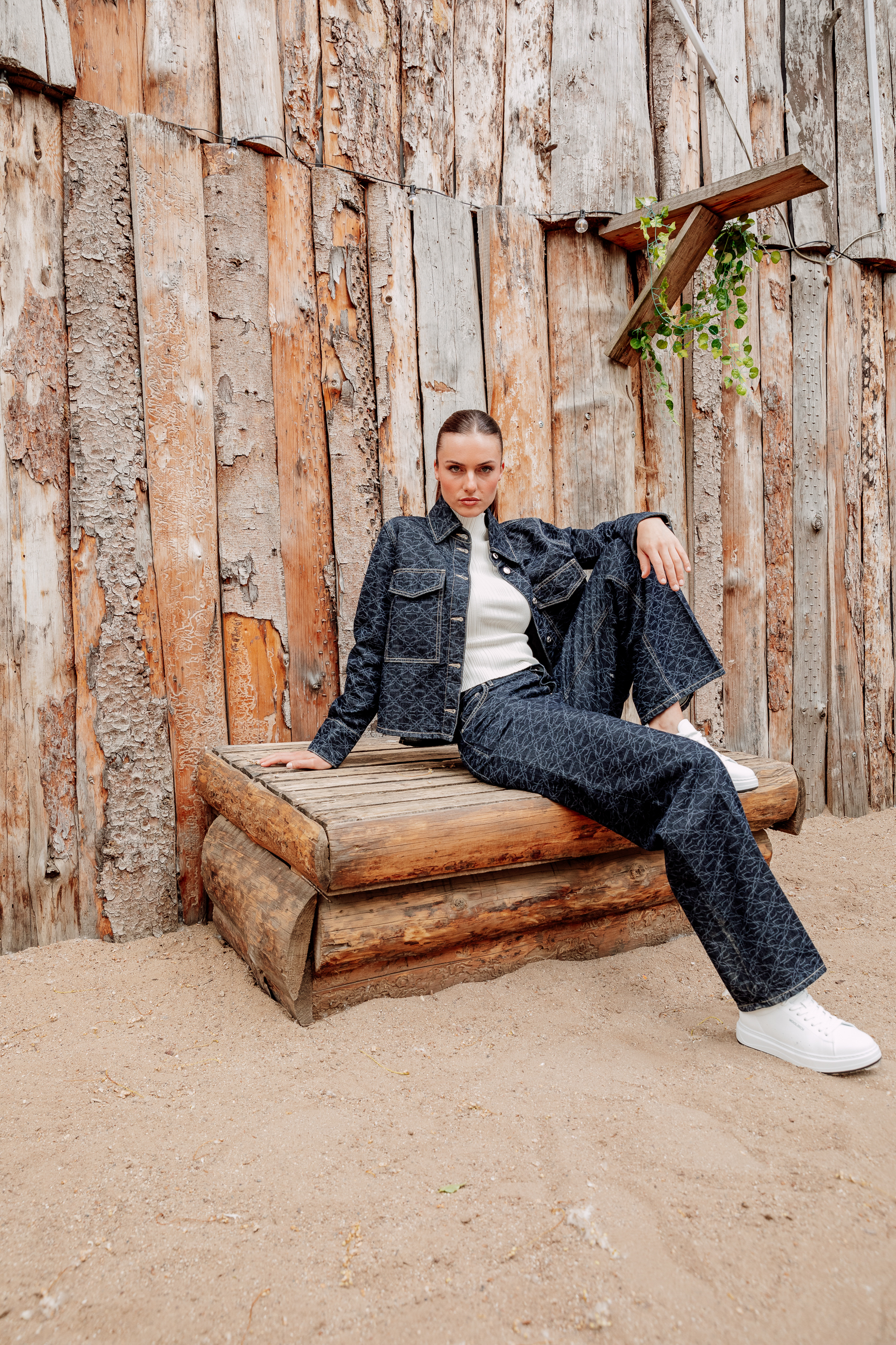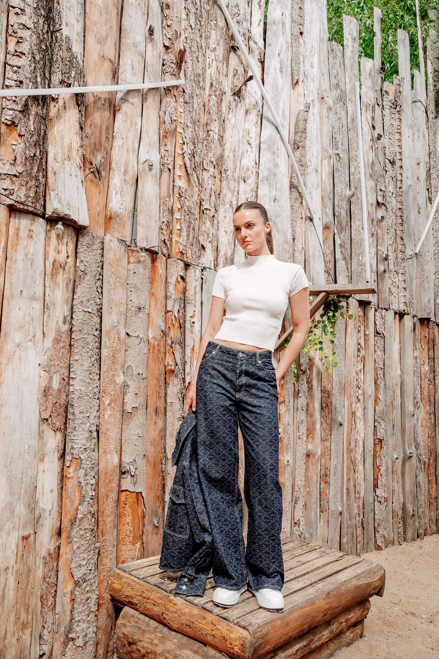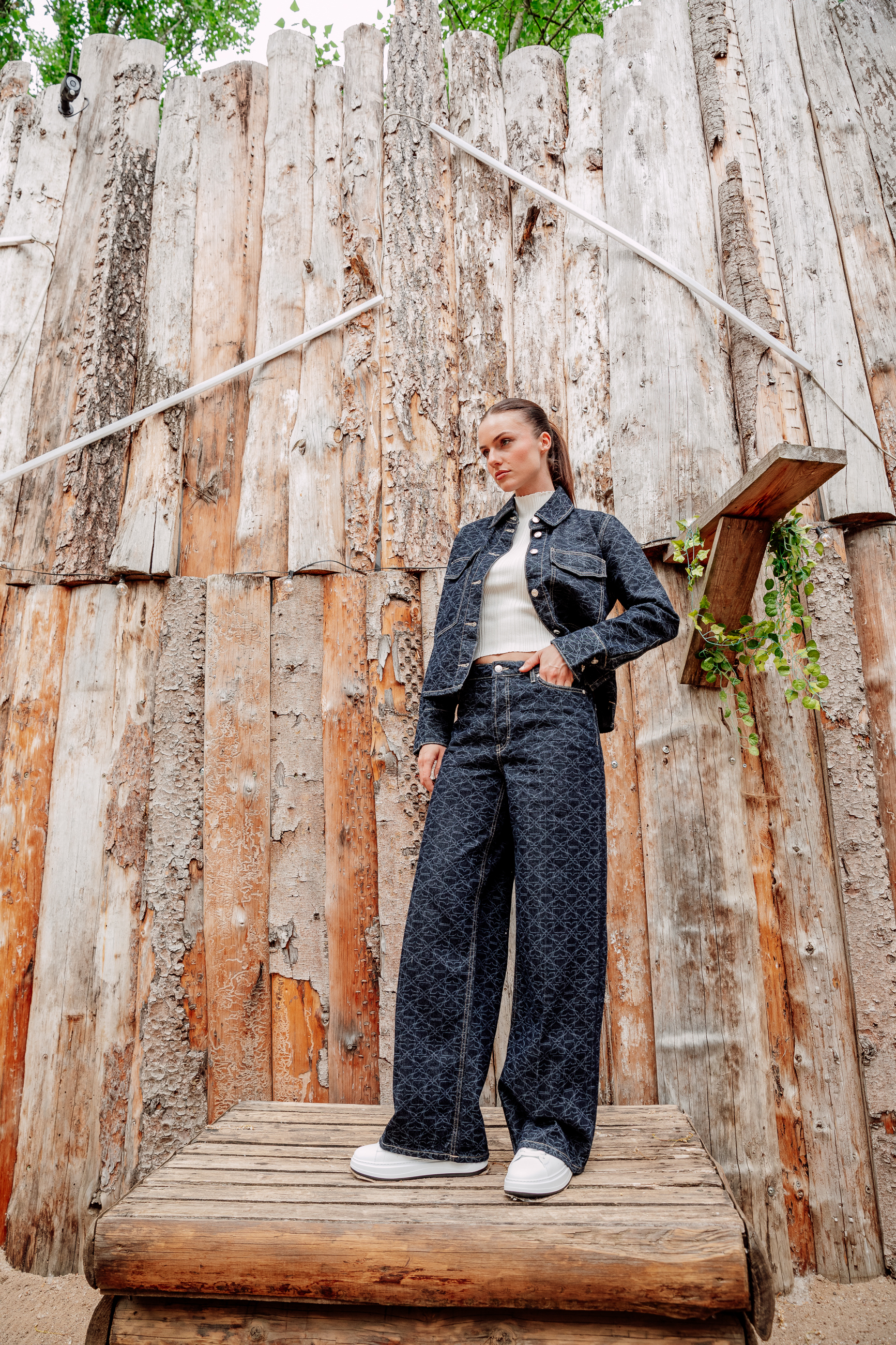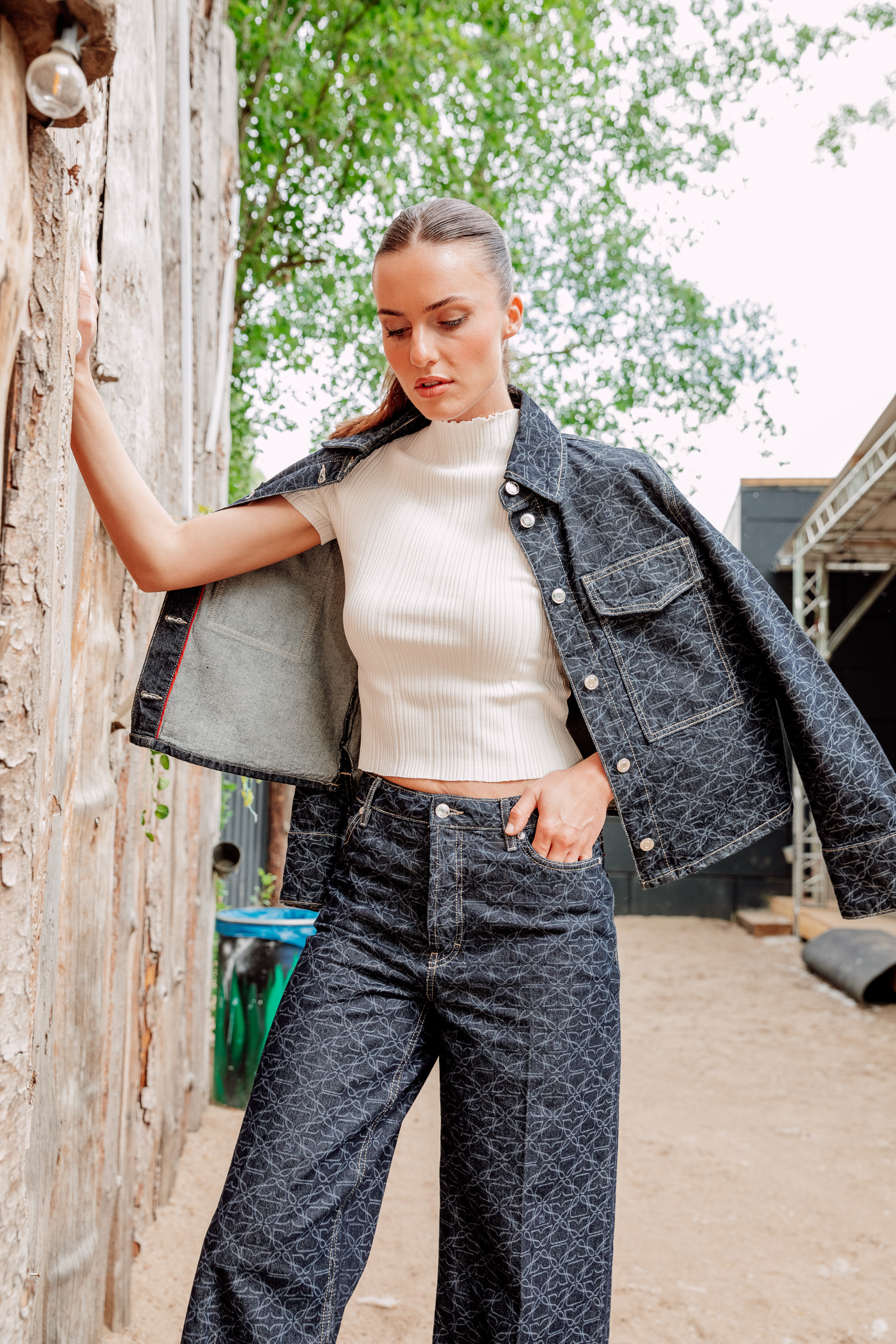 Dunkler Denim in strukturierter Ausführung bringt die klassische Jeansästhetik zurück, allerdings mit einem modernen Twist. Die weite Silhouette der Hose vermittelt Lässigkeit, während das feine Muster im Stoff subtil für Tiefe sorgt. Dazu gesellt sich eine taillierte Jeansjacke, die den Look nicht nur abrundet, sondern auch eine Hommage an 90s-Coolness darstellt. Weiße Sneaker unterstreichen den unkomplizierten Charakter dieses Looks und machen ihn citytauglich – vom Rooftop-Brunch bis zum Afterwork-Drink im Szeneviertel.