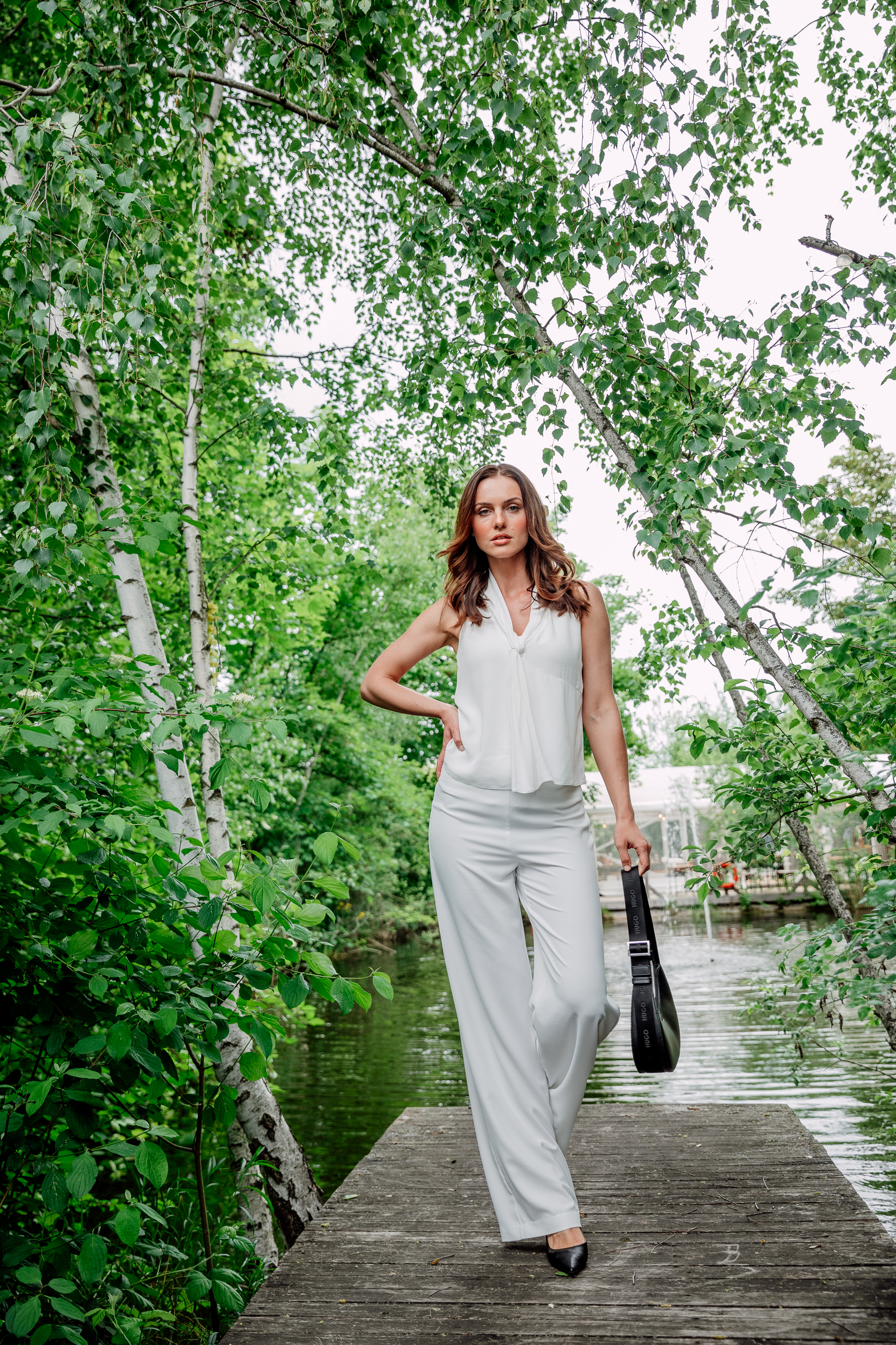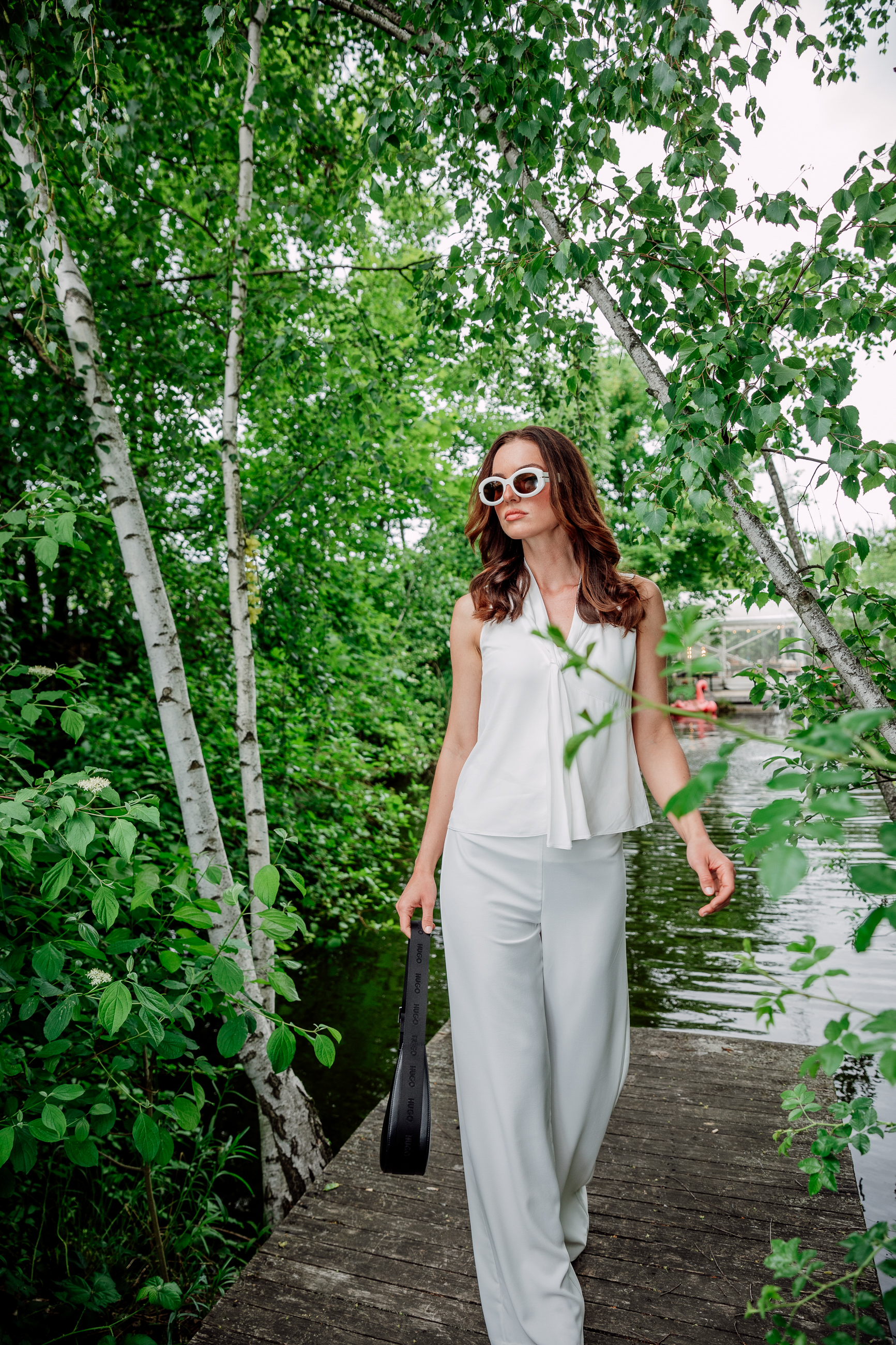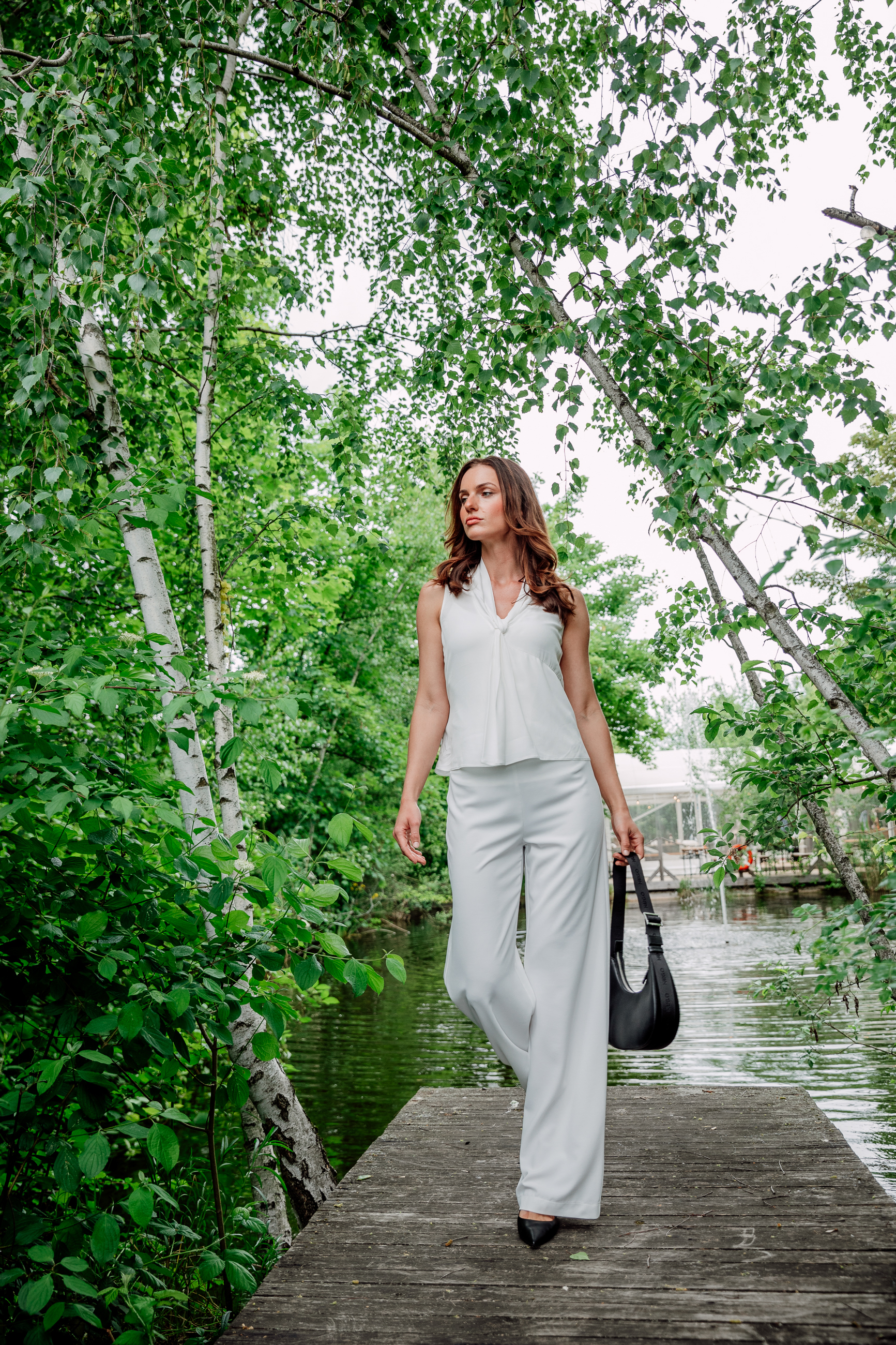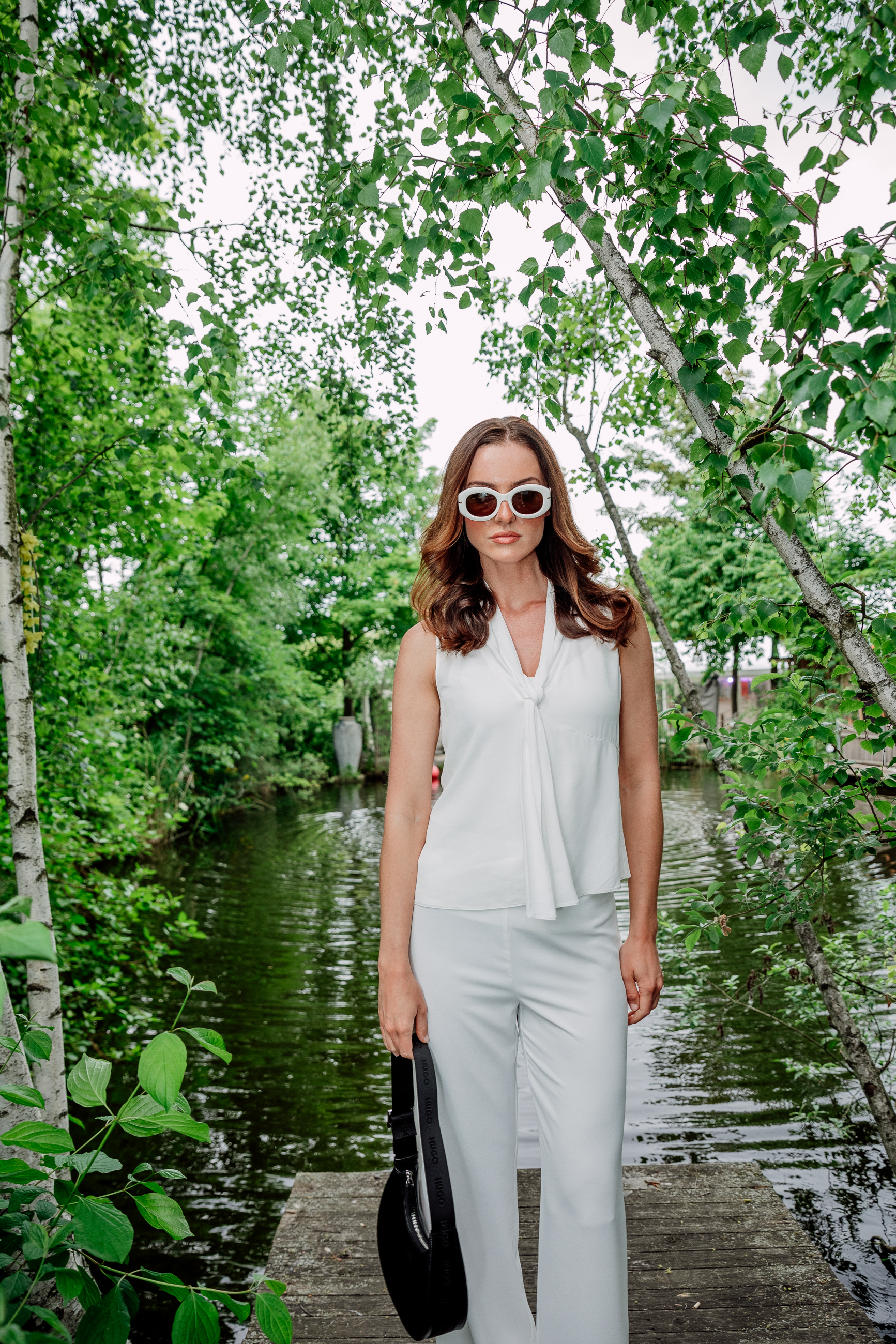 Minimalismus trifft auf moderne Raffinesse: Dieses Outfit beweist, dass Weiß nie langweilig, sondern immer eine stilvolle Entscheidung ist. Die fließende, ärmellose Bluse mit geknotetem Kragenausschnitt verleiht dem Look eine feminine Note – verspielt und dennoch klar strukturiert. Die weite, elegante Hose greift die Leichtigkeit des Oberteils auf und schafft ein harmonisches Gesamtbild, das sowohl lässig als auch edel wirkt.