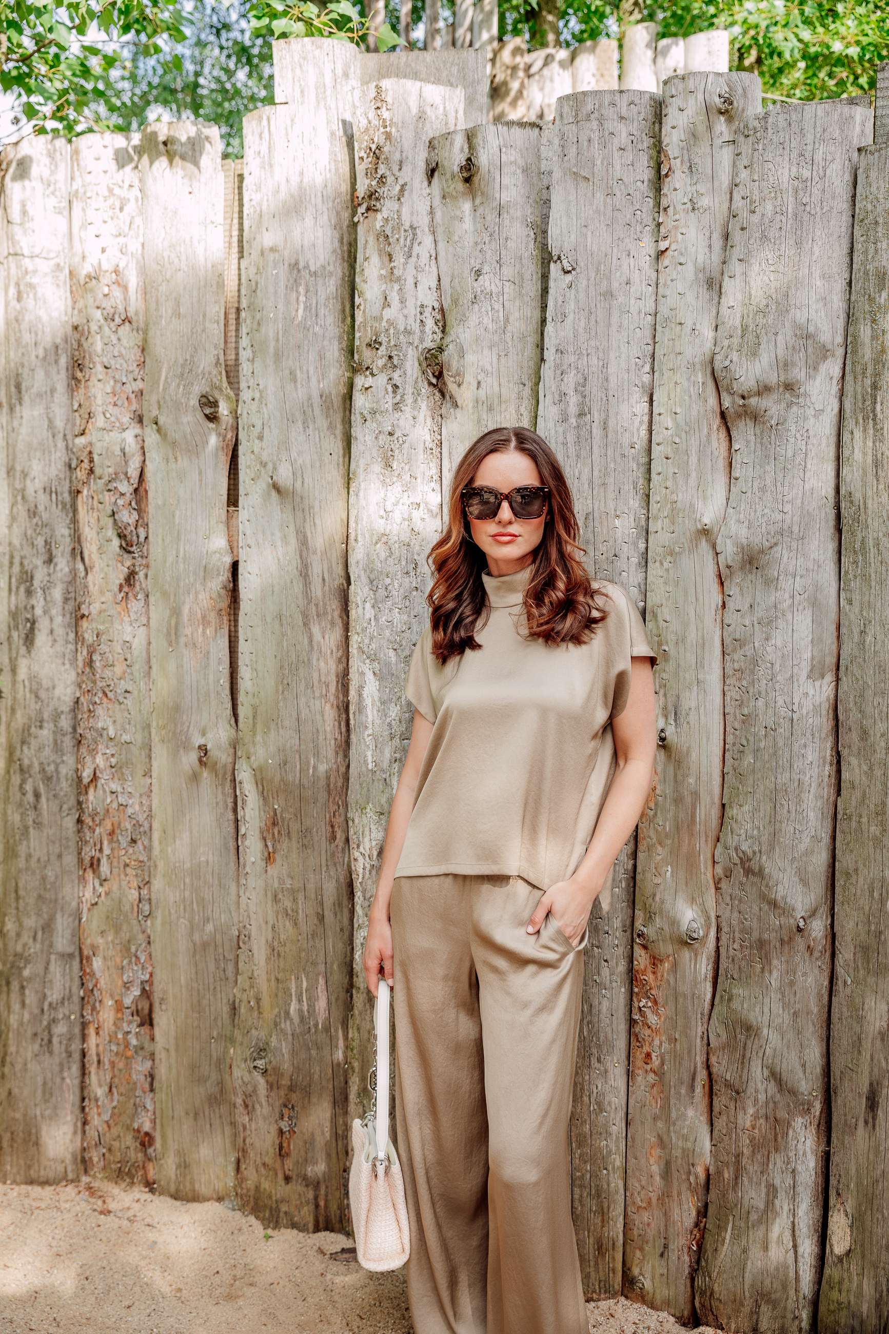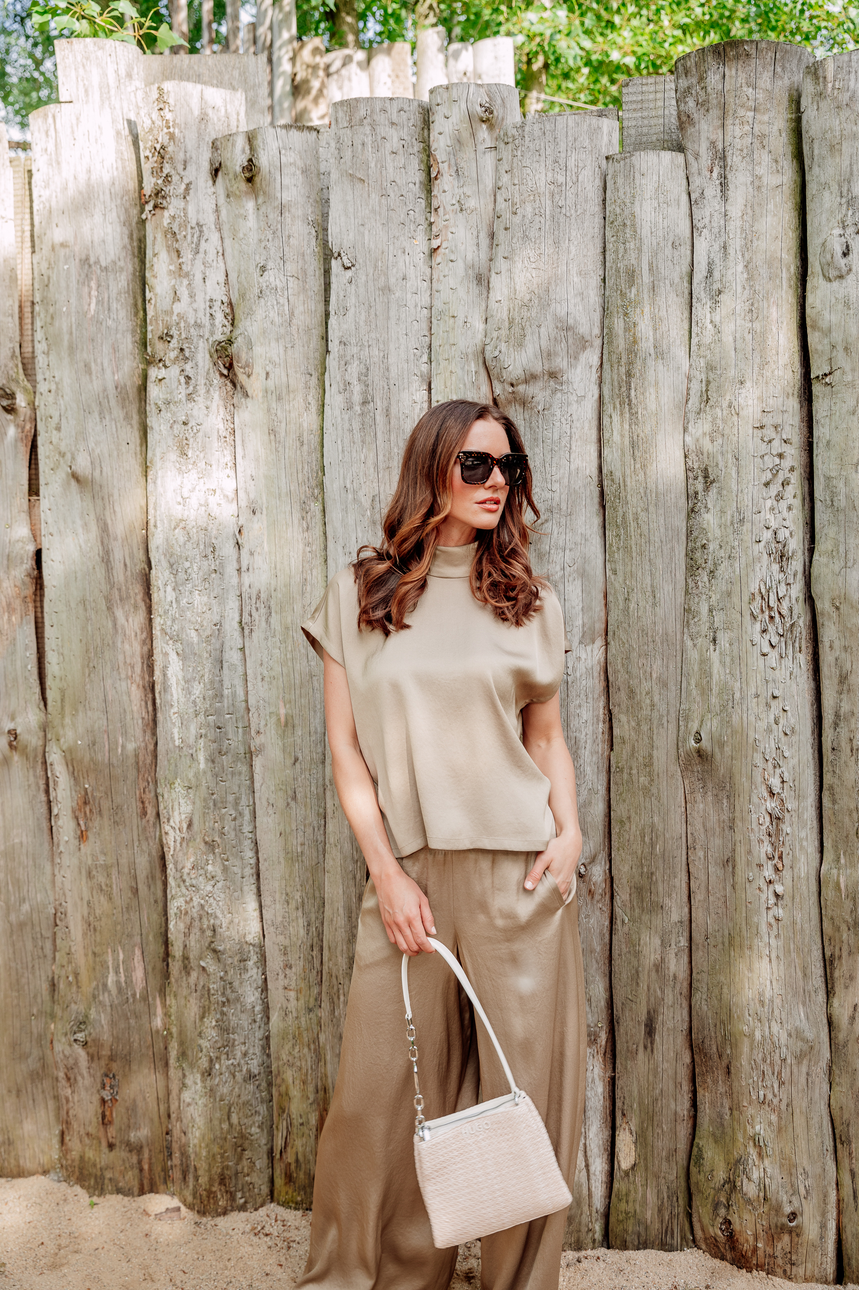 Inmitten von Sonnenlicht und Sand zeigt sich der Sommer von seiner ruhigen Seite. Das fließende Ensemble in warmen Naturtönen vereint Komfort mit Raffinesse – ideal für entspannte Stunden mit Stilbewusstsein. Die weiten Hosen und das locker fallende Oberteil umschmeicheln die Silhouette, während dezente Accessoires wie die Sonnenbrille von VICTORIA BECKHAM und die schlichte Tasche von HUGO Womenswear den Look modern und urban halten. Ein Outfit, das zeigt: Mode darf leicht, lässig und dennoch ausdrucksstark sein.