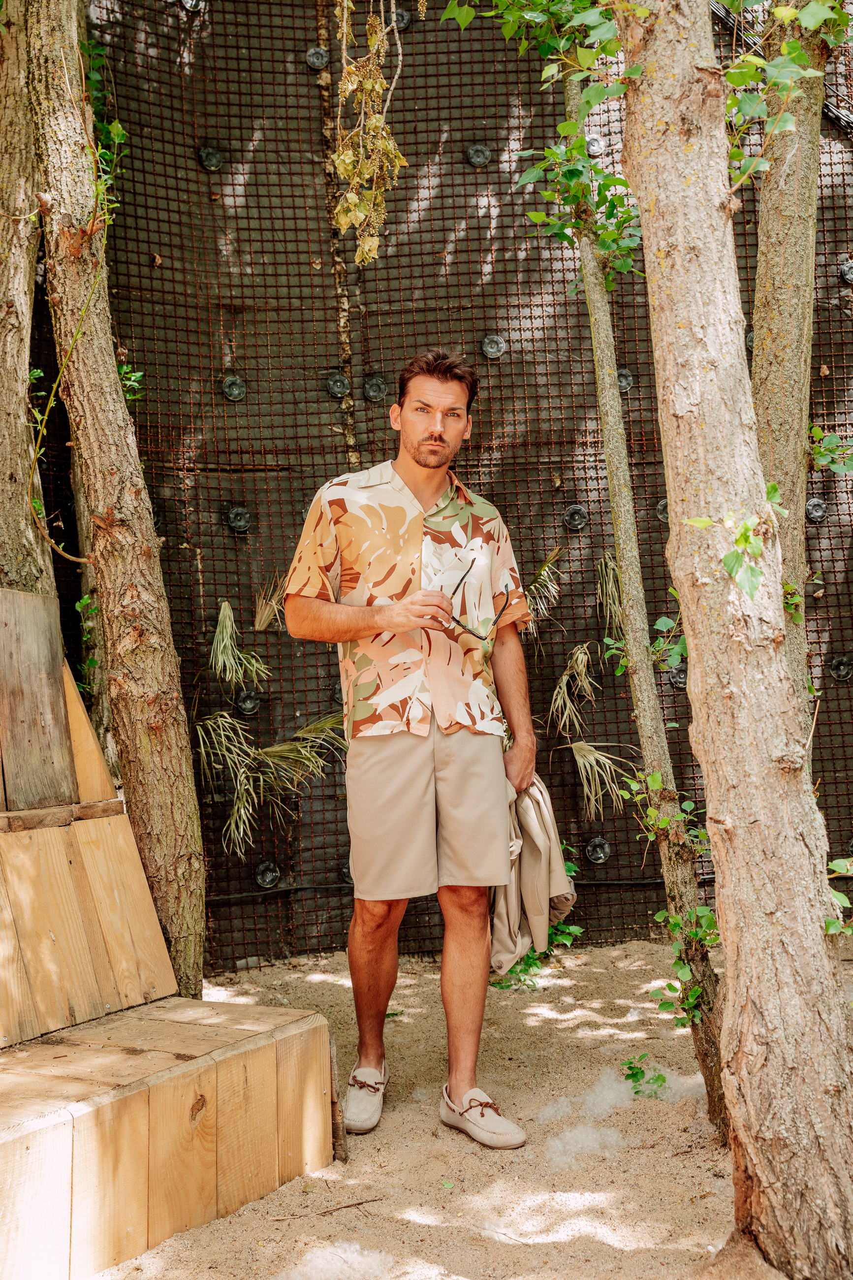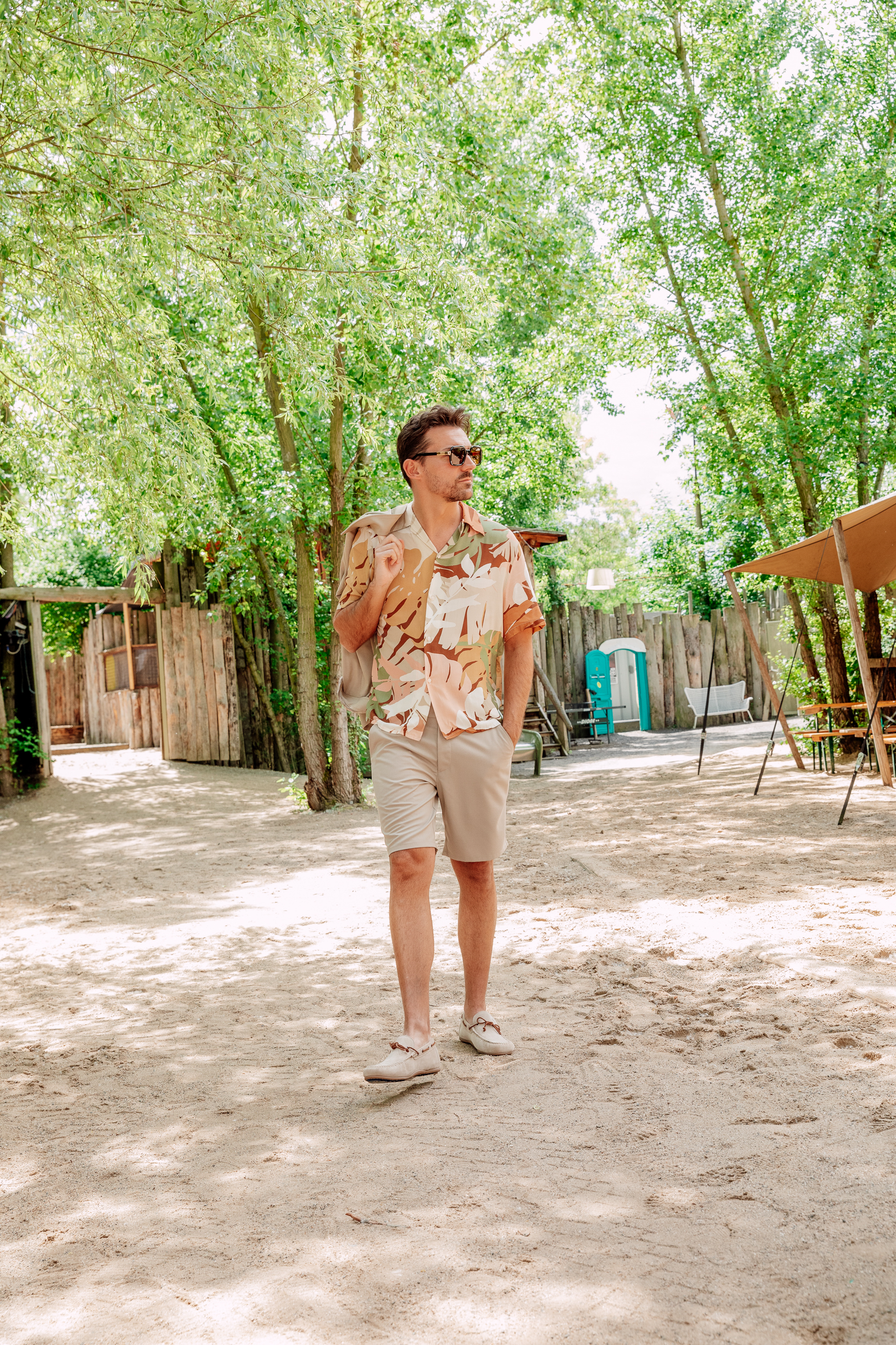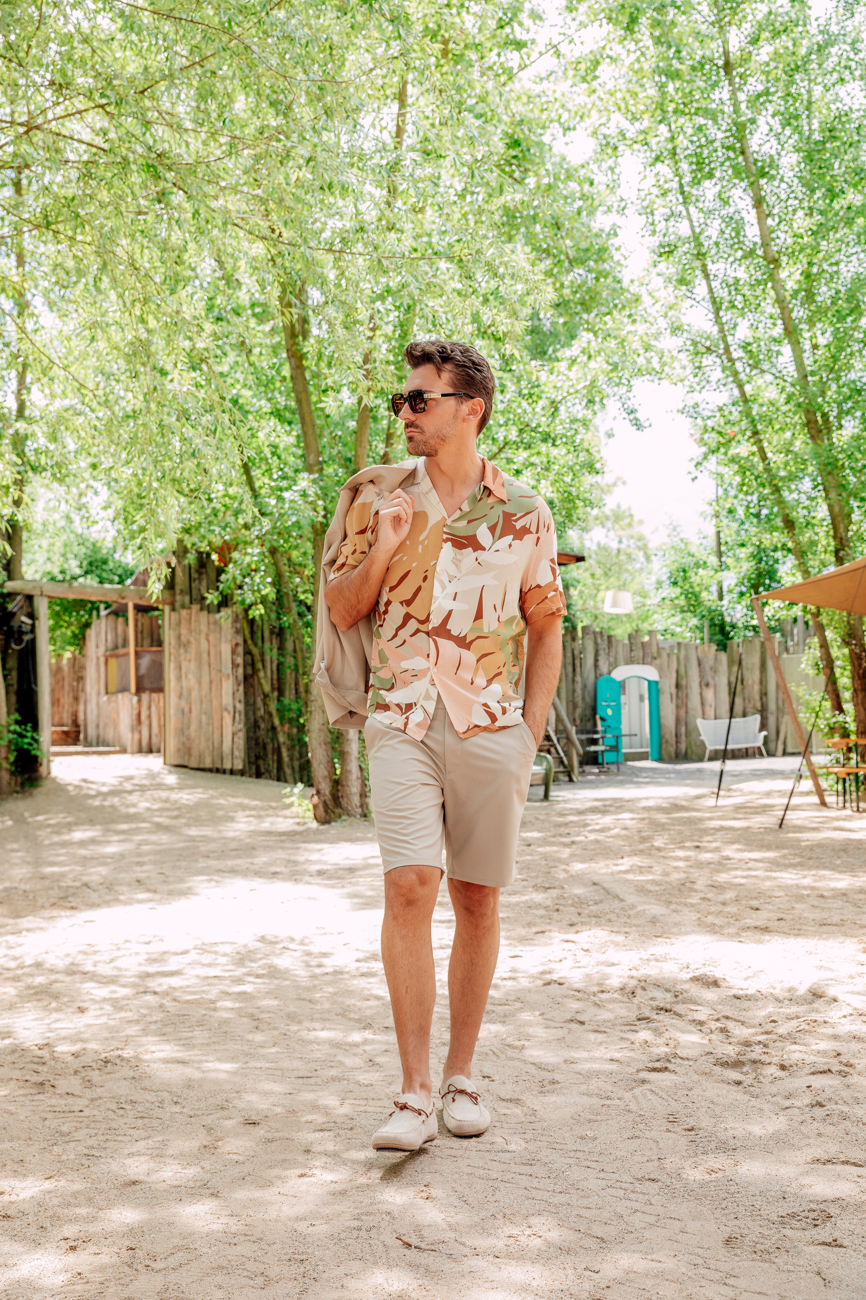 Stilbewusst durch den Tag: Dieser Look kombiniert klassische Neutraltöne mit tropischem Statement. Die beigefarbene Overshirt-Jacke mit aufgesetzten Taschen verleiht dem Outfit eine cleane Struktur, während das gemusterte Hemd mit Palmenprint sommerliche Leichtigkeit bringt. Die passenden Shorts unterstreichen den minimalistischen Ton des Looks und halten ihn dabei smart und relaxed. Abgerundet wird das Ensemble durch stilvolle Loafer in hellem Leder – die perfekte Balance zwischen Nonchalance und Klasse.