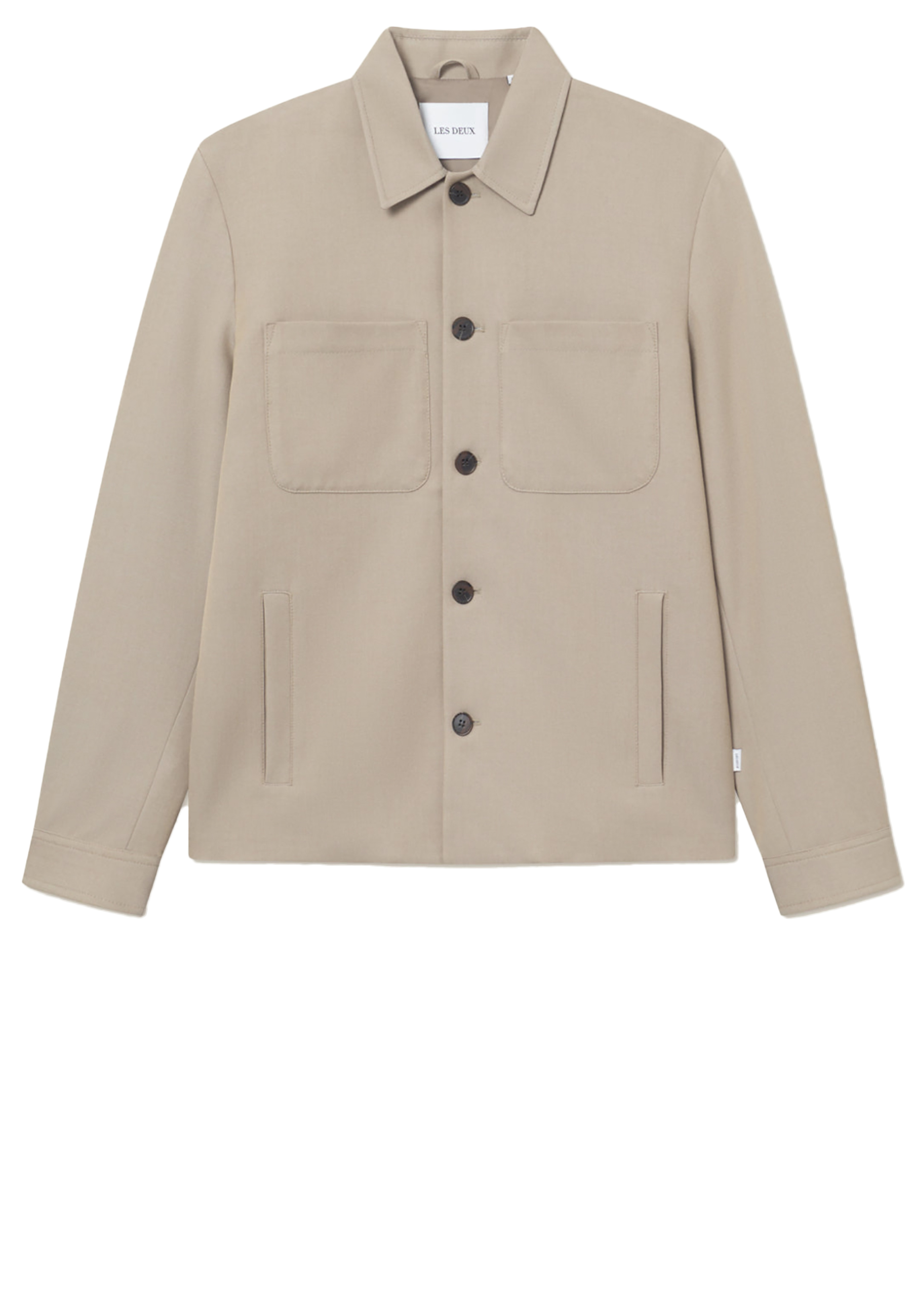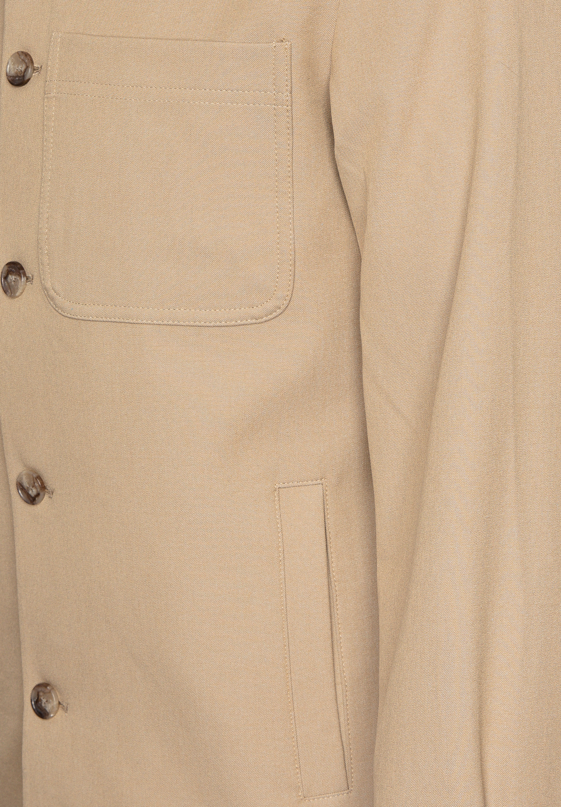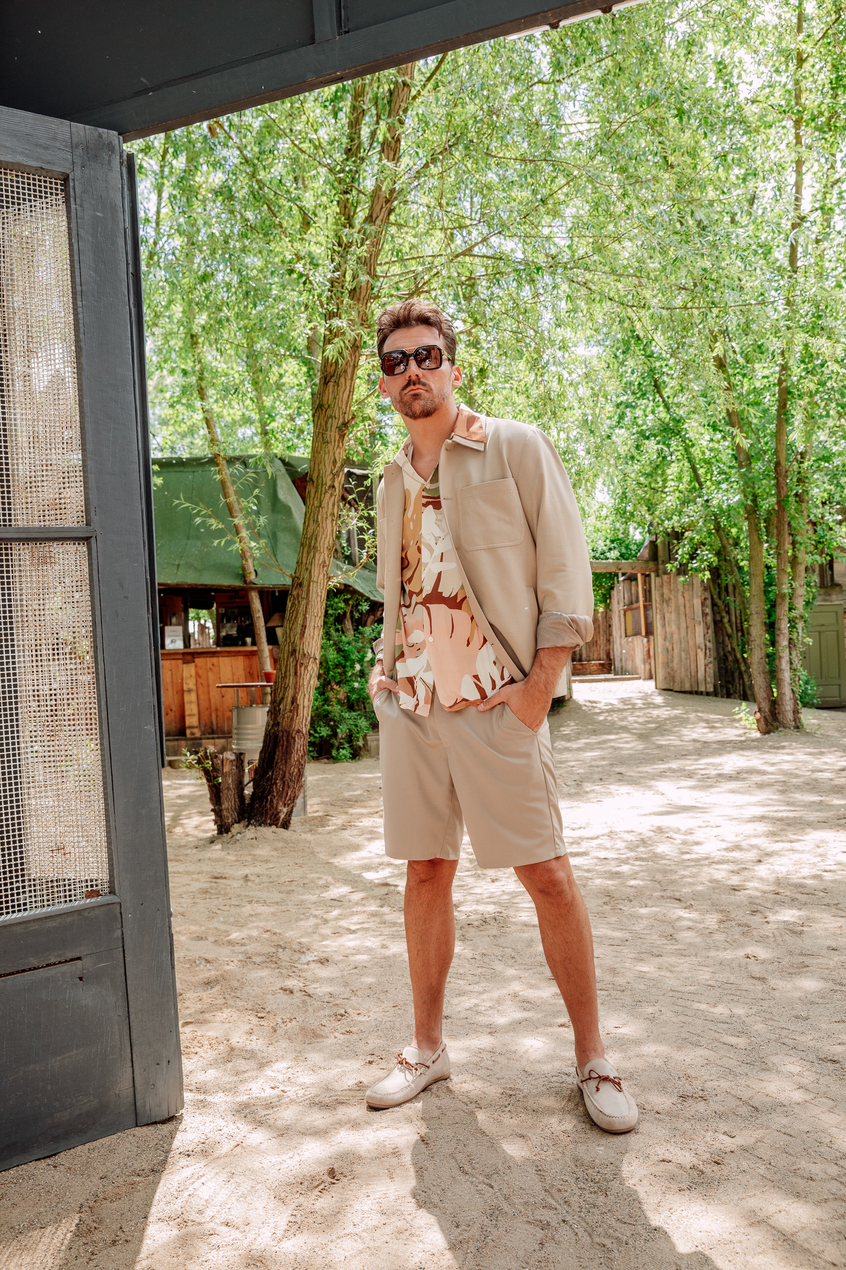 Stilbewusst durch den Tag: Dieser Look kombiniert klassische Neutraltöne mit tropischem Statement. Die beigefarbene Overshirt-Jacke mit aufgesetzten Taschen verleiht dem Outfit eine cleane Struktur, während das gemusterte Hemd mit Palmenprint sommerliche Leichtigkeit bringt. Die passenden Shorts unterstreichen den minimalistischen Ton des Looks und halten ihn dabei smart und relaxed. Abgerundet wird das Ensemble durch stilvolle Loafer in hellem Leder – die perfekte Balance zwischen Nonchalance und Klasse.