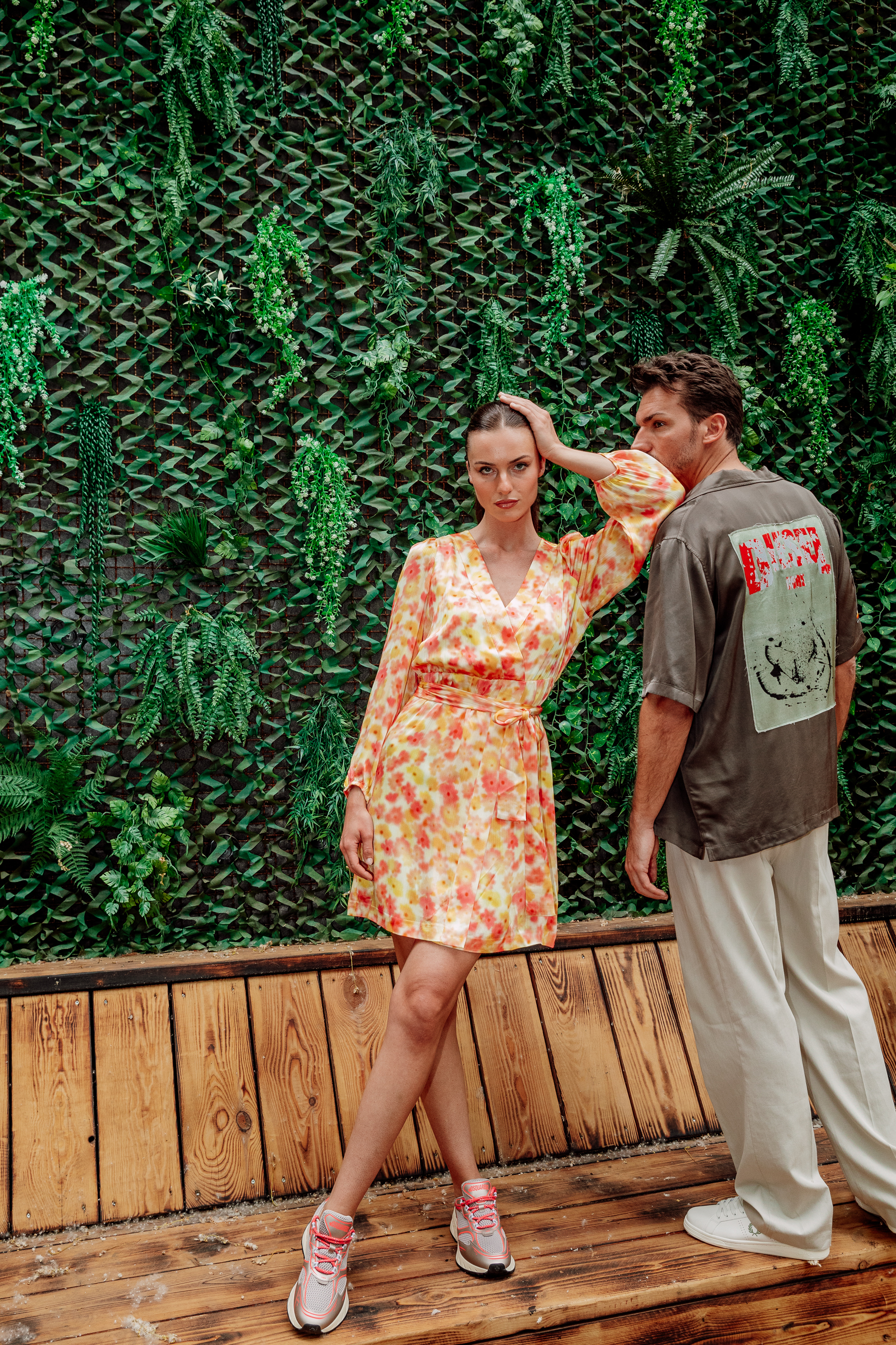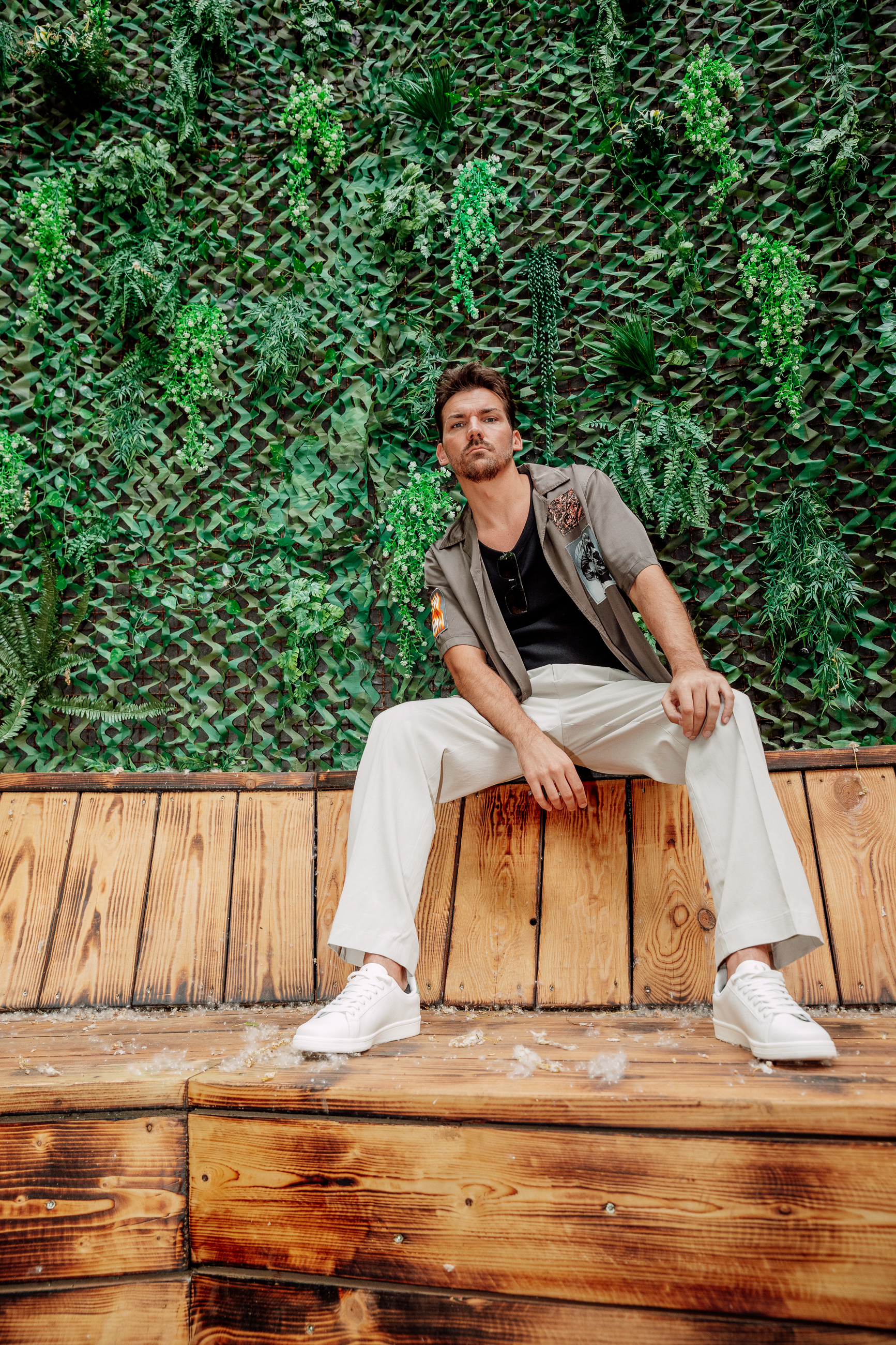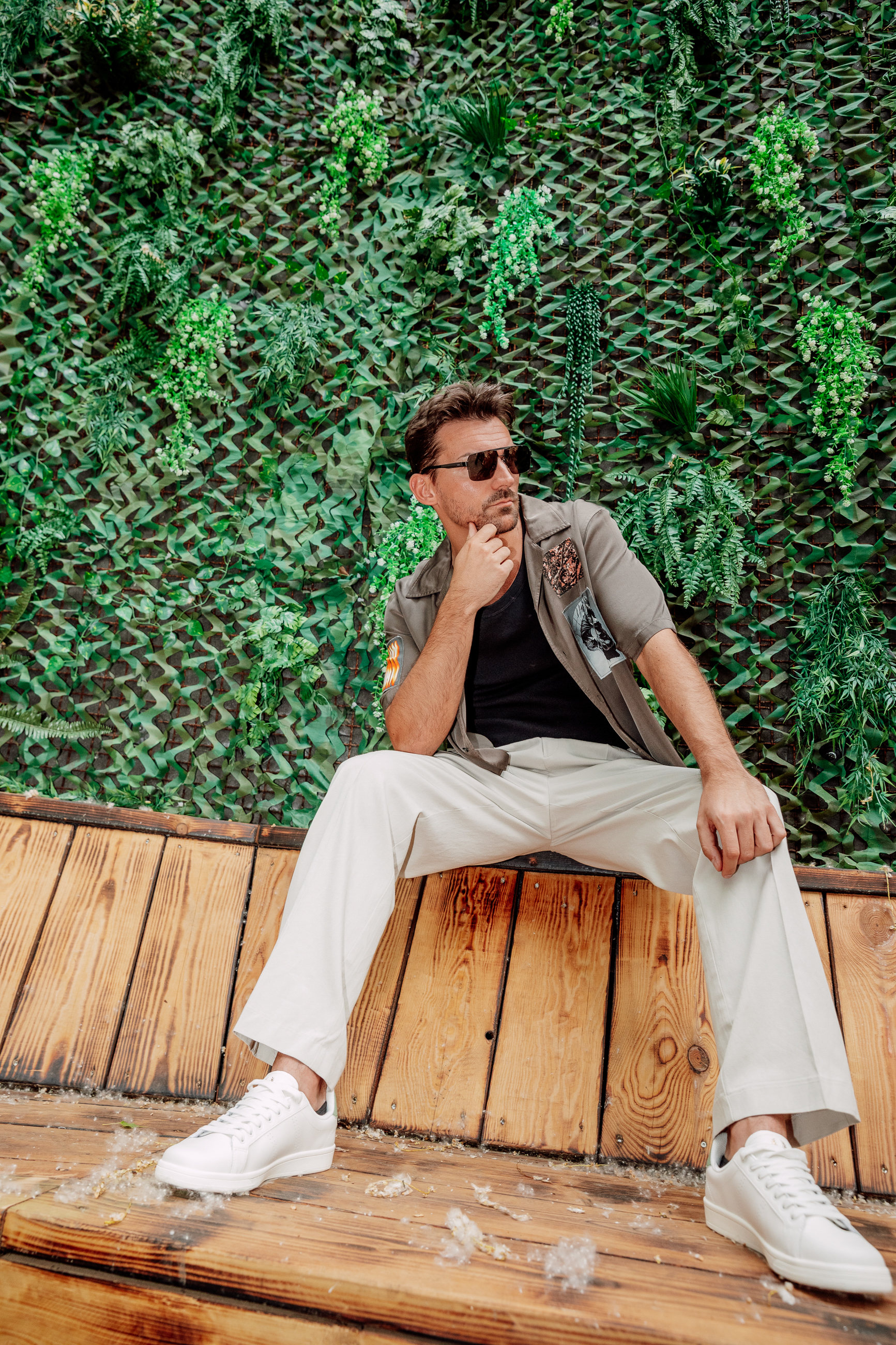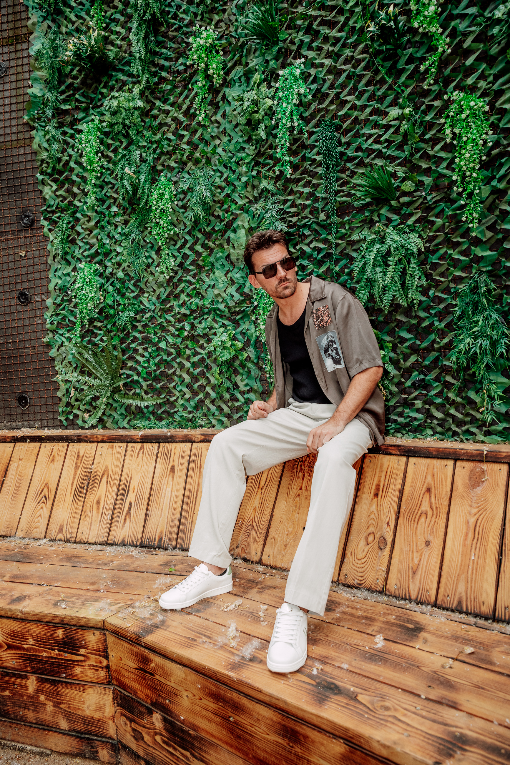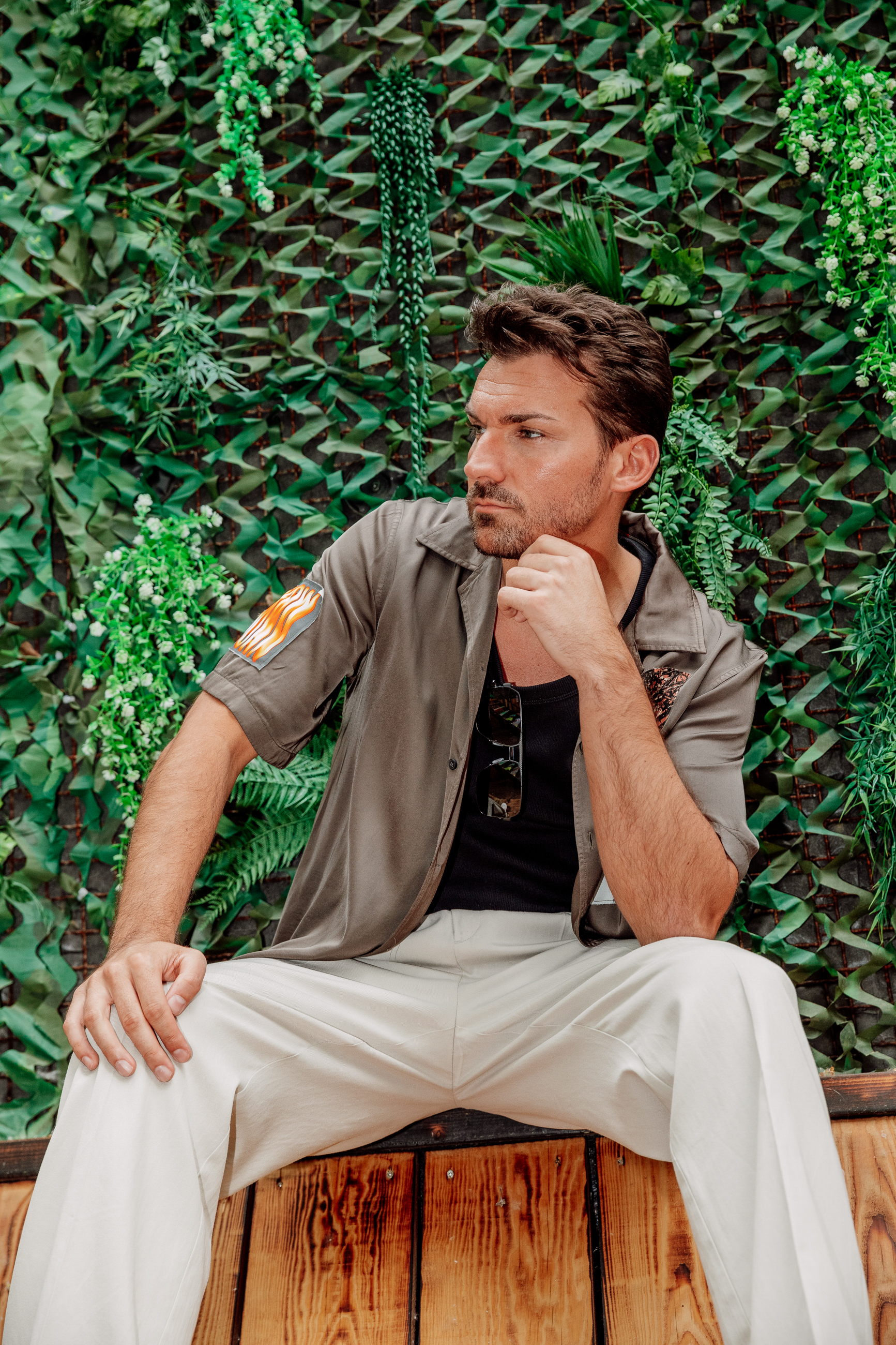 Mitten im Großstadtdschungel trifft entspannter Streetstyle auf urbane Eleganz. Das lässig geschnittene Hemd mit Print-Details sorgt für einen markanten Look, der Individualität ausstrahlt, ohne laut zu sein. Kombiniert mit einem schlichten schwarzen Shirt und hellen, weit fallenden Stoffhosen entsteht ein ausgewogenes Spiel zwischen Coolness und Understatement. Weiße Sneaker setzen ein cleanes Finish, während die dunkle Sonnenbrille dem Look einen Hauch von Geheimnis verleiht.
