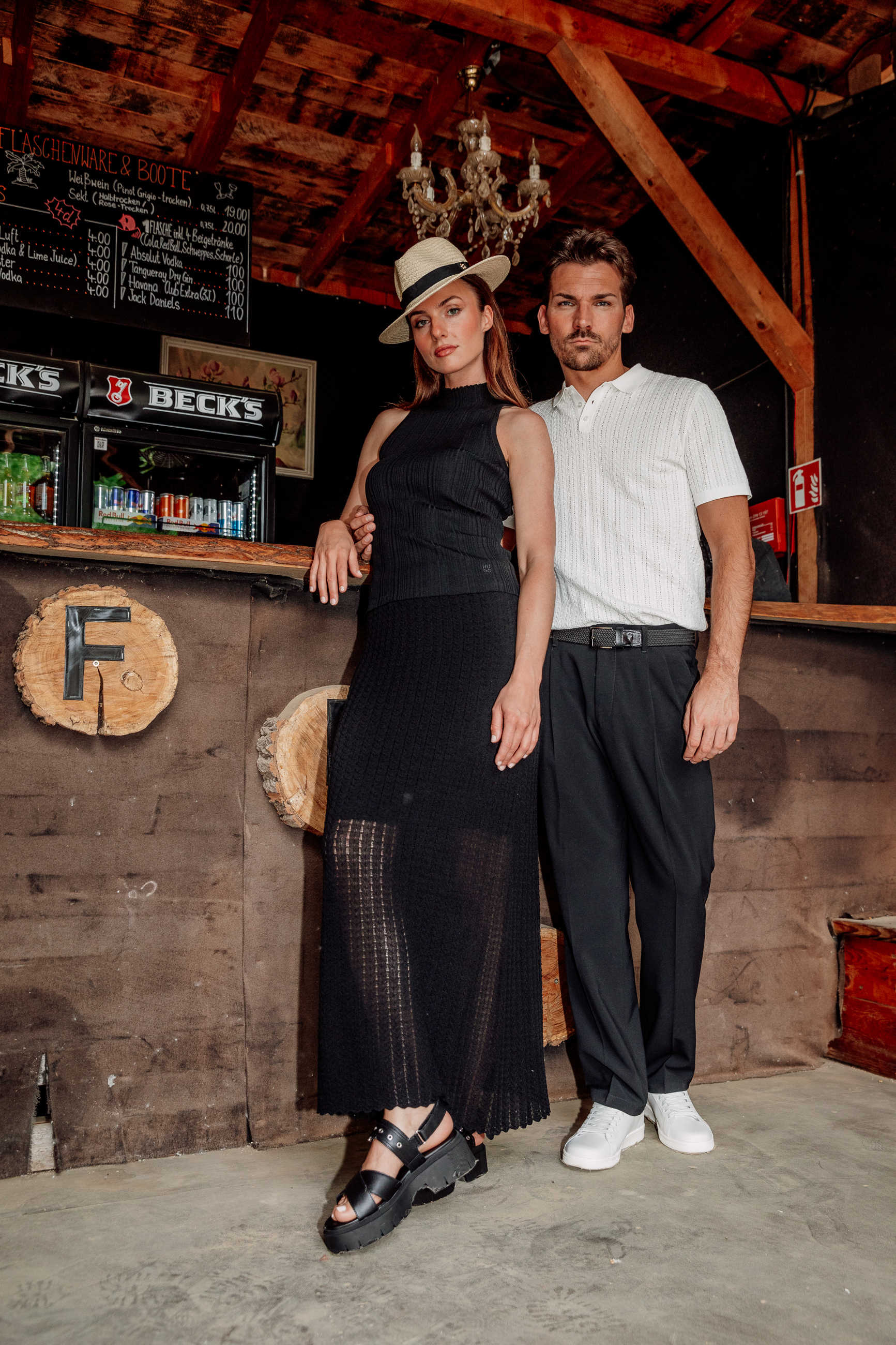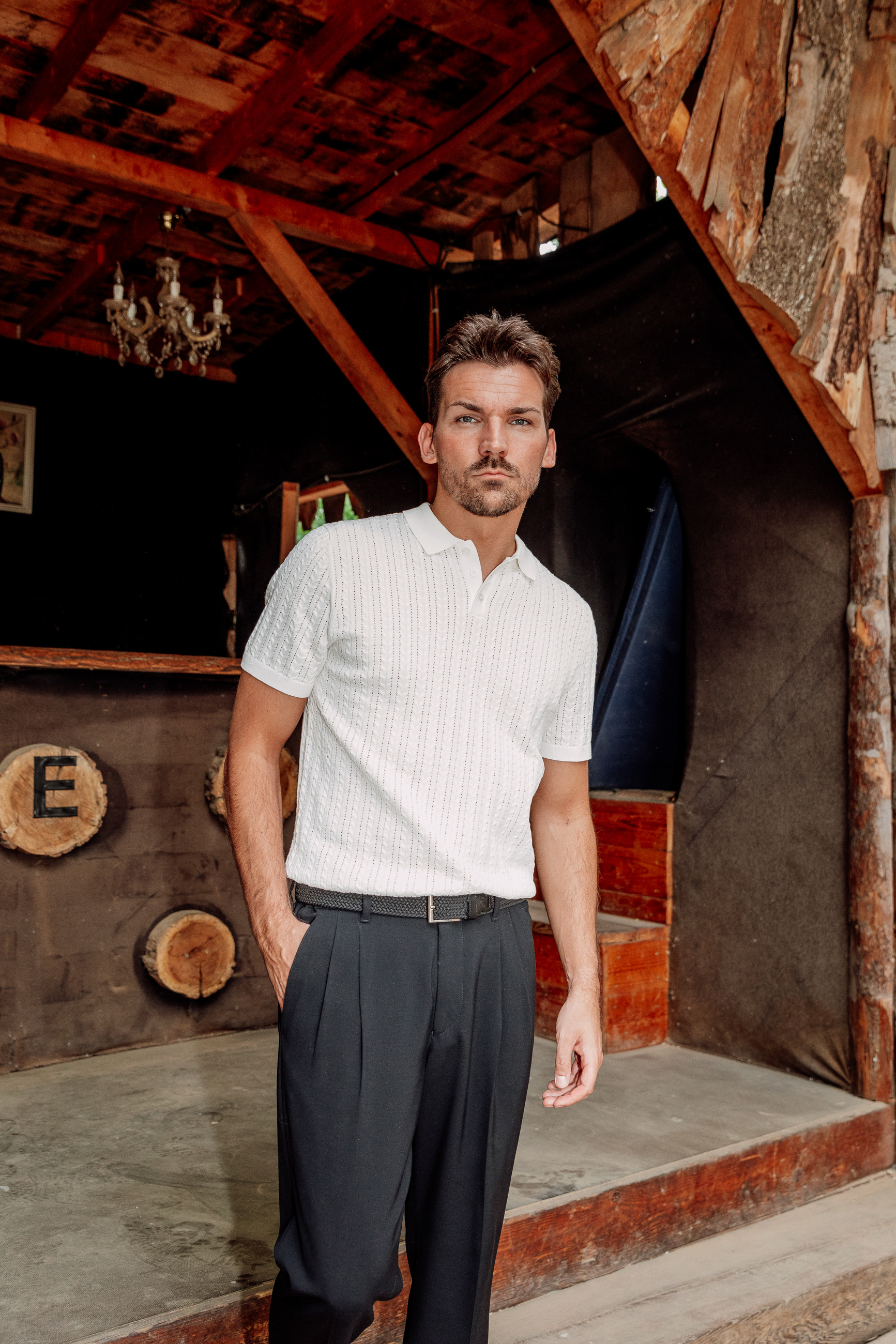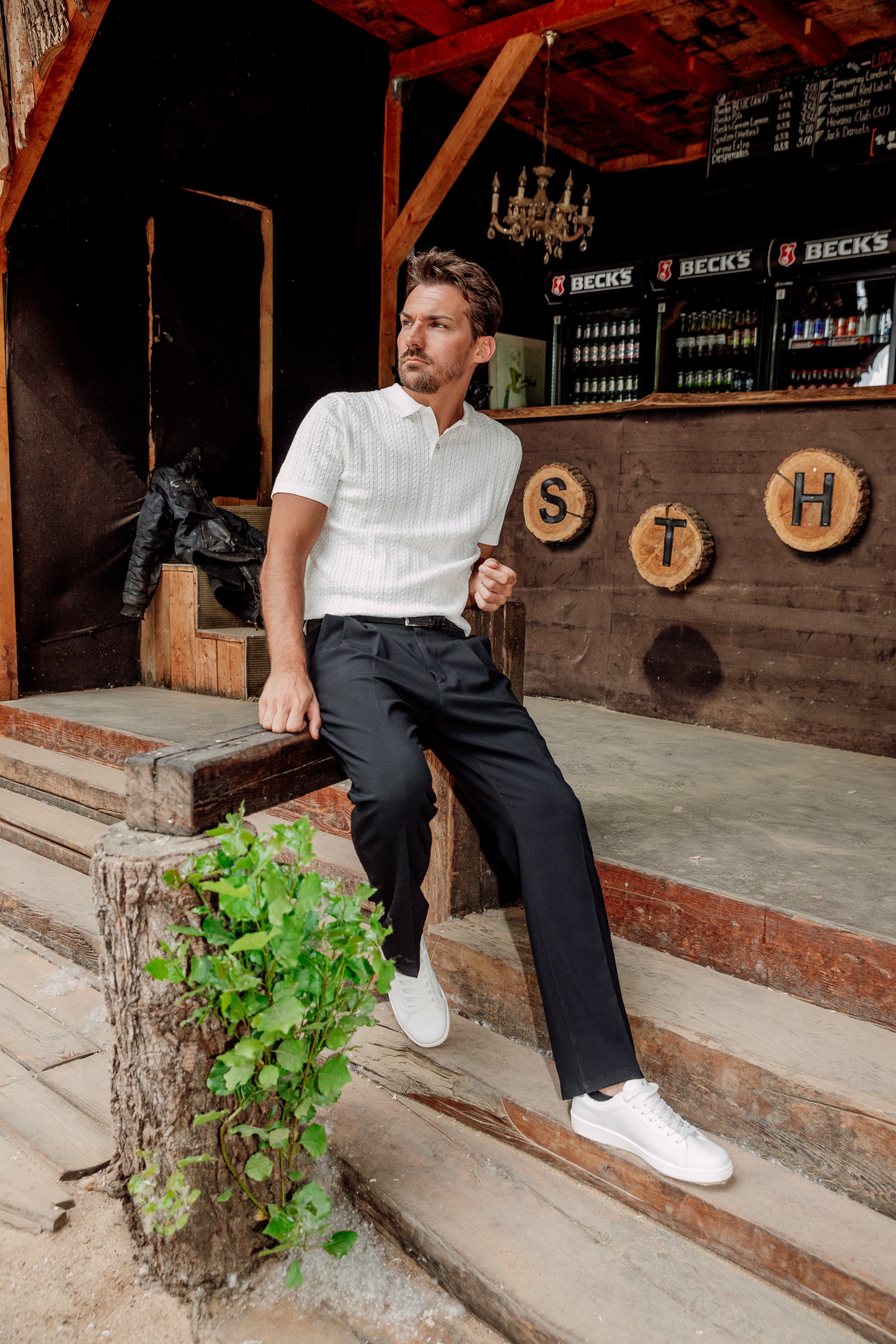 Lässig, aber mit Anspruch: Dieser Look verkörpert modernen Männerschick mit sommerlicher Leichtigkeit. Das weiße Strick-Poloshirt bringt subtile Retro-Vibes in den Alltag und wirkt gleichzeitig elegant und entspannt. Kombiniert mit einer klassischen, schwarzen Stoffhose entsteht ein harmonischer Kontrast – smart, zeitlos, souverän.