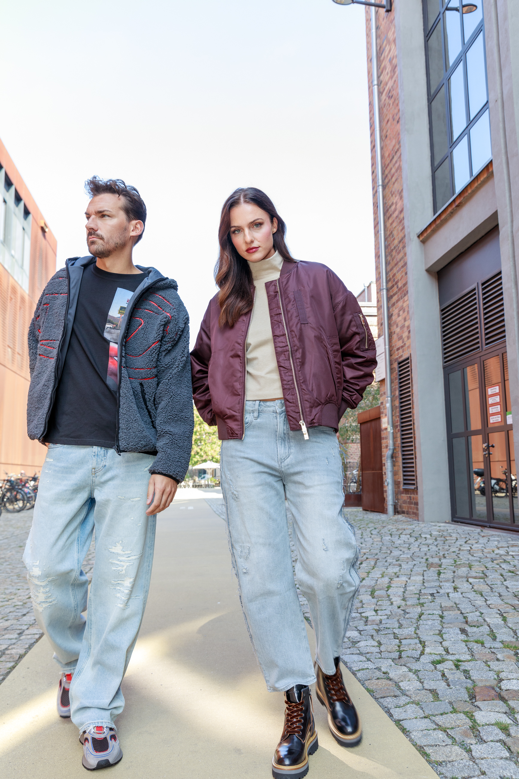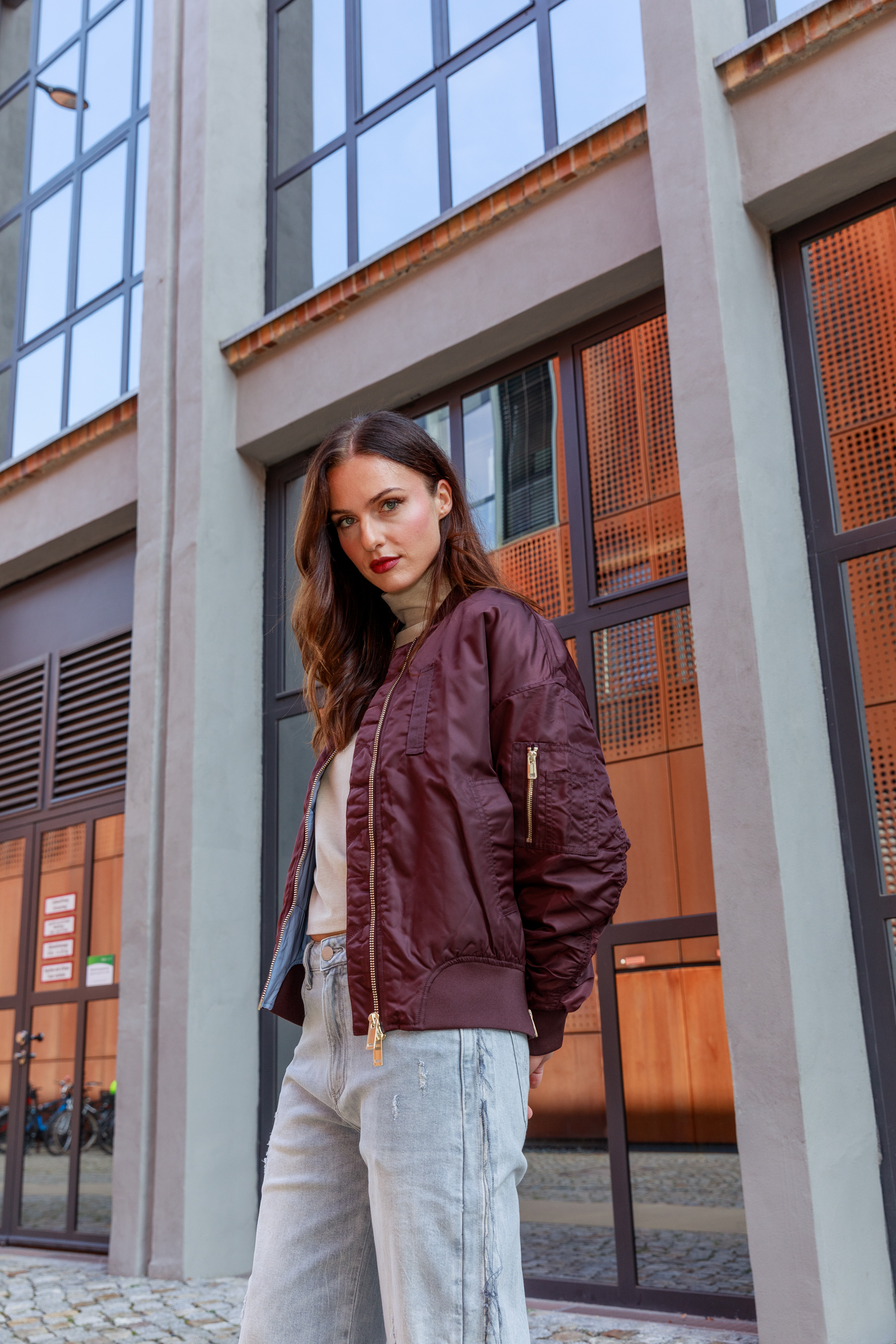 Dieser Look verbindet coole Streetwear-Elemente mit moderner Eleganz. Die locker sitzende, hellblaue Jeans bringt eine entspannte Silhouette, während das cremefarbene Rollkragen-Top für dezente Raffinesse sorgt. Highlight ist die burgunderfarbene Bomberjacke, die dem Outfit Tiefe und Charakter verleiht.