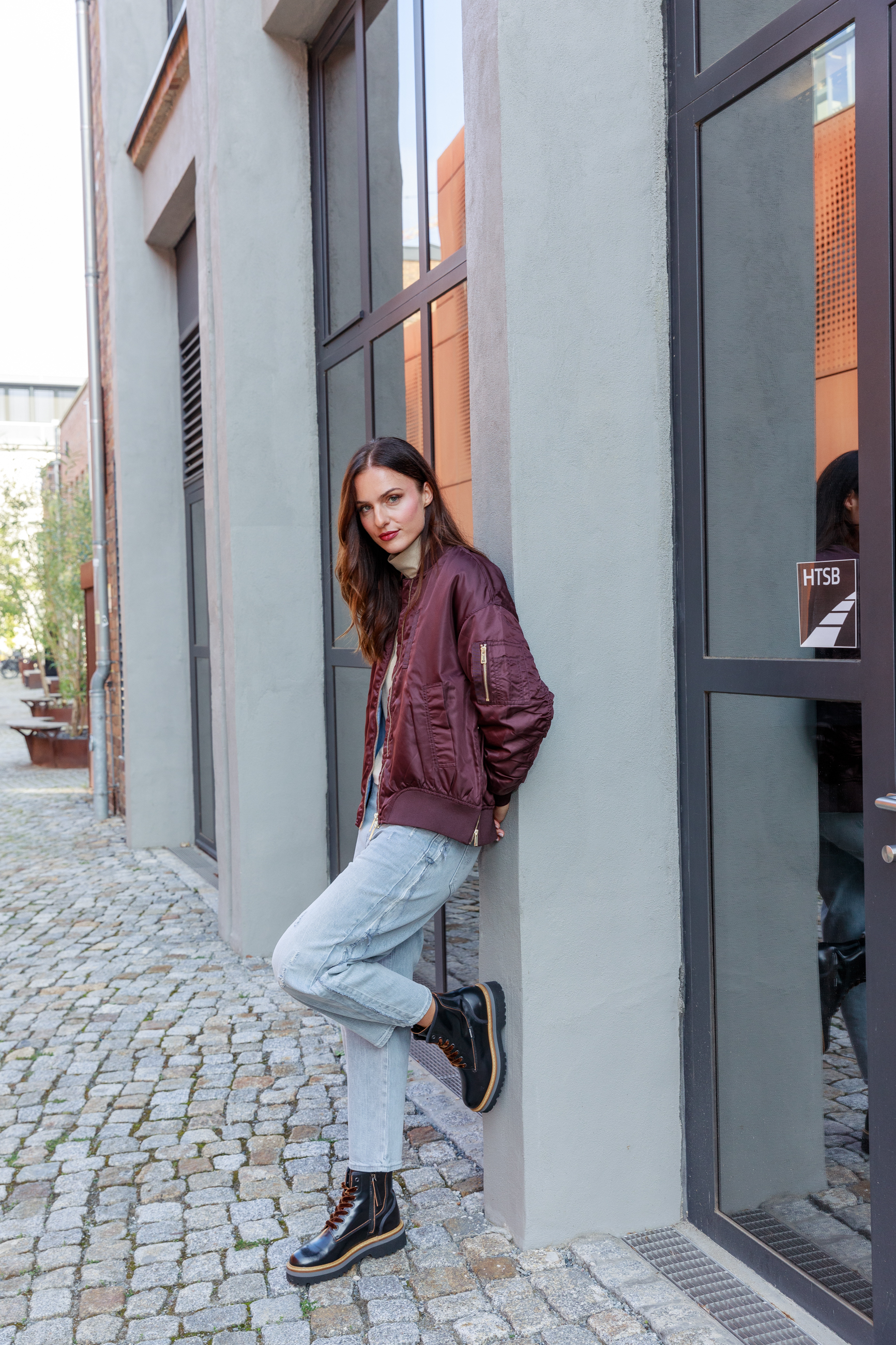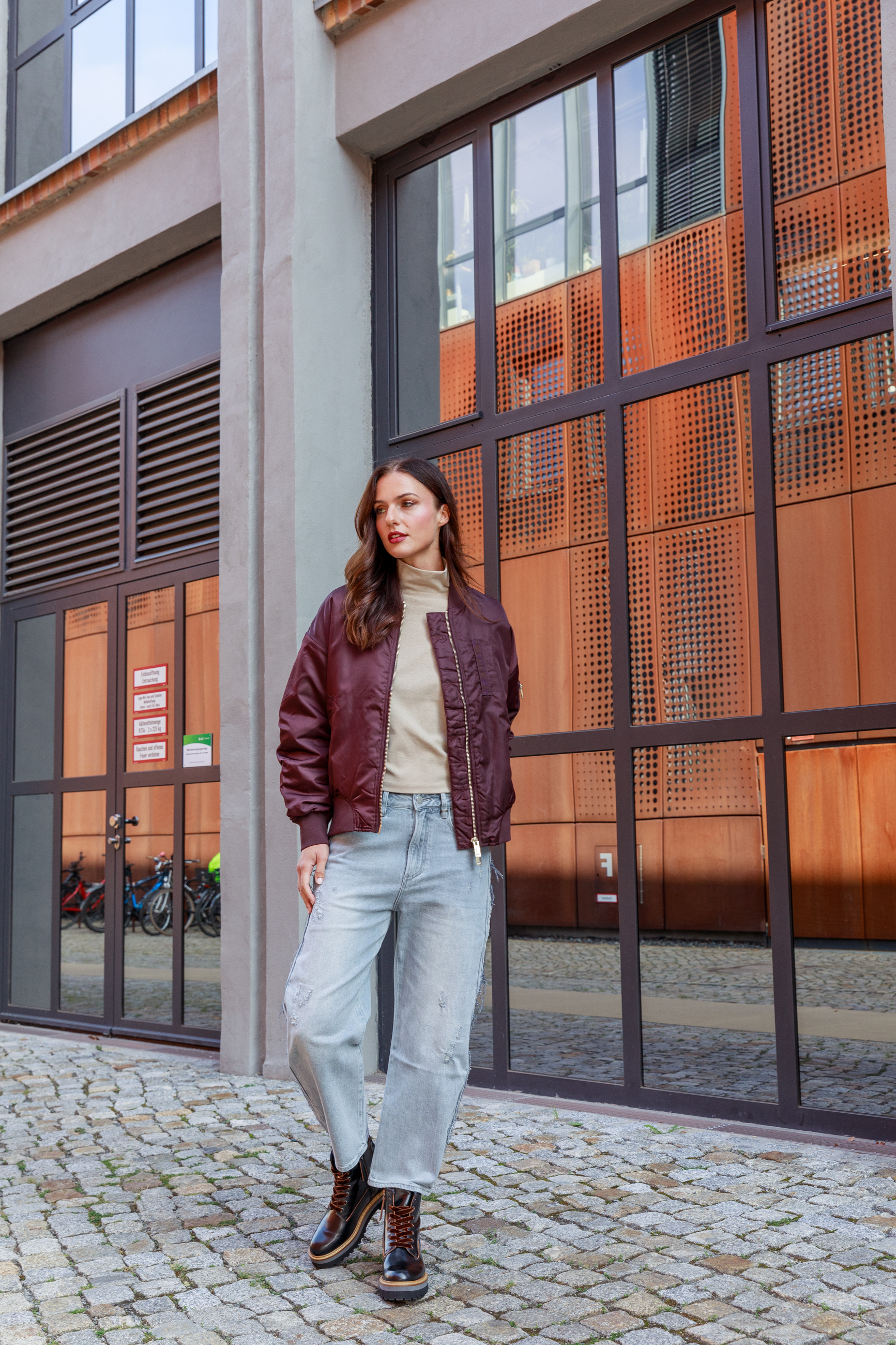 Key-Pieces: Burgunderfarbene Bomberjacke, hellblaue Relaxed-Fit-Jeans, cremefarbenes Rollkragen-Top, schwarze Leder-Schnürboots.