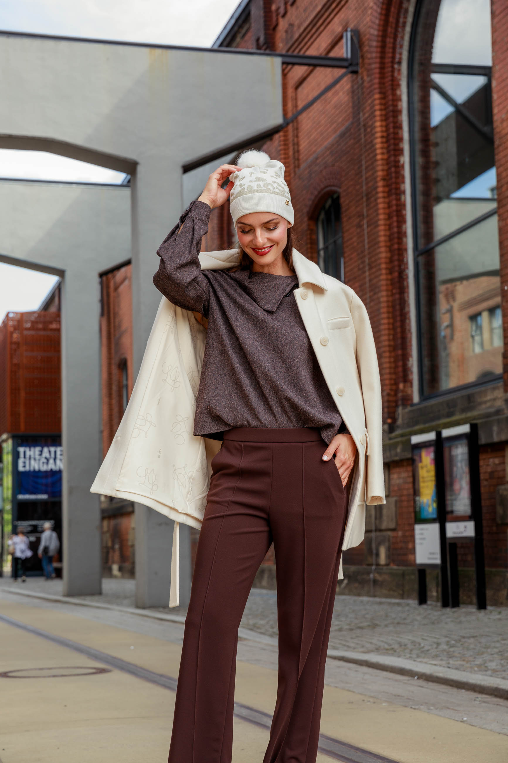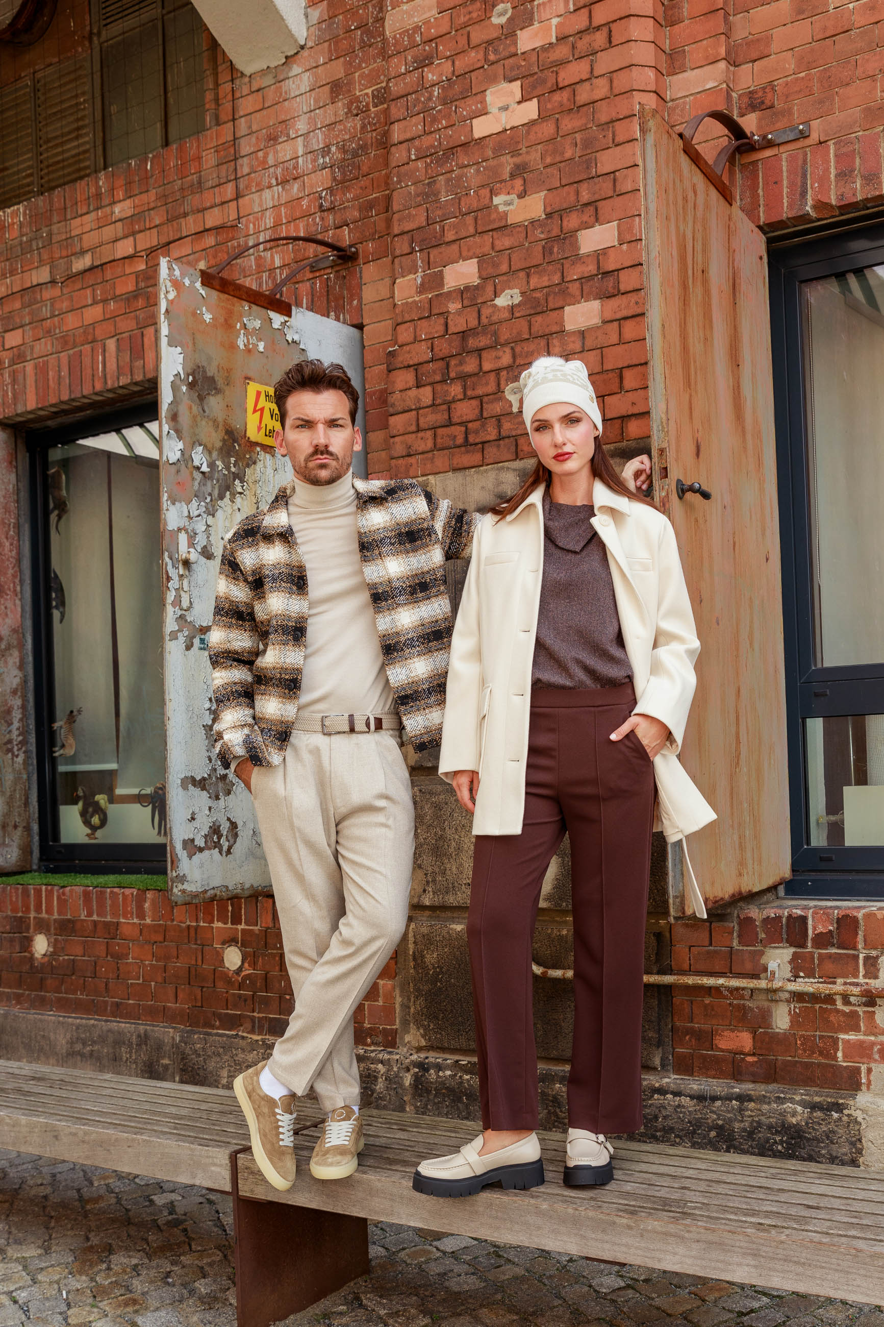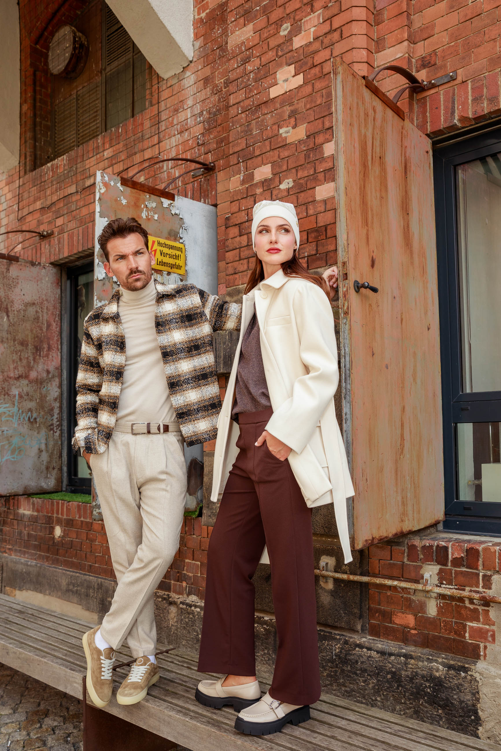 Zeitlos modern: Dieser Look in Beige- und Brauntönen vereint elegante Silhouetten mit raffinierten Details. Der Mantel sorgt für Struktur, die braune Bluse mit besonderem Ausschnitt setzt einen dezenten Akzent. Die gerade geschnittene Hose mit Vorderseiten-Naht unterstreicht die klare Linie, während Loafer mit dicker Sohle Komfort und Stil verbinden – perfekt für Herbsttage in der Stadt.