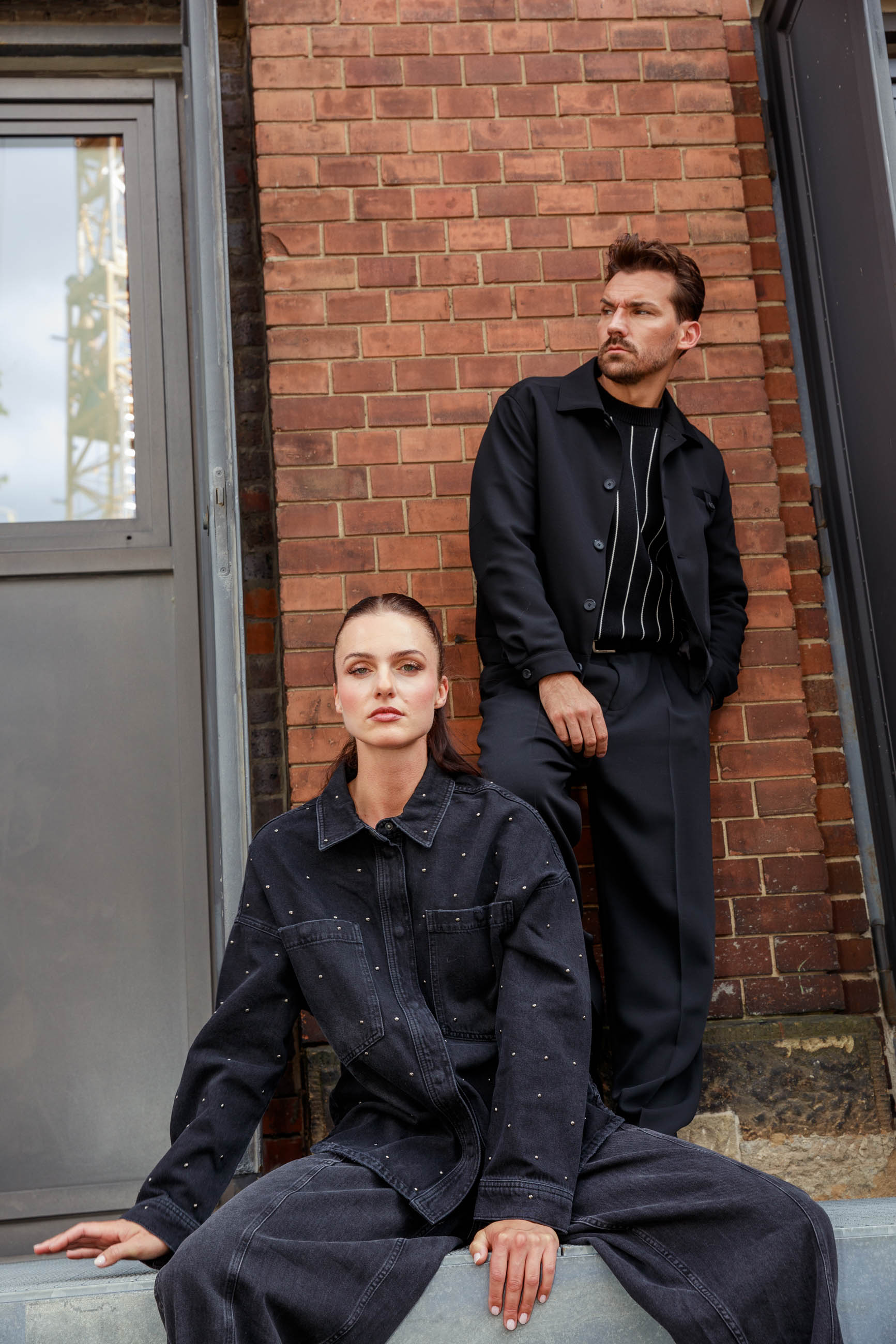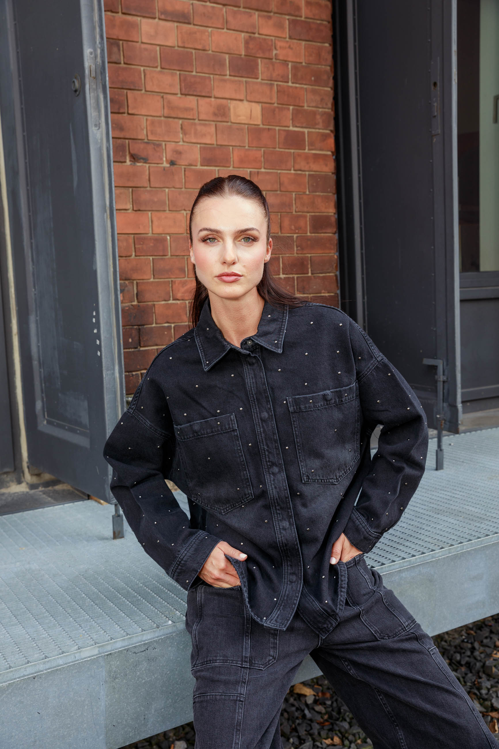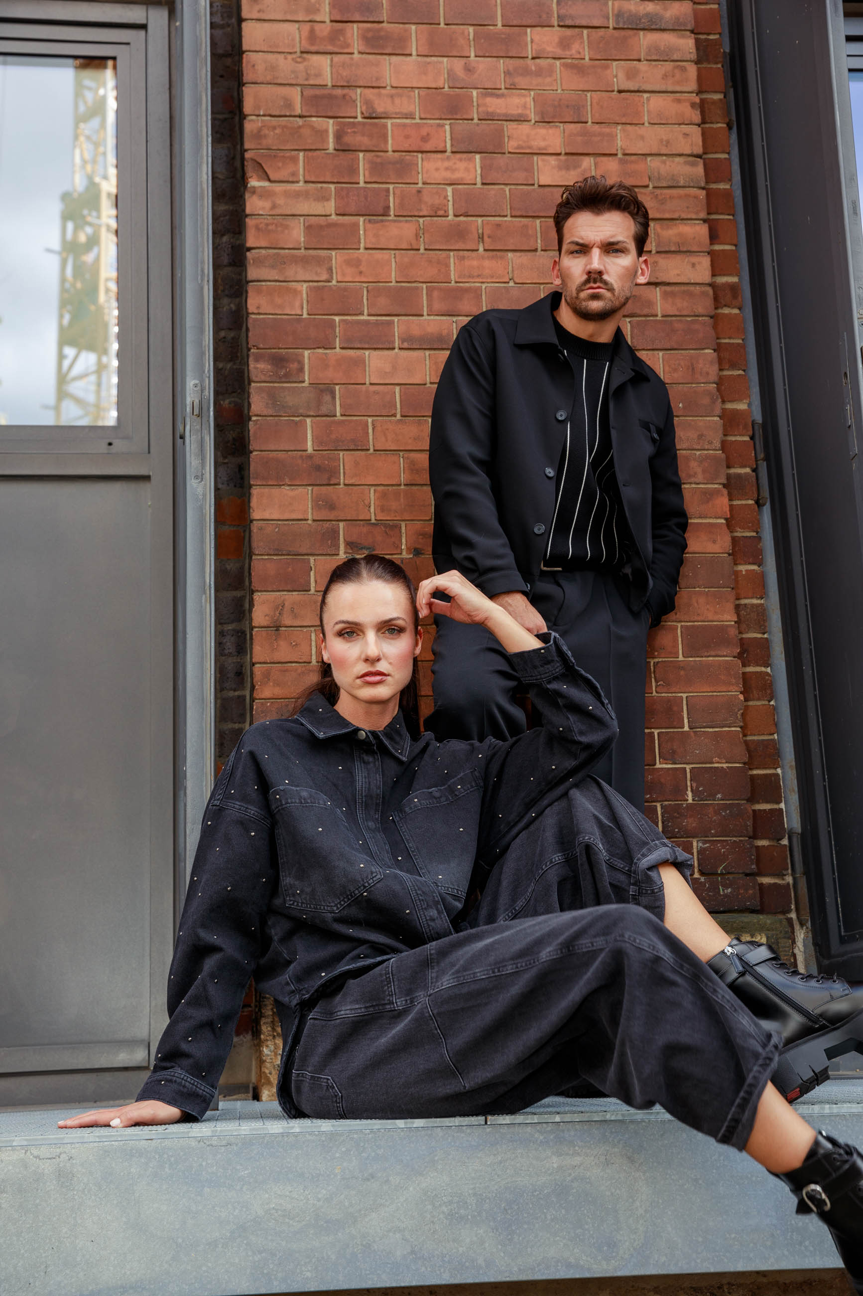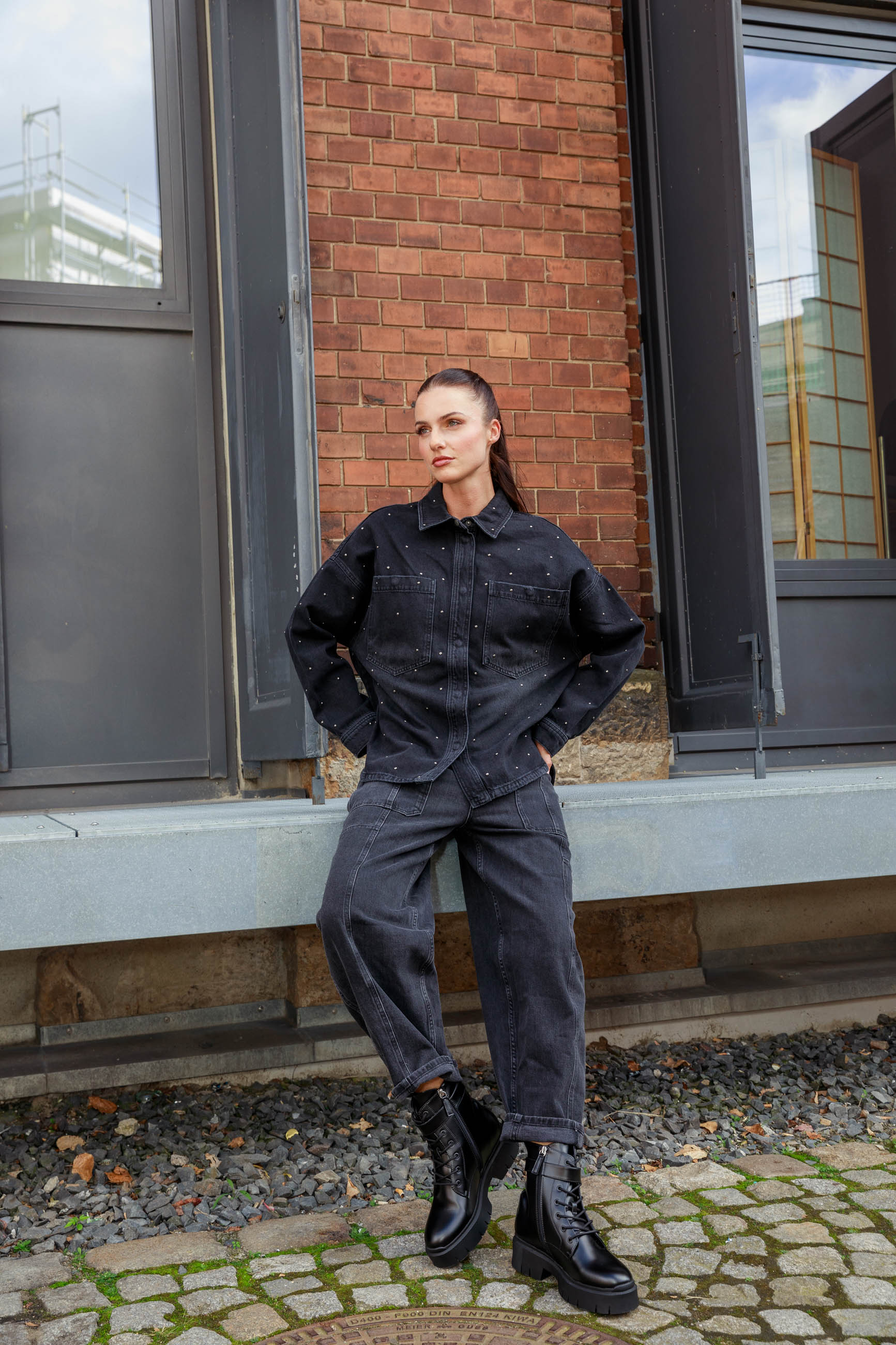 Cool und modern: Dieser All-Black-Look setzt auf Denim mit raffinierten Details. Das locker geschnittene Jeanshemd mit großen Fronttaschen und glänzenden Steinen sorgt für Eyecatcher-Effekte, während die Barrel-Fit Jeans mit Ziernähten eine trendige Silhouette kreiert. Boots mit markanter Chunky-Sohle runden den Look kraftvoll und zeitgemäß ab – perfekt für urbane Auftritte mit Stil.