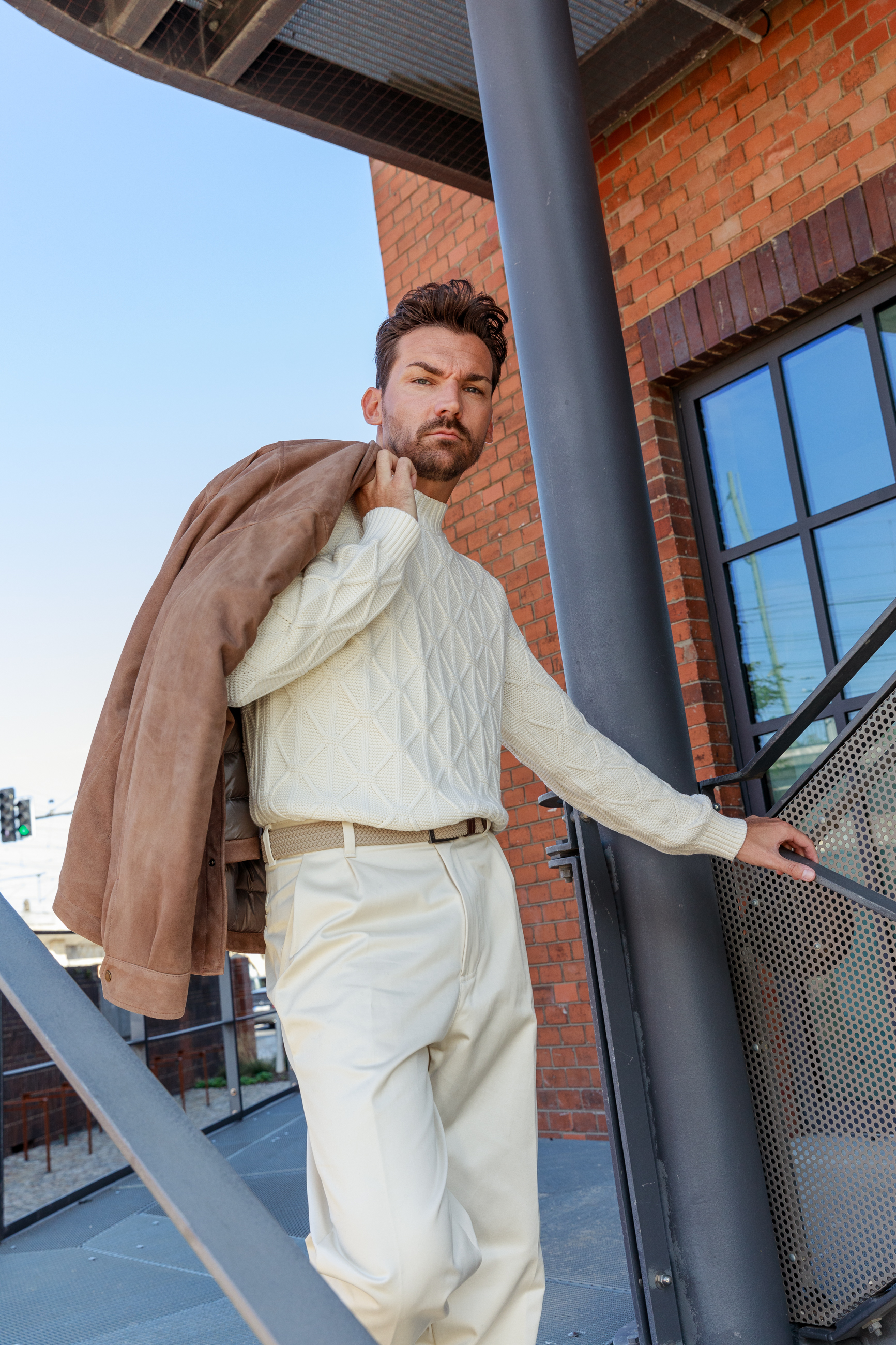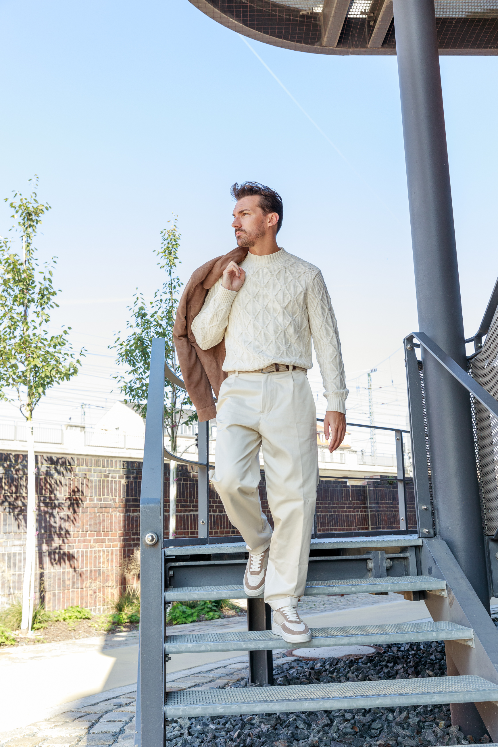 Dieser Look kombiniert hochwertige Materialien mit lässiger Silhouette. Die Lederjacke aus braunem Veloursleder trifft auf einen strukturierten Grobstrickpullover, die Hose sorgt für einen hellen, eleganten Kontrast. Flechtgürtel und Ledermix-Sneaker runden das Outfit dezent-sportlich ab – ideal für stilvolle Tage in der Stadt.