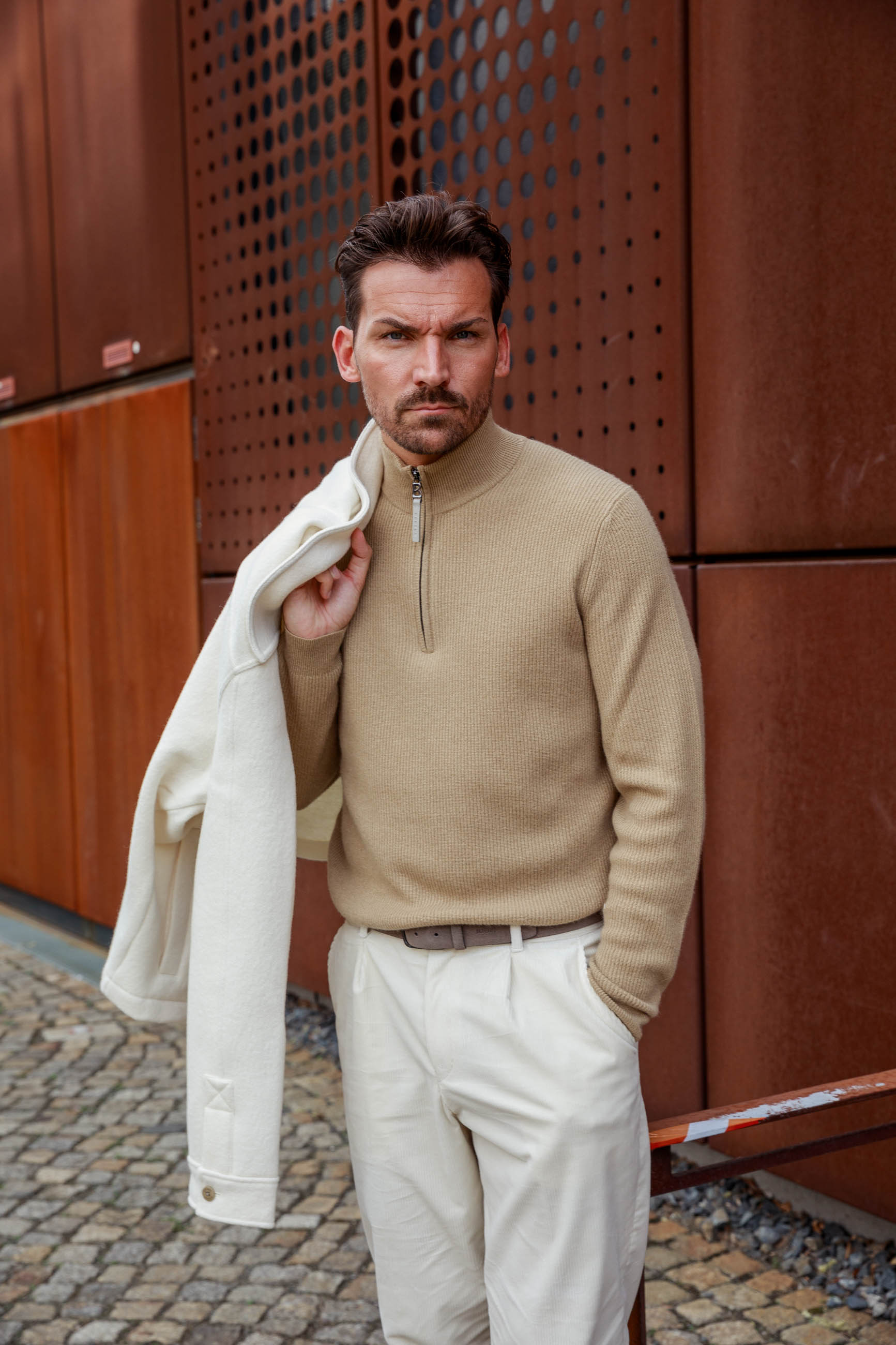 Zeitlos entspannt: Das cremefarbene Overshirt trifft auf einen Half-Zip Strickpullover und schafft so ein Layering voller Komfort und Stil. Die Cord-Hose mit konischer Passform verleiht eine moderne Silhouette, während Schnürboots aus Veloursleder den Look edel abrunden. Perfekt für entspannte Stadtspaziergänge oder stilvolle Freizeitmomente.