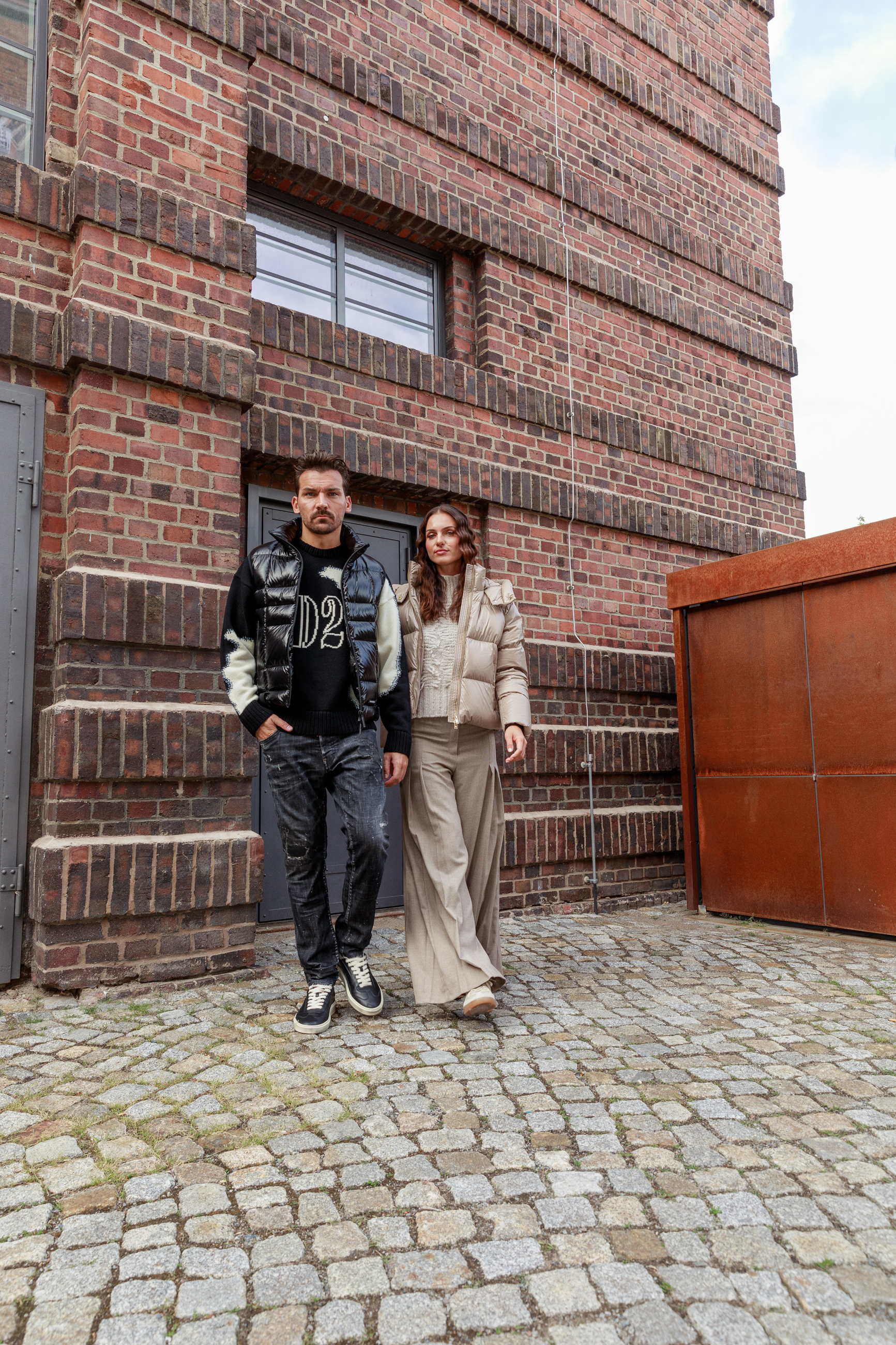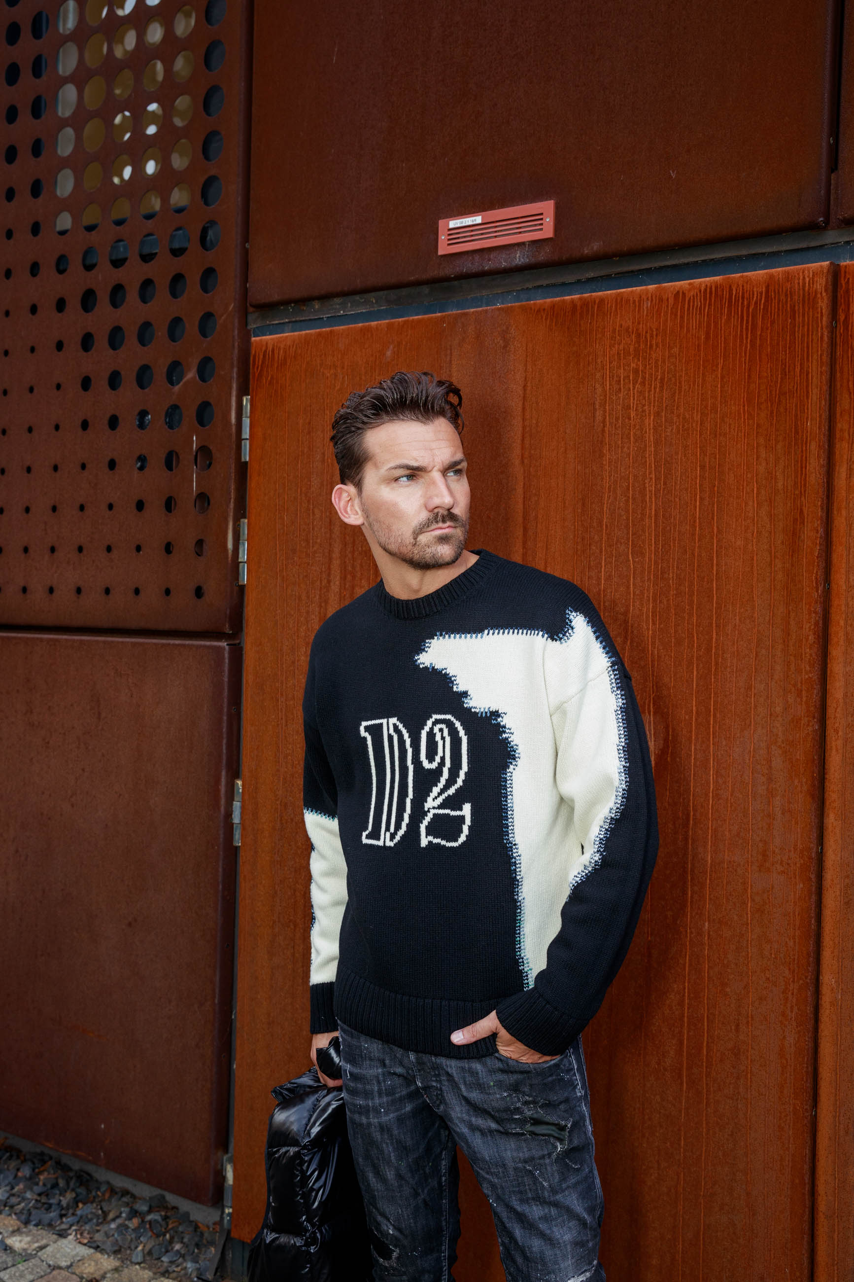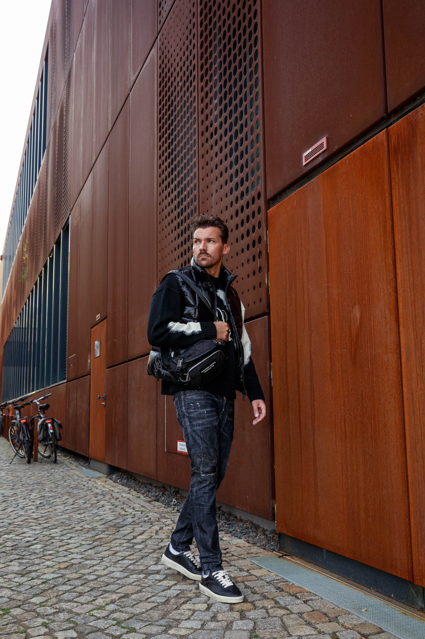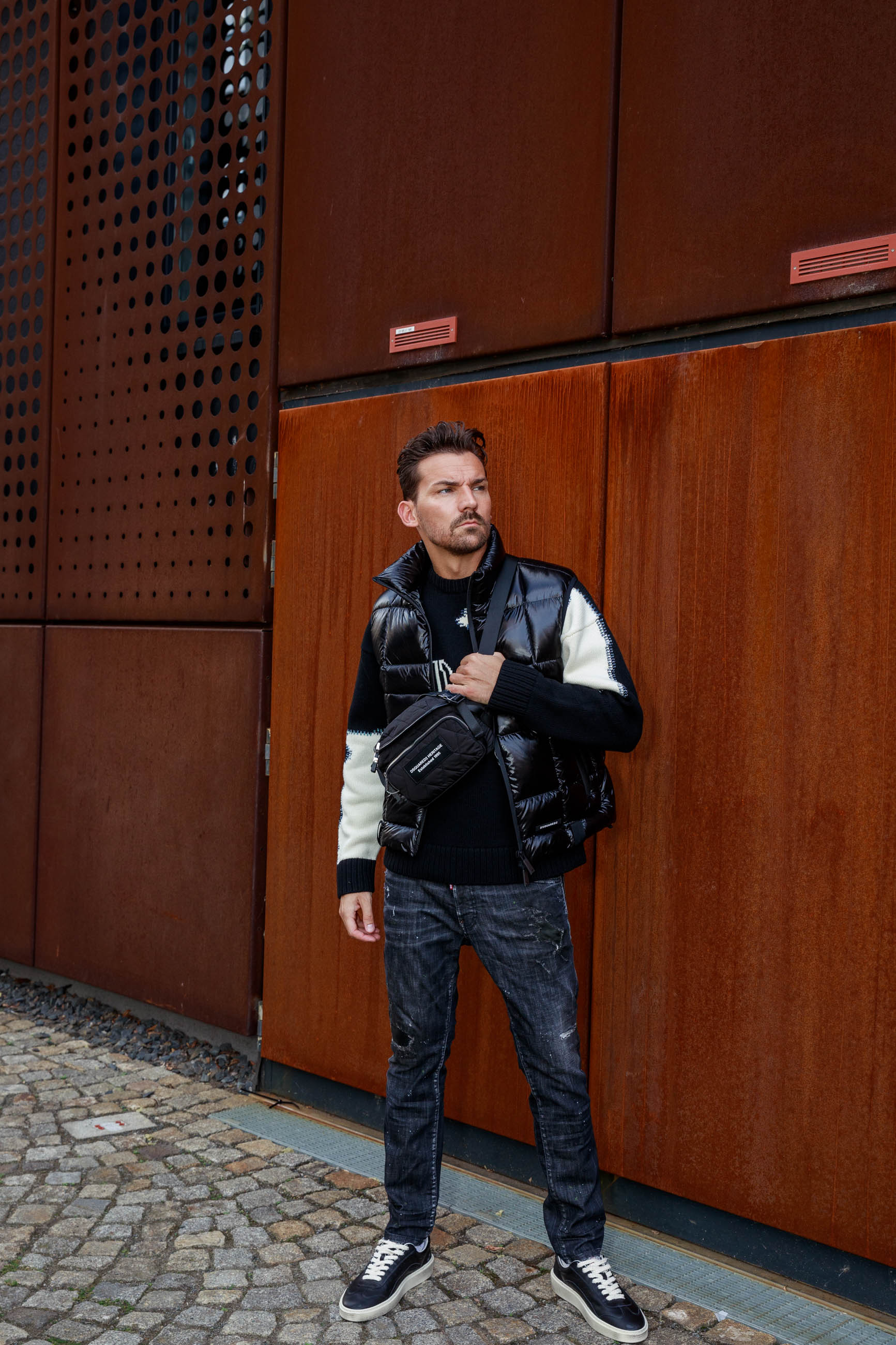 Markant und urban: Dieser DSQUARED2-Look kombiniert einen Woll-Pullover mit Fake-Stitch und markantem D2-Logo mit einer schwarzen Stepp-Weste aus glänzendem Nylon und Daunenfüllung. Destroyed Jeans sorgen für lässige Coolness, während schwarze Leder-Sneaker und die gesteppten Nylon-Gürteltasche das Outfit stylisch abrunden. Perfekt für selbstbewusste Freizeit-Momente mit Premium-Charakter.