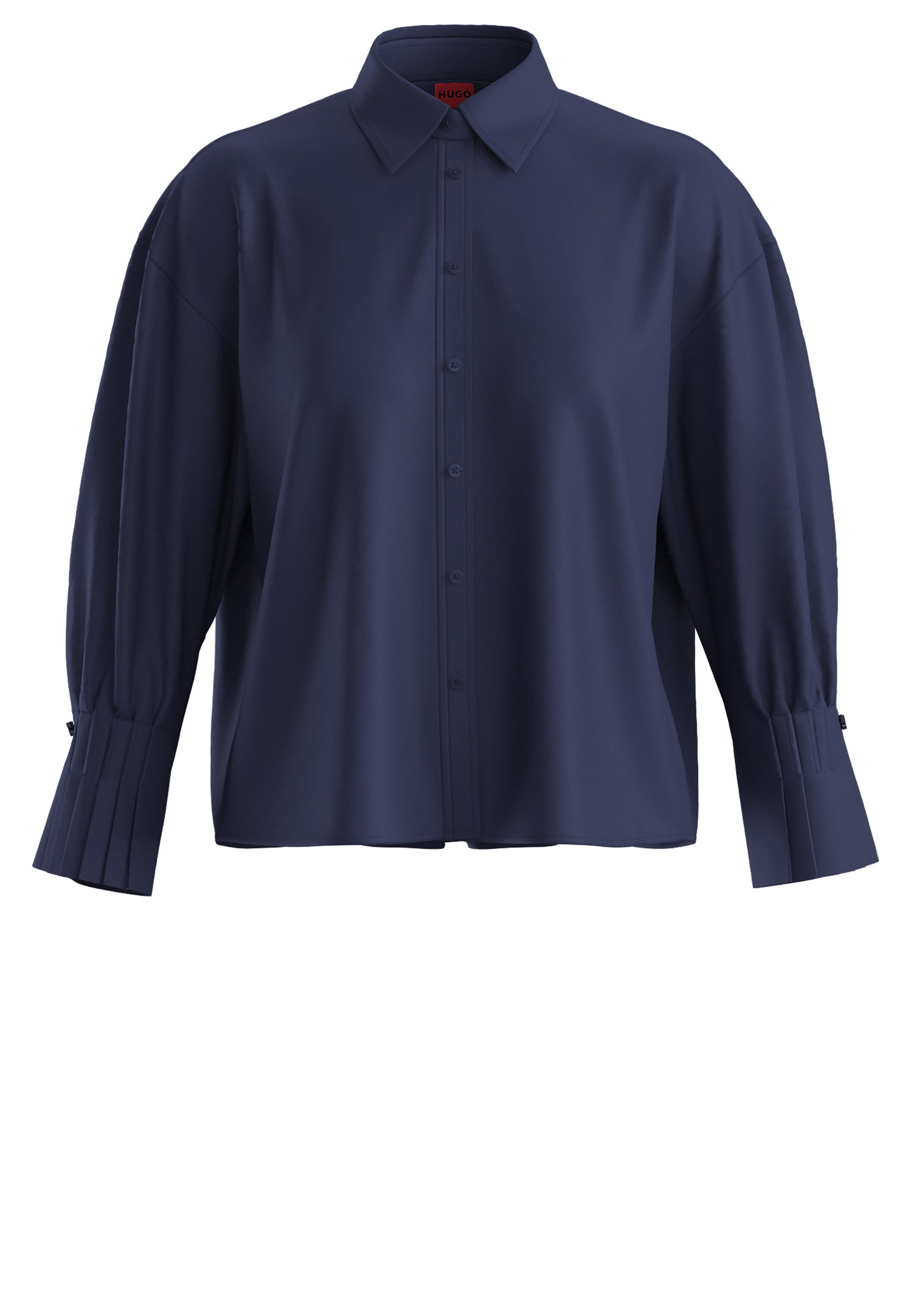 Die Damen Hemdbluse von HUGO, Modell 'Eggy', zeichnet sich durch ihre klassische Regular-Fit Passform aus und sorgt so für ein angenehmes Tragegefühl im Alltag. Gefertigt aus glatter Popeline im Baumwoll-Mix, liegt sie leicht auf der Haut. Dezente Raffungen am Armabschluss setzen einen feinen Akzent und unterstreichen die schlichte Optik.